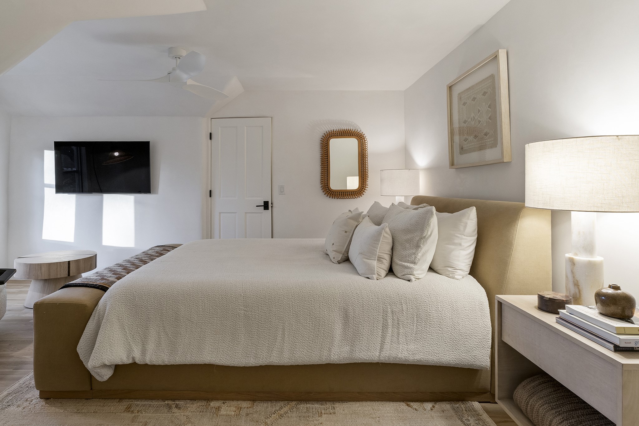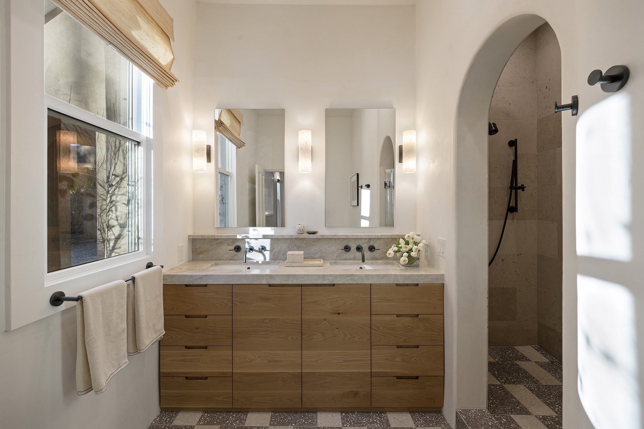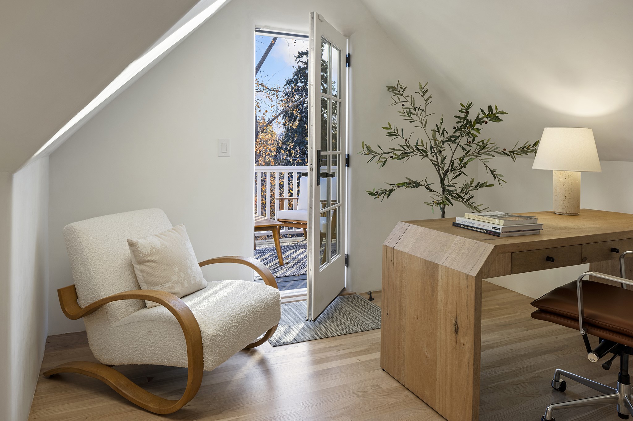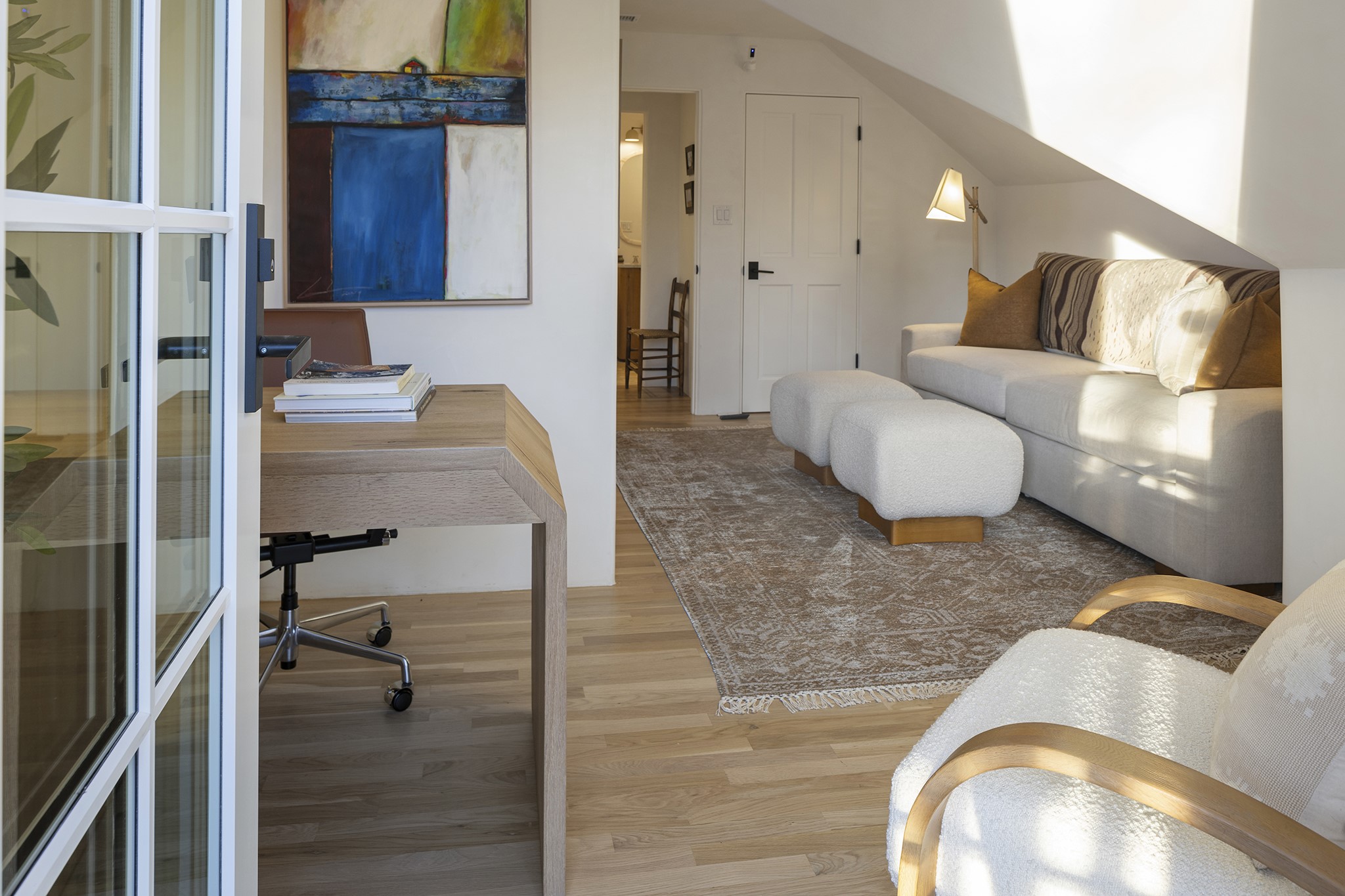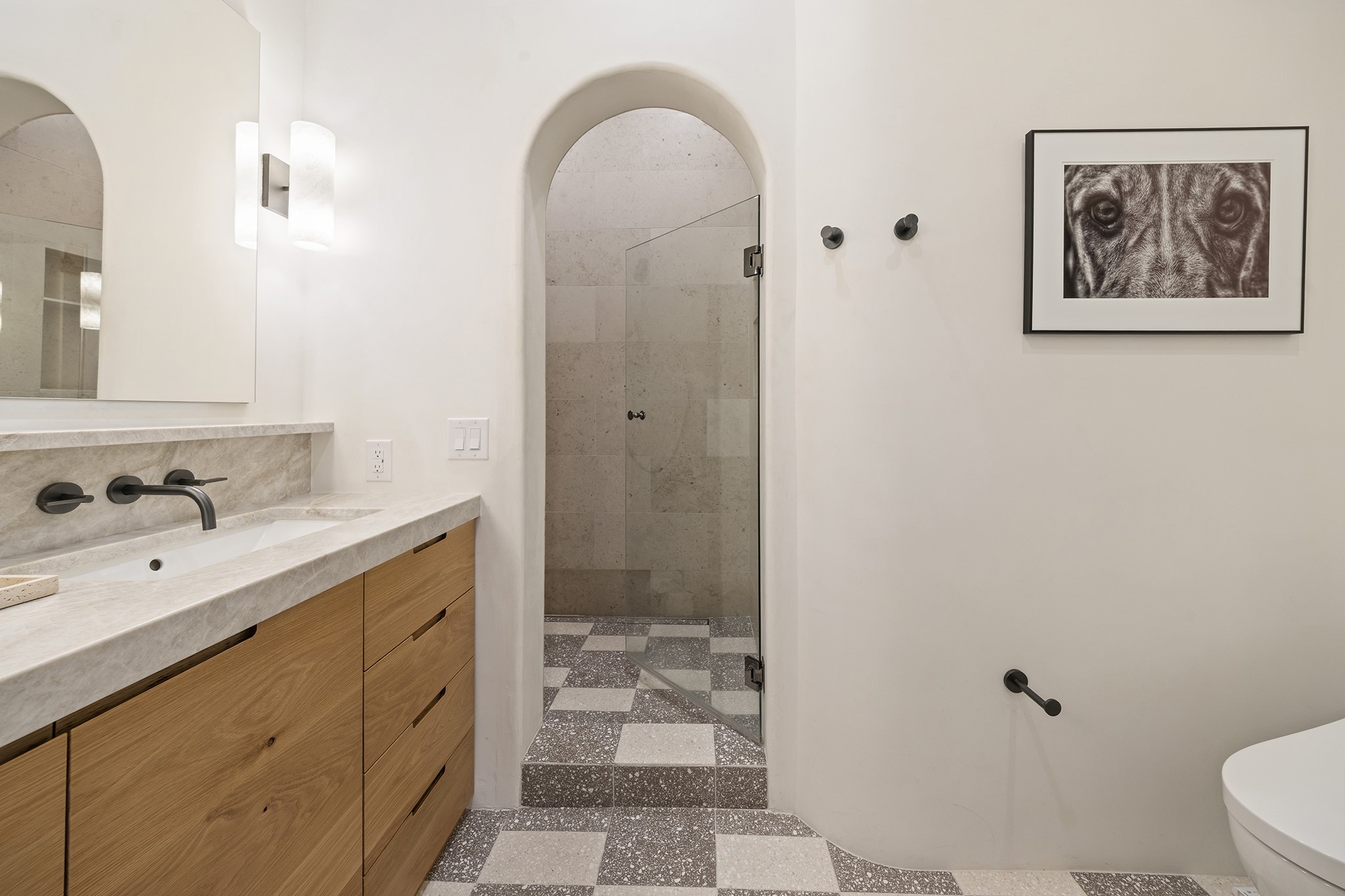 Just moments from Santa Fe's historic Plaza and Canyon Road, this 3 bedroom, 2 bath home embodies refined Southwestern elegance. Masterfully reimagined by Bergman Vass Interiors, it blends contemporary sophistication with the warmth of Santa Fe's timeless style. Every detail reflects exceptional craftsmanship with no surface left untouched! New energy-efficient windows and custom glass doors bathe rich hardwood floors in natural light. Recessed lighting highlights the home's architectural beauty, while landscaped gardens, an upstairs deck and flagstone patios create a serene outdoor retreat. A hand-forged gate, custom fireplace screen, and luxurious closets complete this remarkable residence.