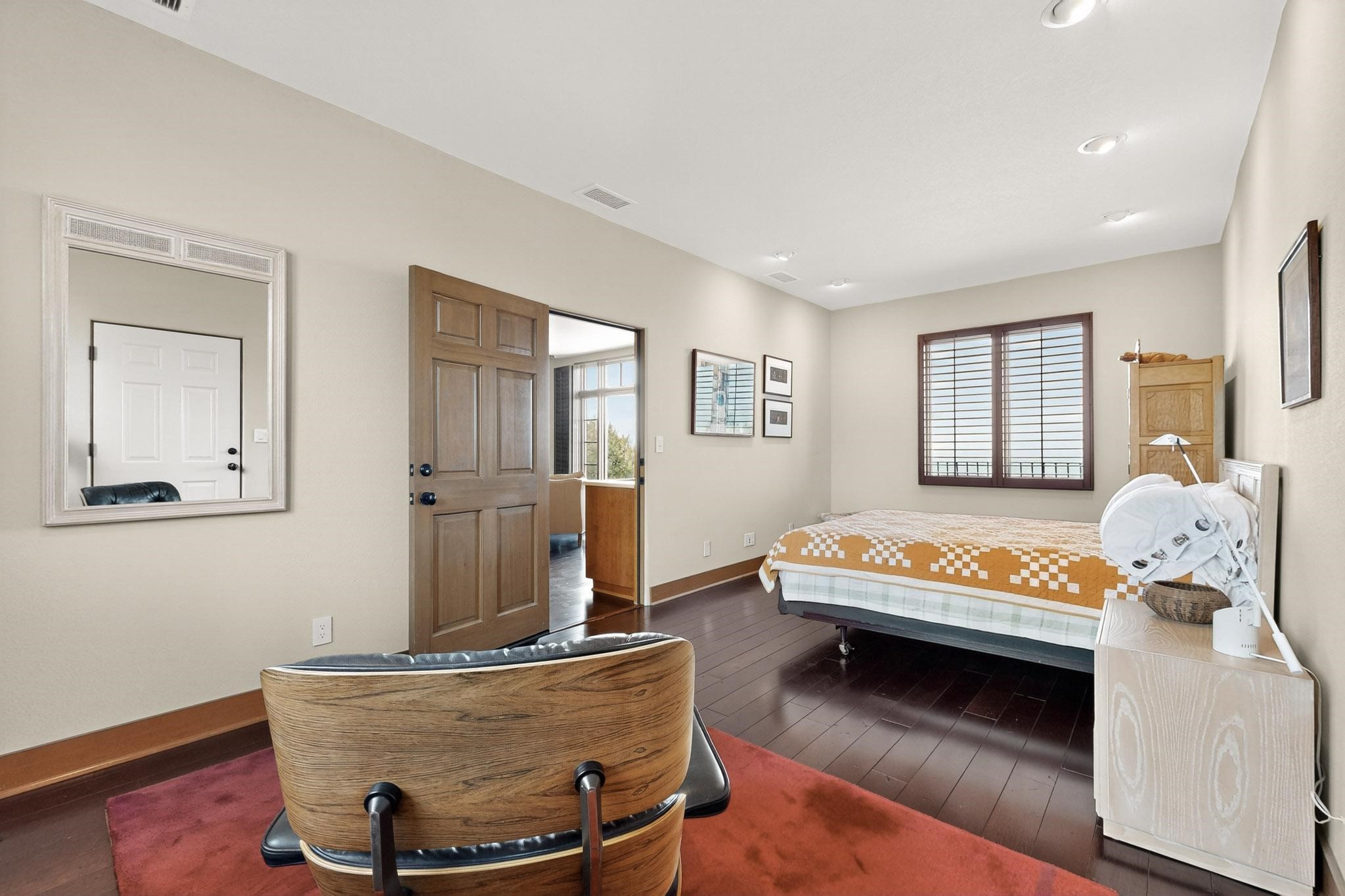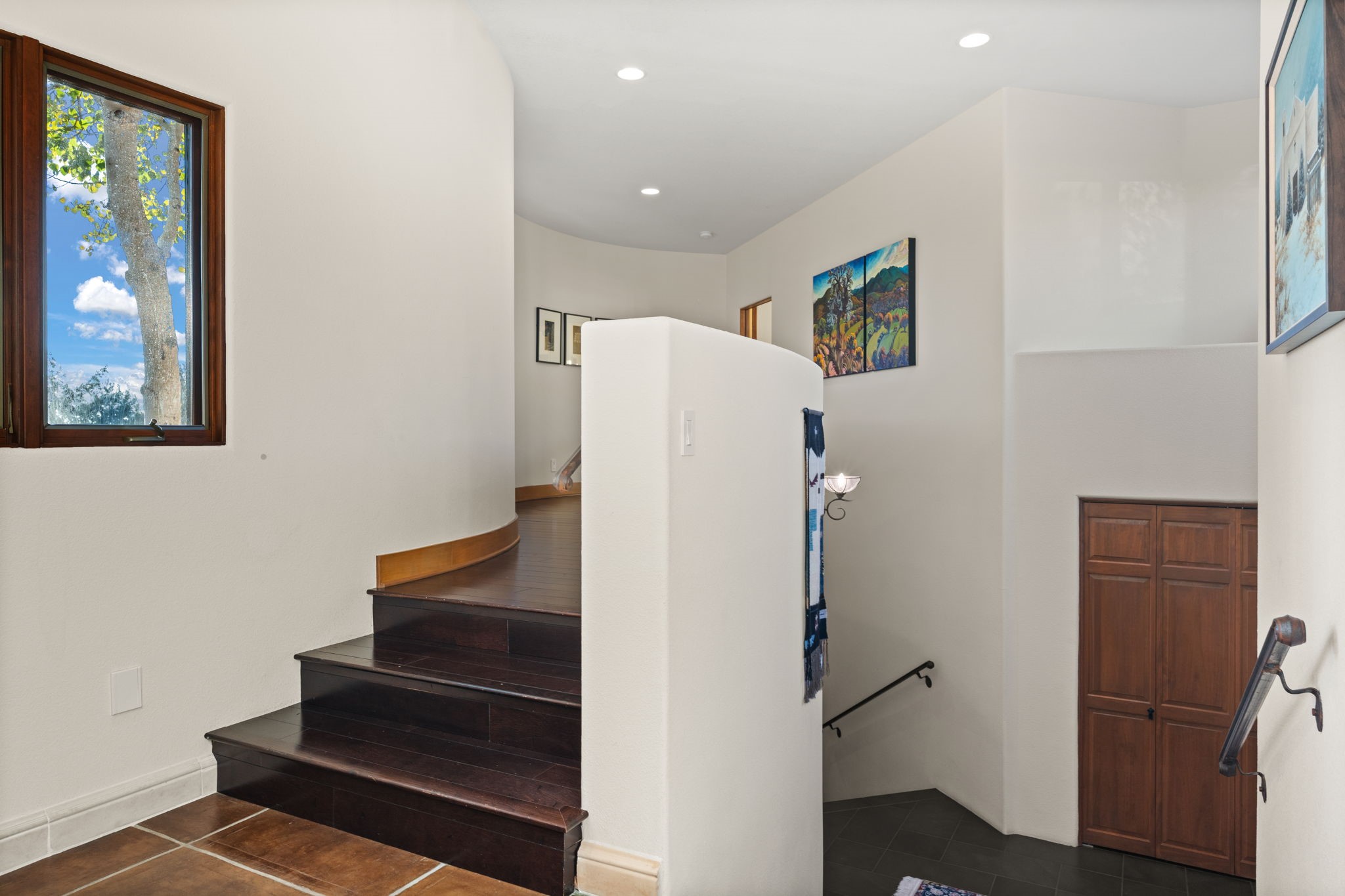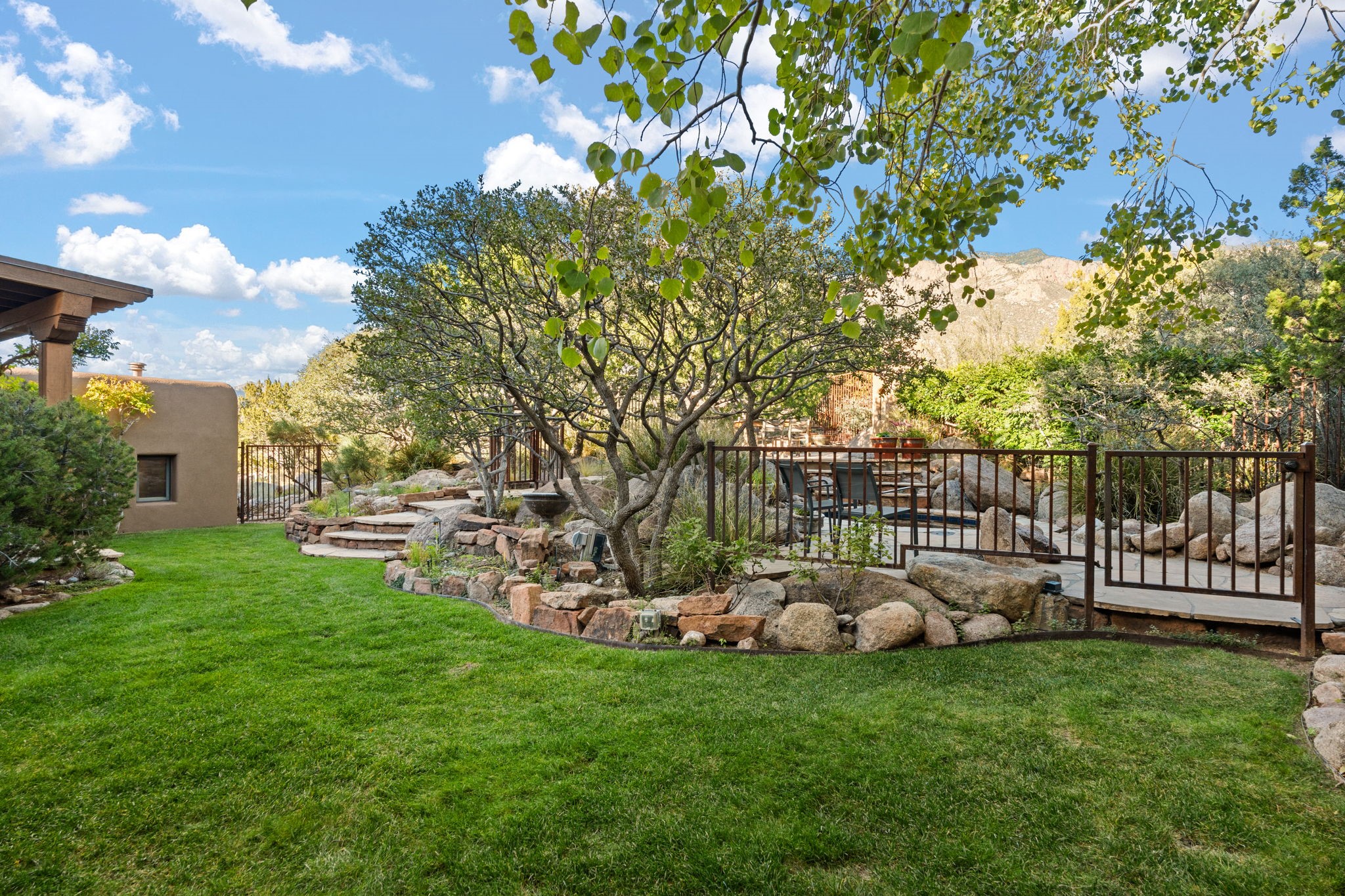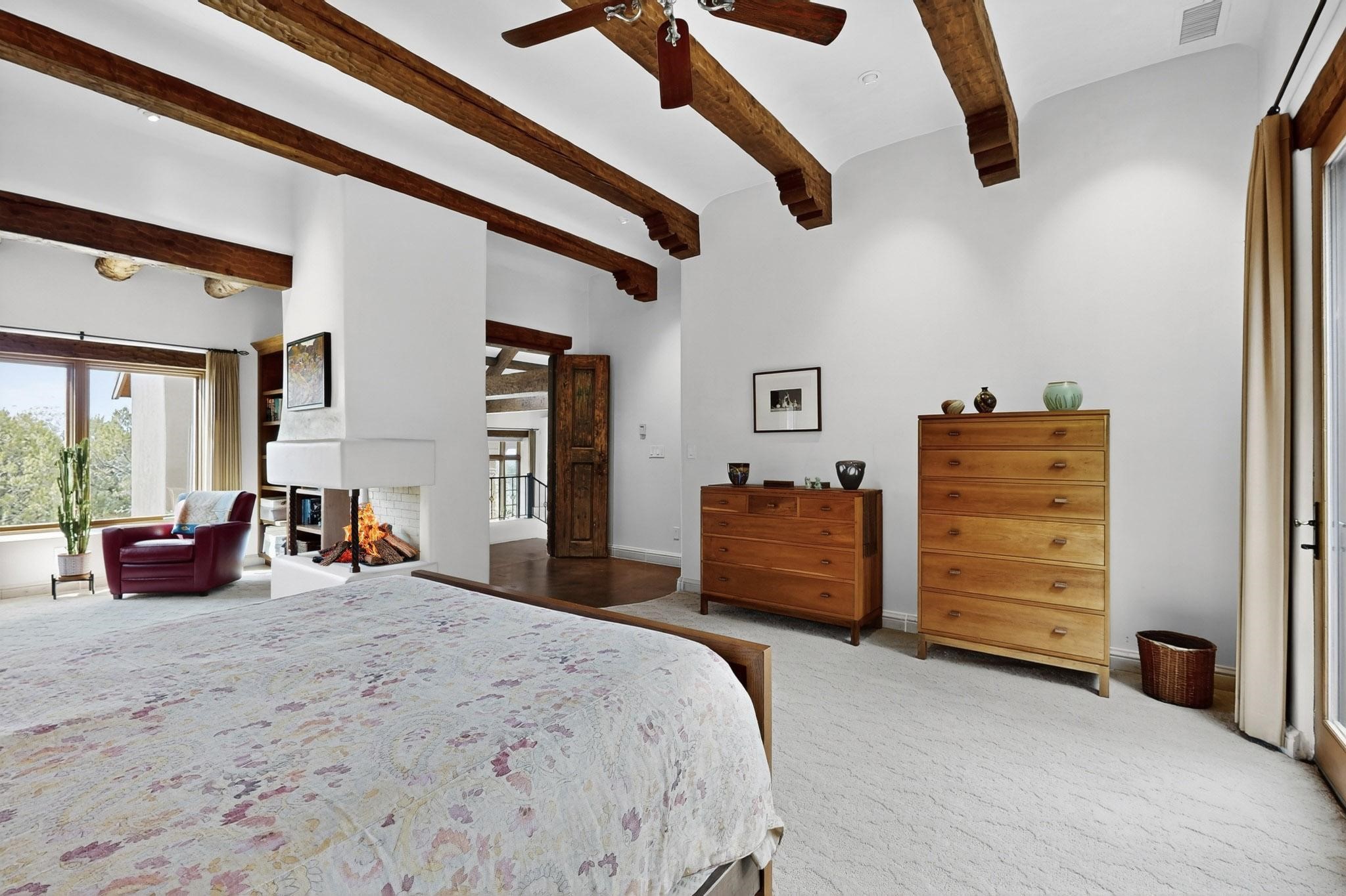 With vistas of the Sandia Mountains and city lights, this spacious 5,513 sq. ft. Sandia Heights estate is a rare blend of artistry, craftsmanship, and luxury. Upon entering the front door, the spacious living area introduces the understated beauty of this special home with hand-crafted details, deep sandstone sills, and a beautiful wood-burning fireplace. Features such as expansive chip-carved beams, custom doors, and diamond plaster walls provide warmth and refinement. Expansive windows frame breathtaking views and bath the house with natural light, magically merging the outdoor and indoor spaces. The kitchen is a chef's dream with a Sub-Zero refrigerator and freezer, Viking Professional 6-burner stove with griddle, and a butler's pantry complete with a Sub-Zero wine and beverage coolerTogether with the eating nook, kiva fireplace seating area, and formal dining room the kitchen area is perfect for evenings with family or elegant entertaining. The primary suite is a true sanctuary featuring a coved ceiling with exposed beams and corbels, a gas log fireplace, and a cozy seating area with latilla ceiling and built-in bookcases. The adjoining spa-inspired bath has it all - a steam shower, dual shower heads, travertine seating, a skylight over the garden jetted tub, and a private yoga and meditation room. Additional living spaces include a home office attached to a secondary living room and multiple generous ensuite bedrooms. The private backyard feels like a Zen oasis under New Mexico skies with a tiered garden, in-ground spa, outdoor fireplace, and covered patio. Modern comforts abound with in-floor hot water radiant heat, large 3-car garage, abundant storage, central vacuum, built-in speakers, new stucco and septic in 2025! This could be your ABQ Dream Home!