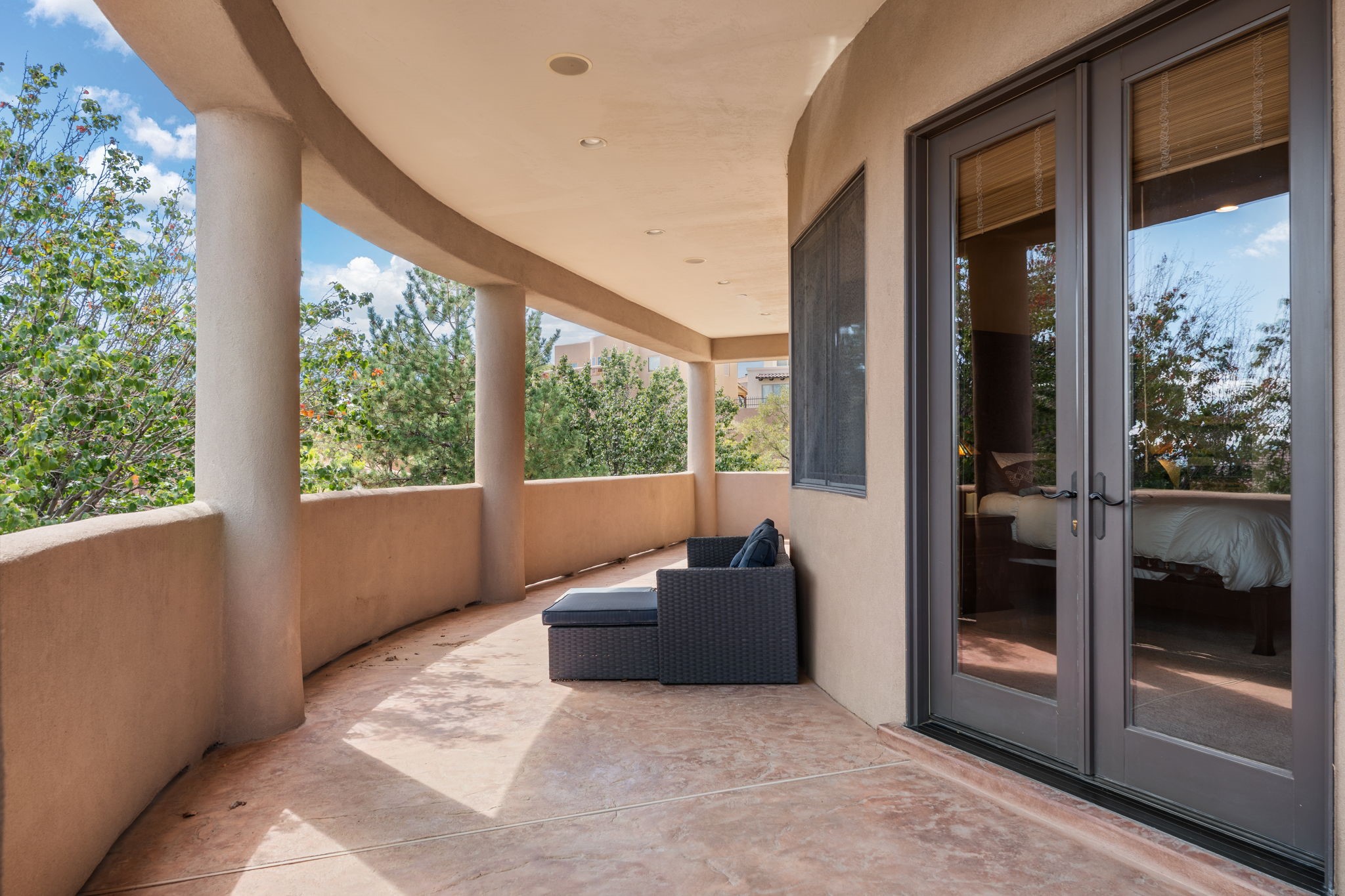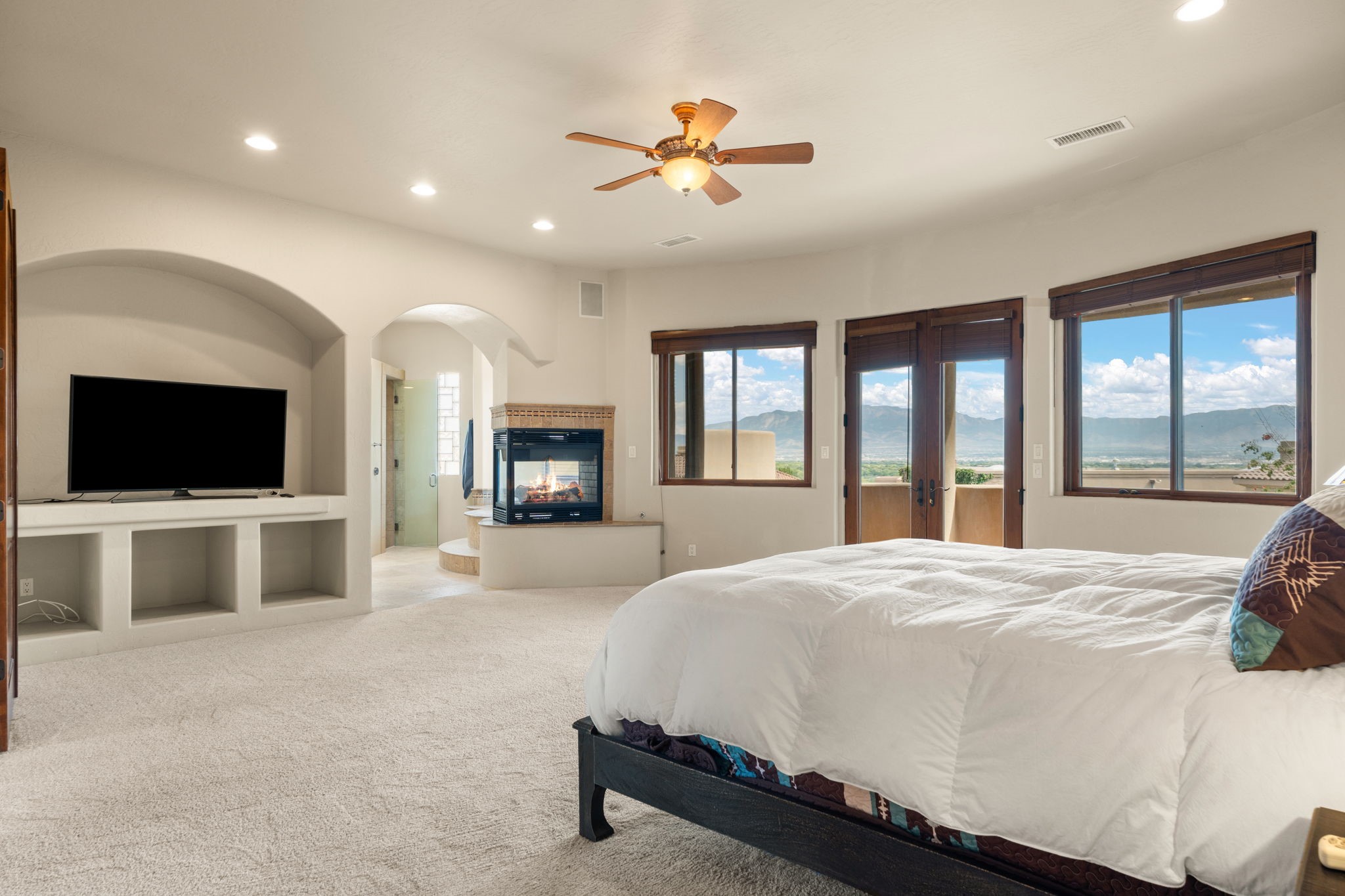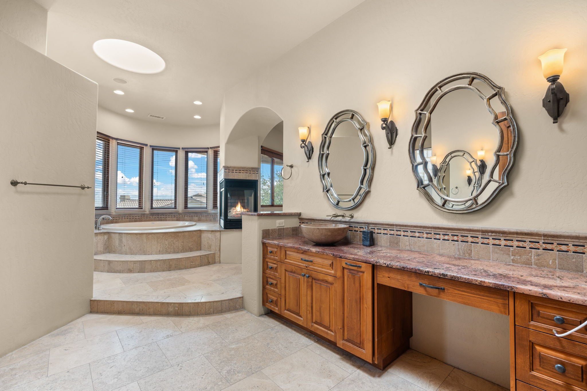 Experience luxury living at its finest in this 5,235 sq. ft. custom masterpiece perfectly situated on a cul-de-sac within an exclusive gated community. This exceptional home features 4 spacious bedrooms, 3 full baths, 2 half baths, an elegant office with its own fireplace, a private movie theater room, and a versatile game room/loft--offering the ultimate in comfort and entertainment. Impeccable craftsmanship is showcased throughout with travertine tile flooring, viga beam ceilings, intricate tile accents, and artful lighted niches. The gourmet kitchen is a chef's dream, boasting granite counters, Wolf and Sub-Zero appliances, a pot filler, warming drawer, and dual dishwashers--perfectly designed for both everyday living and lavish entertaining.The owner's suite is a serene retreat featuring a private sitting area with a two-way fireplace, balcony access to take in breathtaking mountain and city views, and a spa-inspired bath with steam shower and jetted tub. Enjoy five fireplaces placed throughout the home, creating warmth and ambiance in every gathering space.Additional features include in-floor radiant heat, three air conditioning units for year-round comfort, and timeless architectural detail that blends elegance with Southwestern charm. Every element of this home was designed to impress, extraordinary residence that offers sophistication, privacy, and panoramic views in one of the area's most desirable gated enclaves.