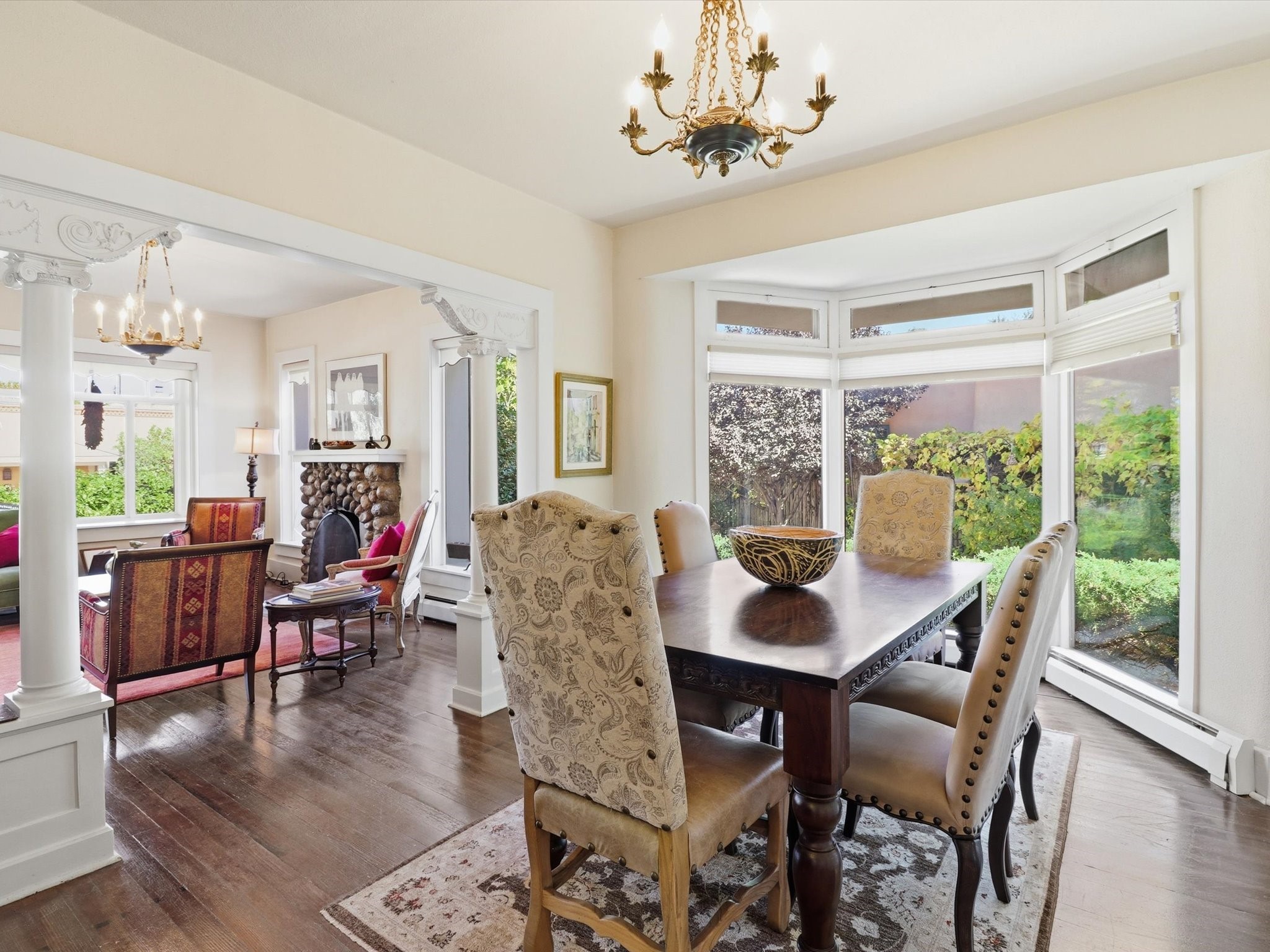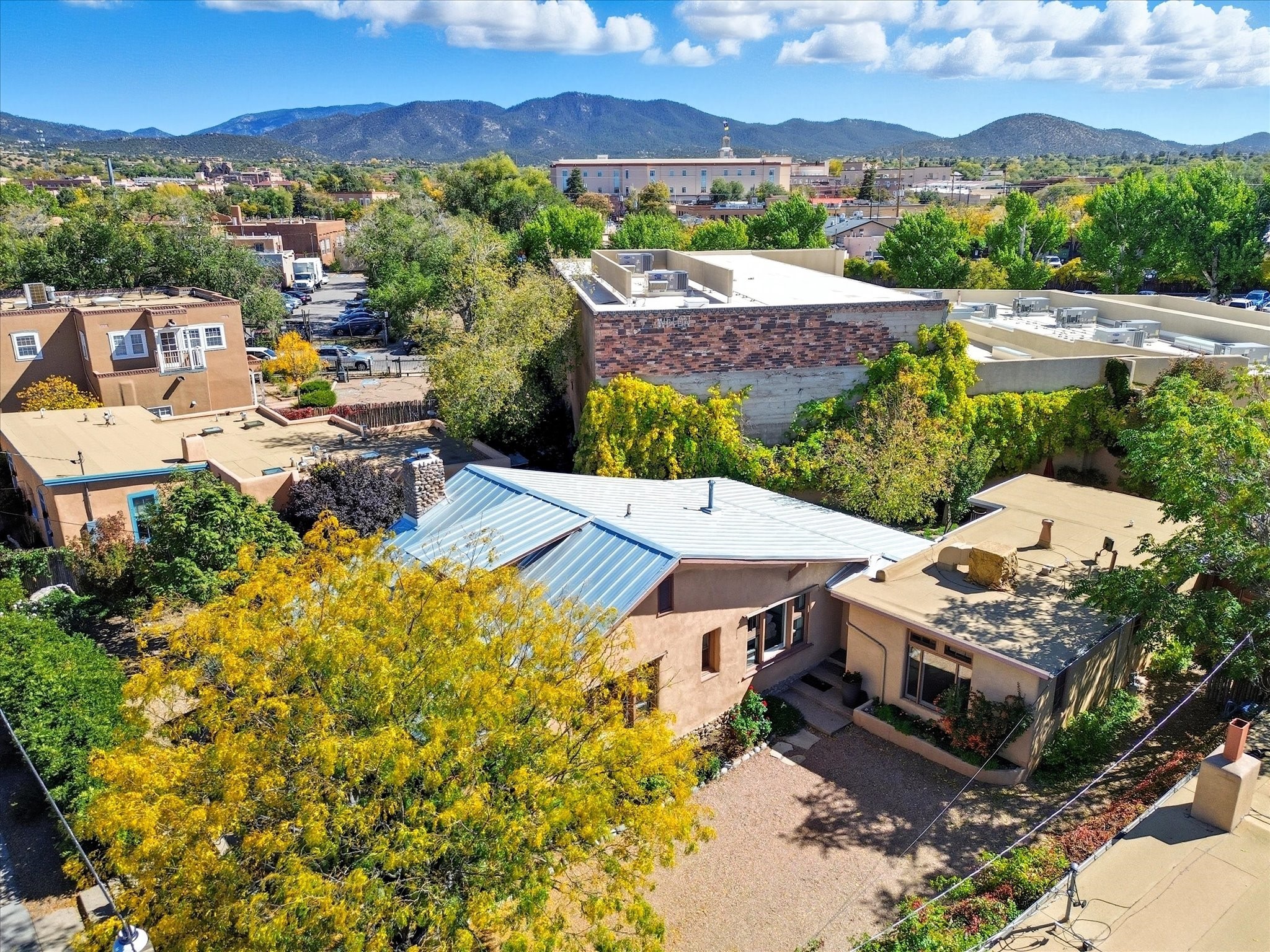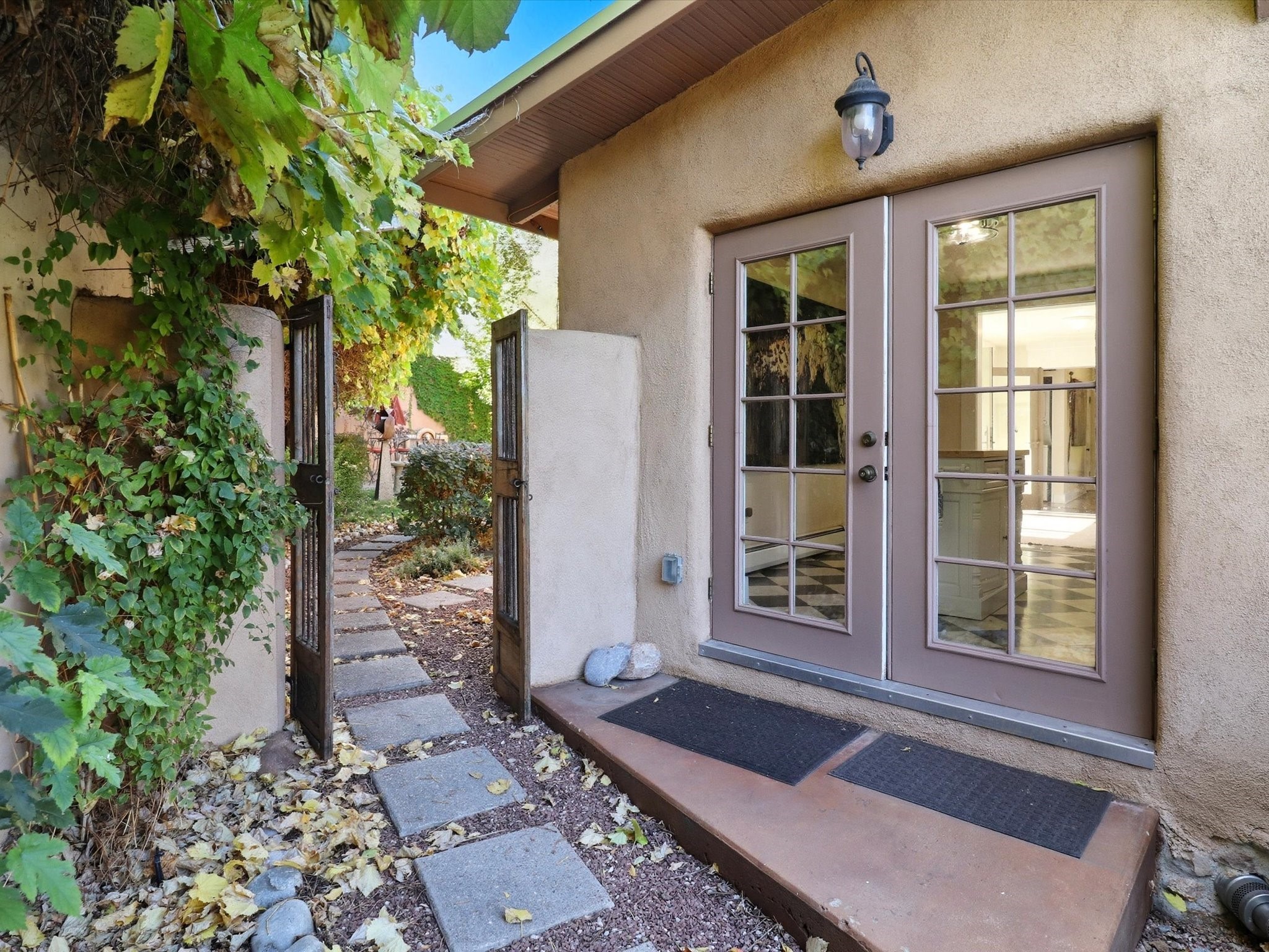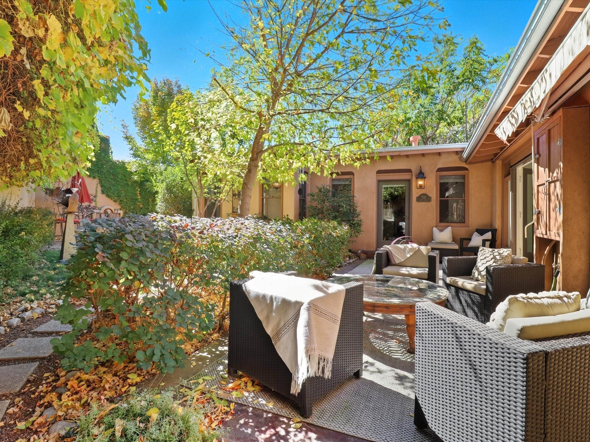 One of Santa Fe's most desirable locations. This historically 'contributing' home on East Agua Fria is a light-filled jewel, perfectly situated to enjoy all the vibrancy of Santa Fe's Railyard District and Santa Fe's Downtown. Imagine being just blocks away from world-class art galleries, dining, shopping, movie theaters, and music. The Santa Fe Farmers Market, a beloved community hub, is just a few blocks to the south. This charming 1900 Craftsman Bungalow home offers four bedrooms, 2 baths, many thoughtful upgrades, double adobe construction with exterior stone base pillars, creating a timeless, inviting and quiet home. A gracious interior - original stenciled fir floors, bay windows, gorgeous antique lighting fixtures, a crisp black and white kitchen. Additionally, this property offers an attractive flexibility with two distinct areas, each featuring separate entrances and sitting areas providing excellent options for guests or potential rental income. The home boasts a charming, deep Craftsman-style porch, perfect for relaxing and enjoying the neighborhood. The current owners have meticulously cultivated romantic garden areas over many years, showcasing roses, wisteria, daylilies, and climbing vines, maintained by an automatic drip system. The large rear patio serves as an urban sanctuary, ideal for entertaining or simply unwinding. Further enhancing convenience and livability are the unusually generous gated off-street parking in the front, a single-story design and a 200-square-foot storage area in the rear. Come see and be captivated! Neither Listing Brokers nor Seller warrants the square footage of the home or lot. If the size of the home or lot is of material consideration to the Buyer, then the Buyer should have them measured. Tax Levy is from the Assessor website. All fires depicted are photo-shopped. Buyer to verify the functionality of the fireplace.