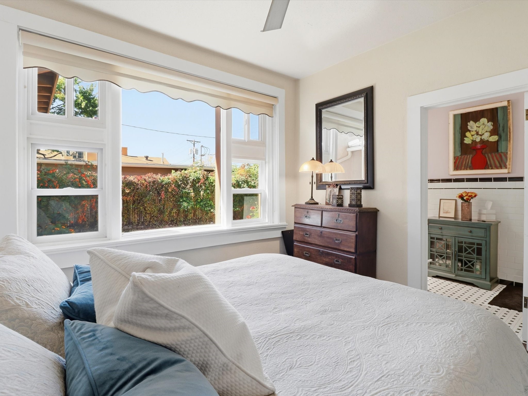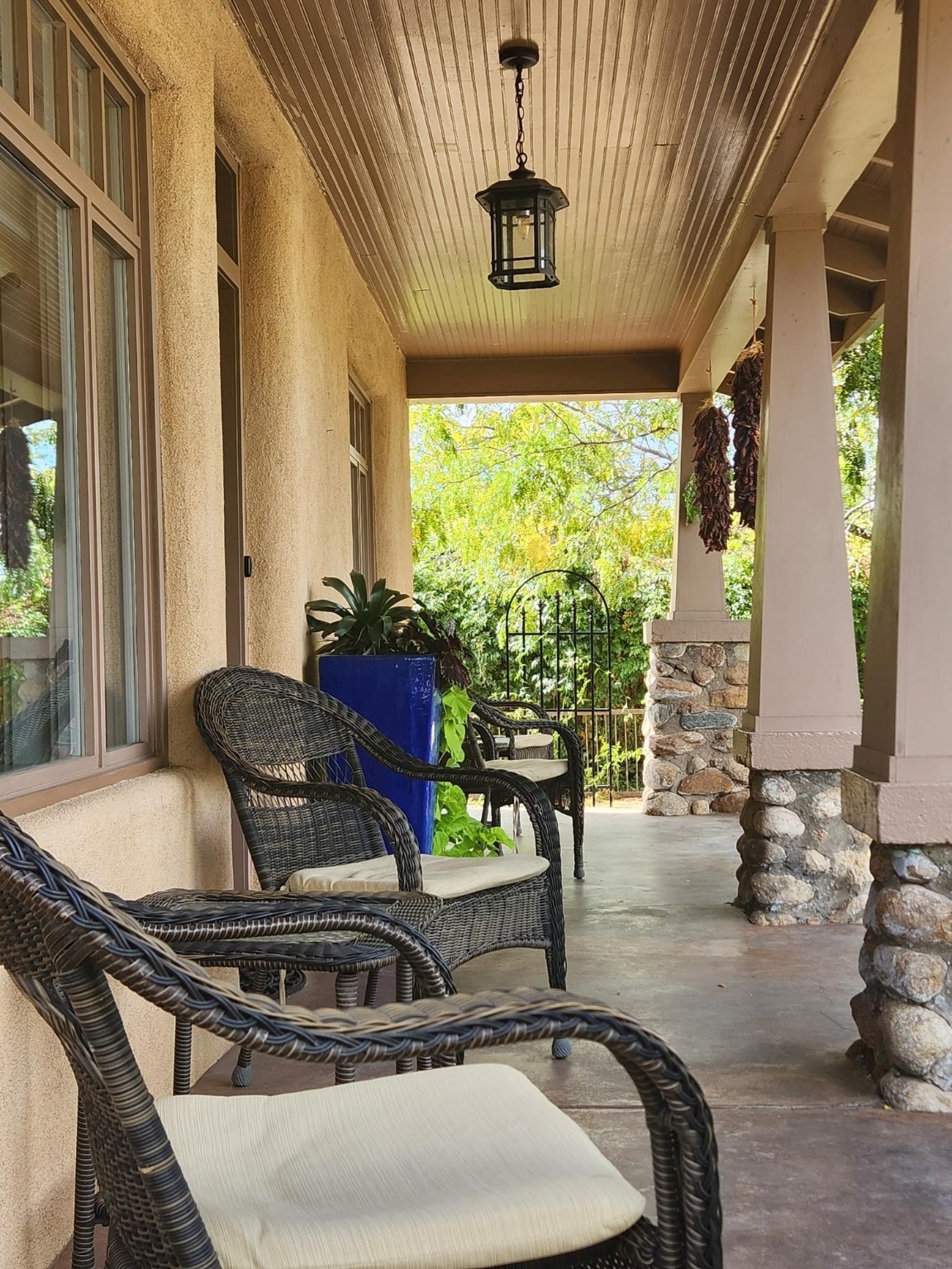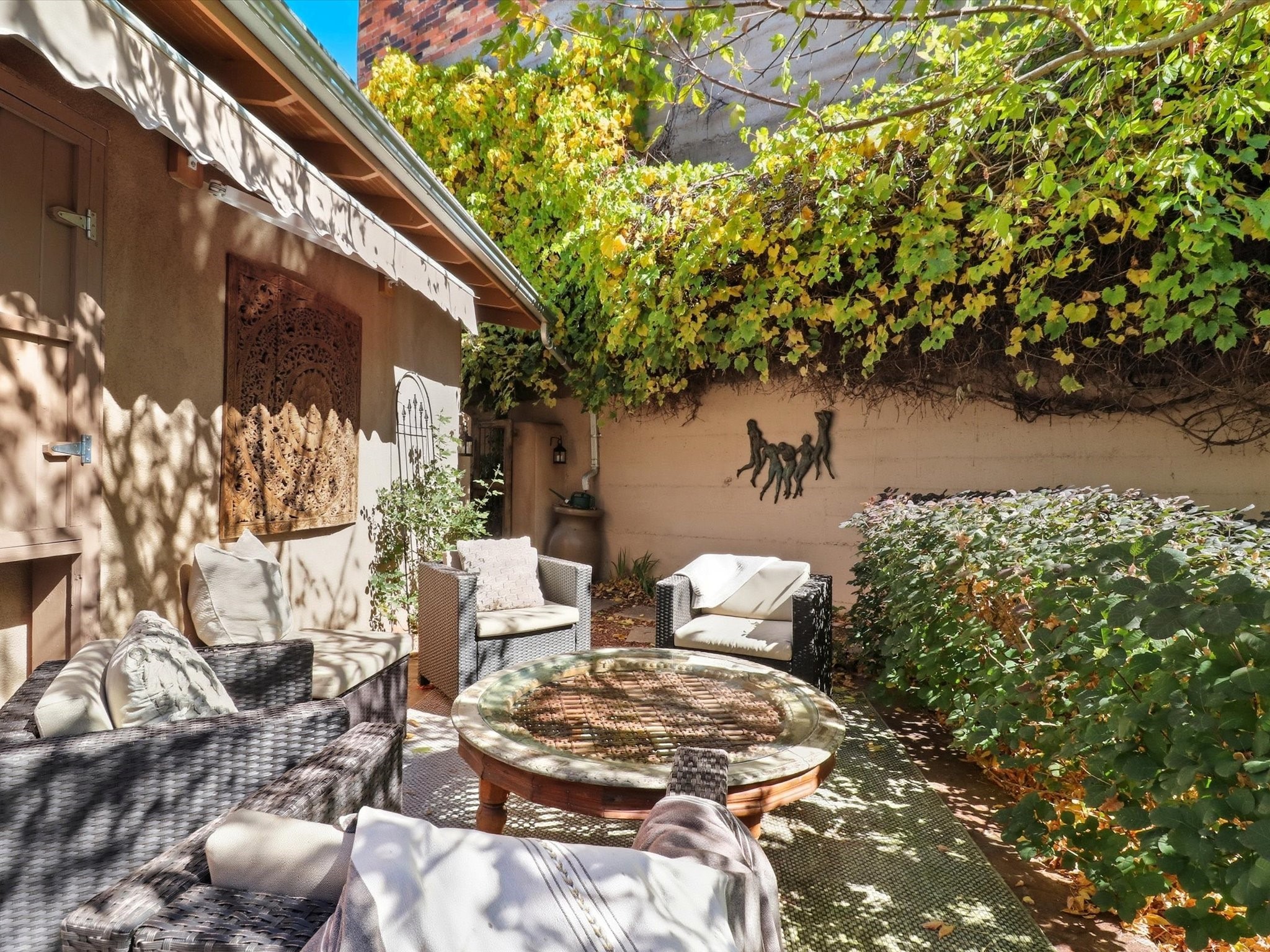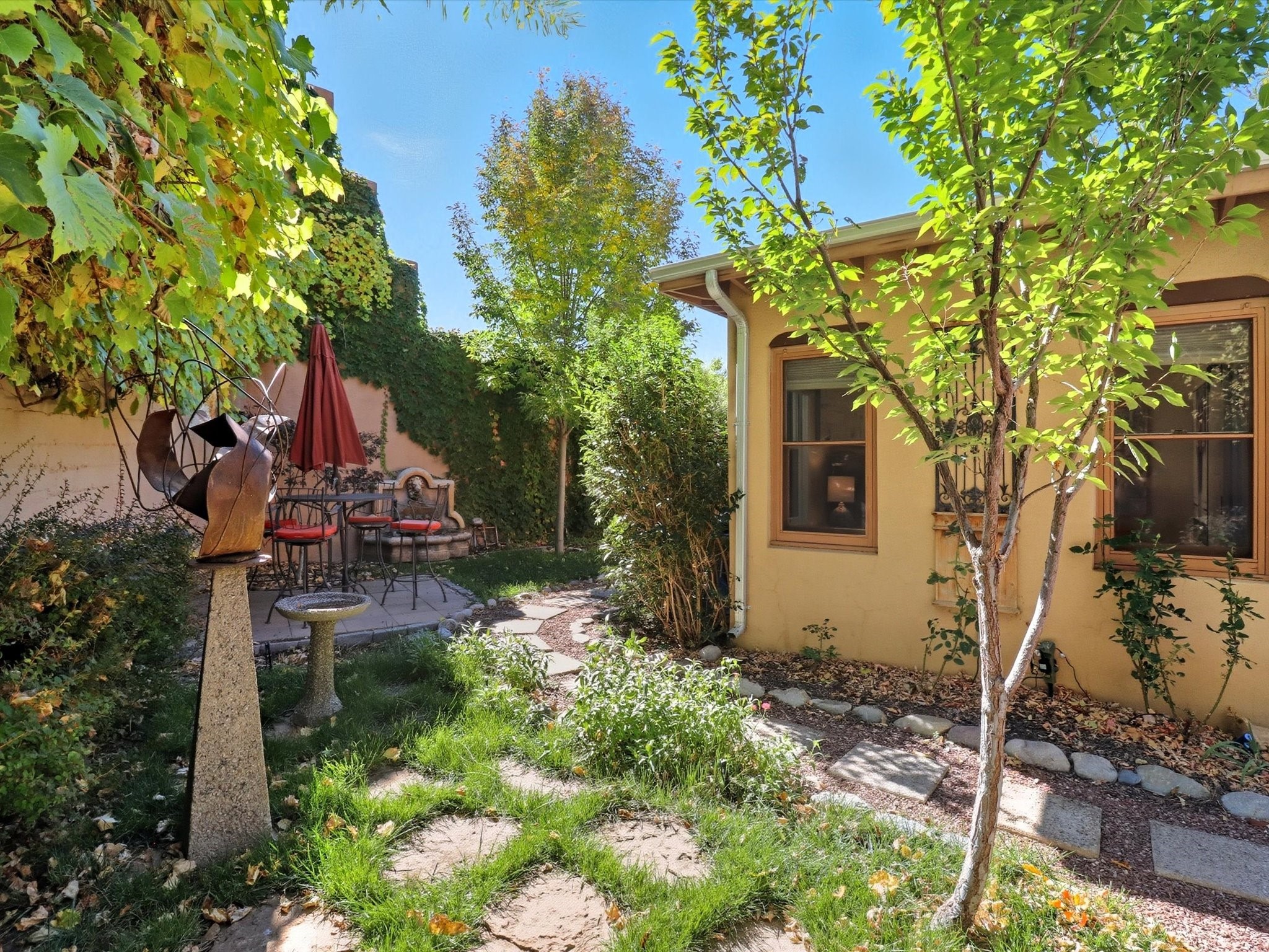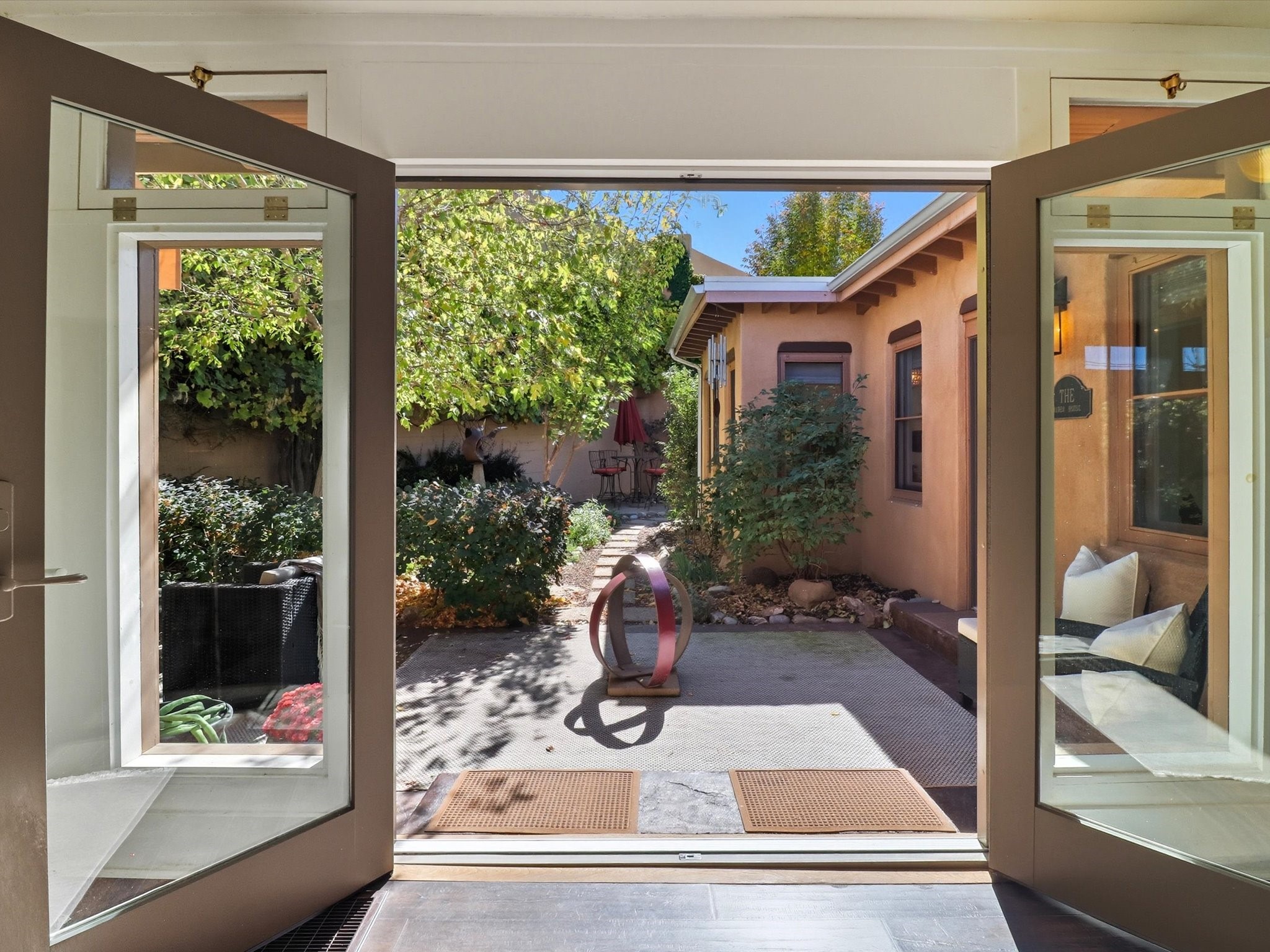 One of Santa Fe's most desirable locations. This historically 'contributing' home on East Agua Fria is a light-filled jewel, perfectly situated to enjoy all the vibrancy of Santa Fe's Railyard District and Santa Fe's Downtown. Imagine being just blocks away from world-class art galleries, dining, shopping, movie theaters, and music. The Santa Fe Farmers Market, a beloved community hub, is just a few blocks to the south. This charming 1900 Craftsman Bungalow home offers four bedrooms, 2 baths, many thoughtful upgrades, double adobe construction with exterior stone base pillars, creating a timeless, inviting and quiet home. A gracious interior - original stenciled fir floors, bay windows, gorgeous antique lighting fixtures, a crisp black and white kitchen. Additionally, this property offers an attractive flexibility with two distinct areas, each featuring separate entrances and sitting areas providing excellent options for guests or potential rental income. The home boasts a charming, deep Craftsman-style porch, perfect for relaxing and enjoying the neighborhood. The current owners have meticulously cultivated romantic garden areas over many years, showcasing roses, wisteria, daylilies, and climbing vines, maintained by an automatic drip system. The large rear patio serves as an urban sanctuary, ideal for entertaining or simply unwinding. Further enhancing convenience and livability are the unusually generous gated off-street parking in the front, a single-story design and a 200-square-foot storage area in the rear. Come see and be captivated! Neither Listing Brokers nor Seller warrants the square footage of the home or lot. If the size of the home or lot is of material consideration to the Buyer, then the Buyer should have them measured. Tax Levy is from the Assessor website. All fires depicted are photo-shopped. Buyer to verify the functionality of the fireplace.