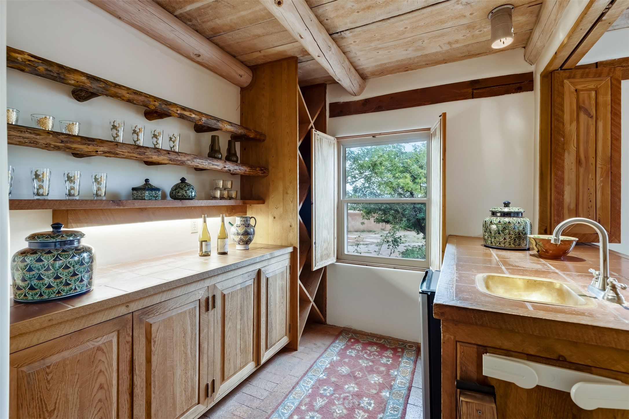 In the quaint village of Galisteo lies this gracious and majestic home with adjoining 5 acre lot, for a total of 10 acres, known as 'Hacienda del Sol." One hundred years ago was the site of the Old Galisteo School House. The original 1886 bell and corner stone 1938 were placed within the walls of this present day home. Built atop of a gentle hill with stunning views of the Galisteo Basin, Sangre de Cristos and Jemez Mountains along with huge white puffy cloud formations in a brilliant blue sky greet you everyday. Large rooms with cathedral ceilings flooded with light, sculptured fireplaces, oak and pine floors with 10 foot elegantly carved doors delight the eye upon entering. Screened in, is a lovely outdoor patio with vast, distant views. A gallery hallway runs the length of the house craving art, paintings, photographs, memorabilia. A chef's kitchen with a six burner stove, center islands, prep sinks has everything one would want. An elegant dining room with arched walls, subtle lighting, and carved cabinets allow for many guests or small intimate settings. Three Bedroom suites each with fireplaces and luscious bathrooms are perfectly placed for privacy. An attached "casita" with kitchen and bath is off one of the wings of the home. Outside, there is a circular, walled patio area for summer gatherings and moon lit nights. Included in this fabulous property is a blue gate opening up to an adjoining 5 acre parcel of vacant land accessed off of Camino San Cristobal used for pleasure or as additional acreage for another home, studio, horses, and imagination. Dream on...