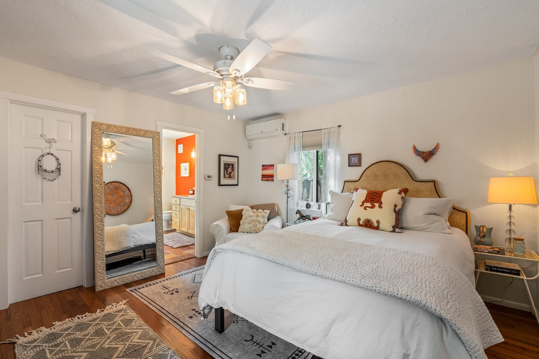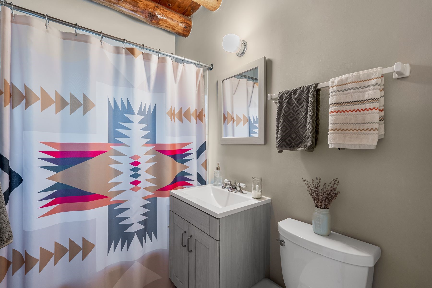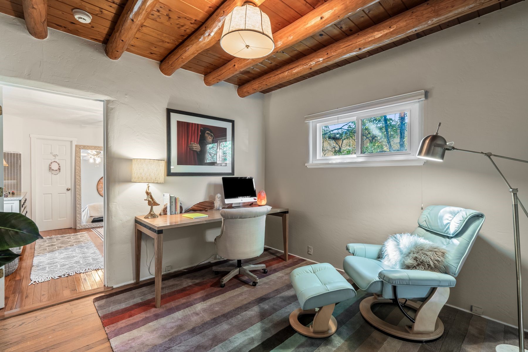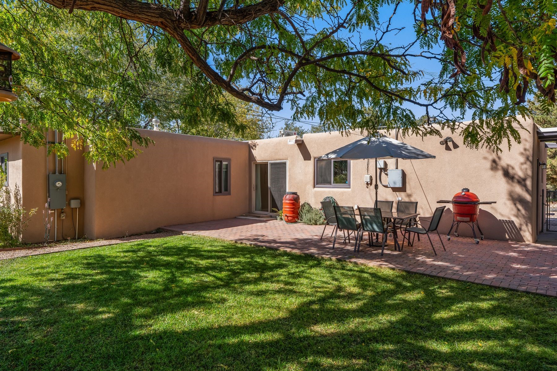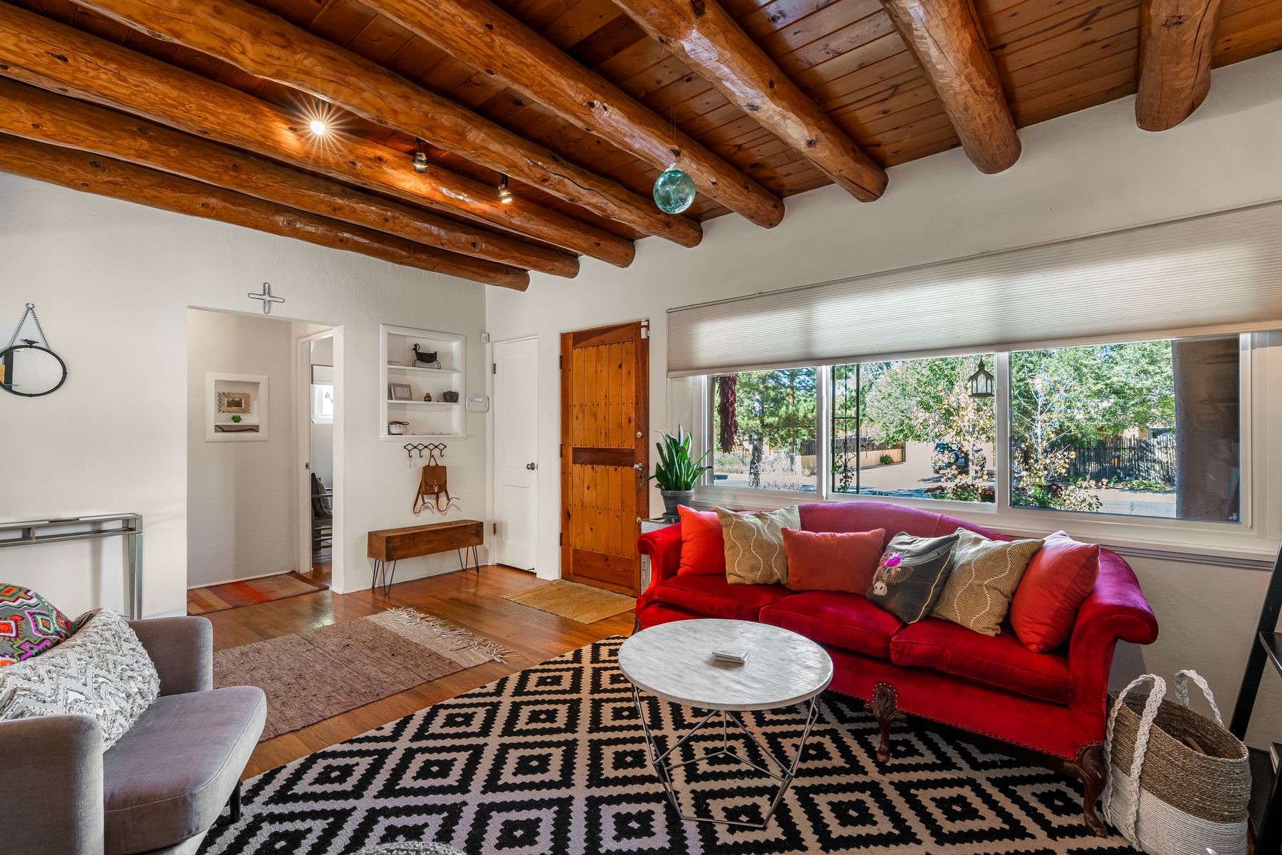 With much of its original design beautifully preserved, this Casa Alegre Stamm home radiates timeless Southwestern charm. Built in 1954, it showcases hallmark Stamm features - original hardwood floors, vigas, and handcrafted doors - while incorporating thoughtful modern updates for today's comfort and convenience. The inviting floor plan includes two bedrooms plus a versatile third room ideal for an office, den, or guest space, along with two bathrooms, a warm welcoming living room, a dedicated dining area, and an updated kitchen with tasteful finishes. The spacious primary suite offers an ensuite bath and walk-in closet. An attached one-car garage provides added functionality and storage options. Outdoors, a large brick patio opens to a fully enclosed yard featuring lush grass, mature shade trees, fruit trees, and a colorful array of perennials - perfect for entertaining, gardening, or simply relaxing in your own private oasis. Nestled on a quiet street in the heart of Casa Alegre, this home enjoys one of Santa Fe's most desirable and convenient locations. Residents can easily access Frenchy's Field, the River Trail, Ashbaugh Park, and the Acequia Trail, while being just a short drive from shops, restaurants, and other local amenities. With its ideal blend of character, modern livability, and prime location, this turnkey Santa Fe classic offers comfort, style, and connection to all "The City Different" has to offer.