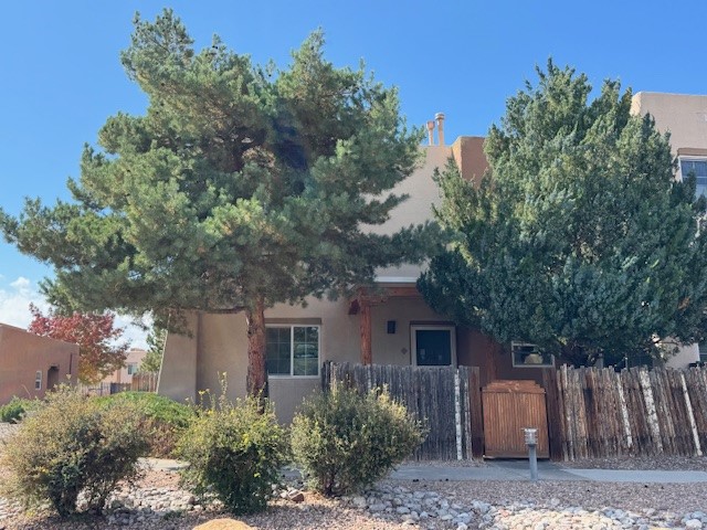 Rare corner two story town-home style found in Dos Santos! It has a beautiful treed courtyard offering privacy and lounging space any time of the year. Once inside you will find a two tiered wood burning fireplace accented with shelving and wood floors and light filtering shades. Inside the coat closet, a pantry has been created for all the extras. Beautifully remodeled stainless kitchen with high tech microwave and quartz countertops with updated tile. Upstairs you will find a newer washer dryer that leads to bedroom with magnificent views and functionally equipped with a walk in closet. Upstairs bath has been updated with an oversized walk in shower with vanity and flooring.
