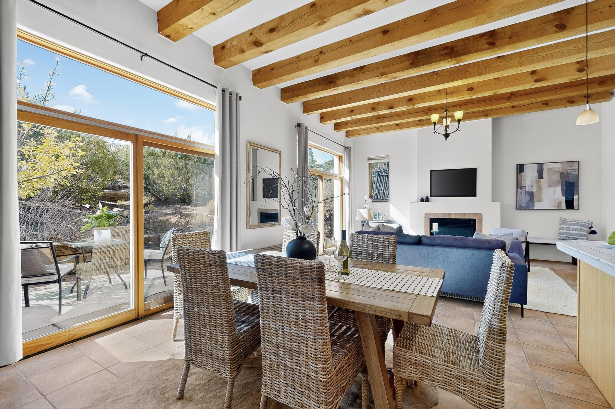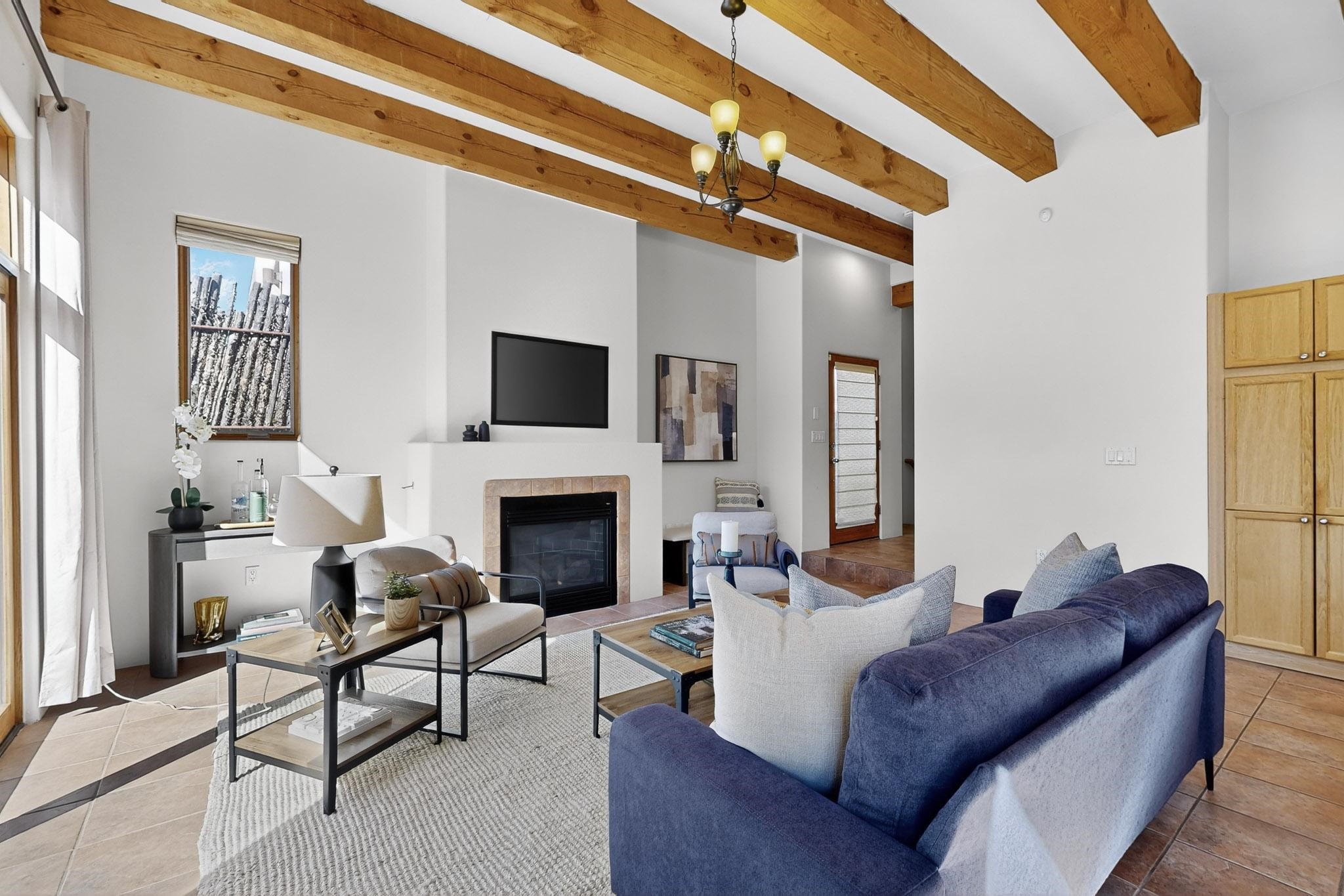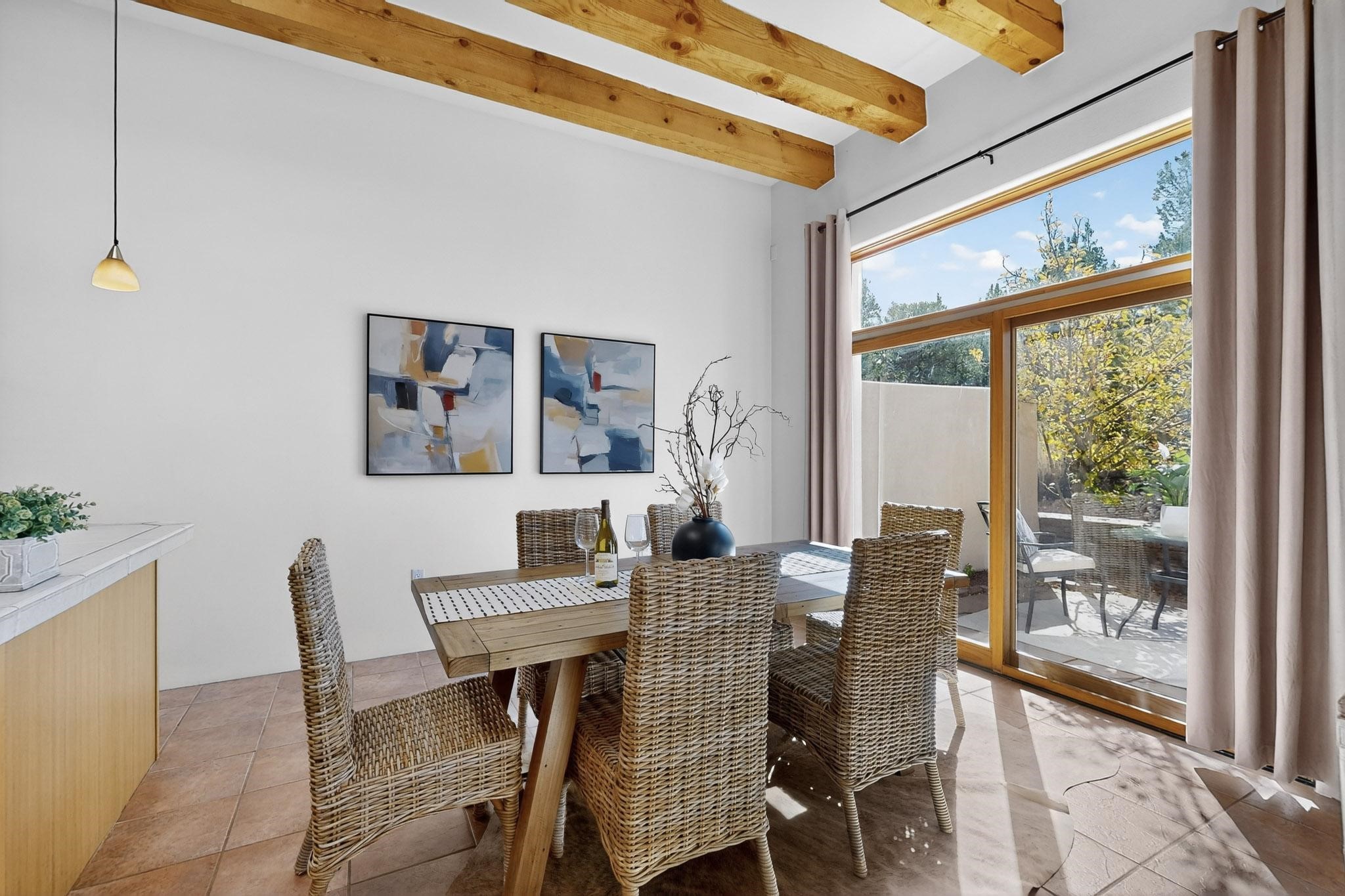 Lovely, light filled Condo conveniently located just a few minutes from the Plaza and Downtown with fabulous views of the Sangre de Cristo Mountains! The main floor consists of a high beamed ceiling open concept living room, dining room and kitchen, a cozy fireplace and direct access to a charming landscaped rear patio that looks out over protected, treed open space. A powder room is also situated on the main floor and a few steps up are the primary bedroom and bath as well as a guest bedroom with a private bath. Step out of the primary bedroom onto a private covered deck for wonderful mountain views to the North East. The home has an ample 2-car attached garage with lots of extra storage space and in-floor radiant heating for cozy warmth in the winter months. This home is part the Cielo Vista COA which is located close to several trail systems and is a super convenient location for the LANL commuter.