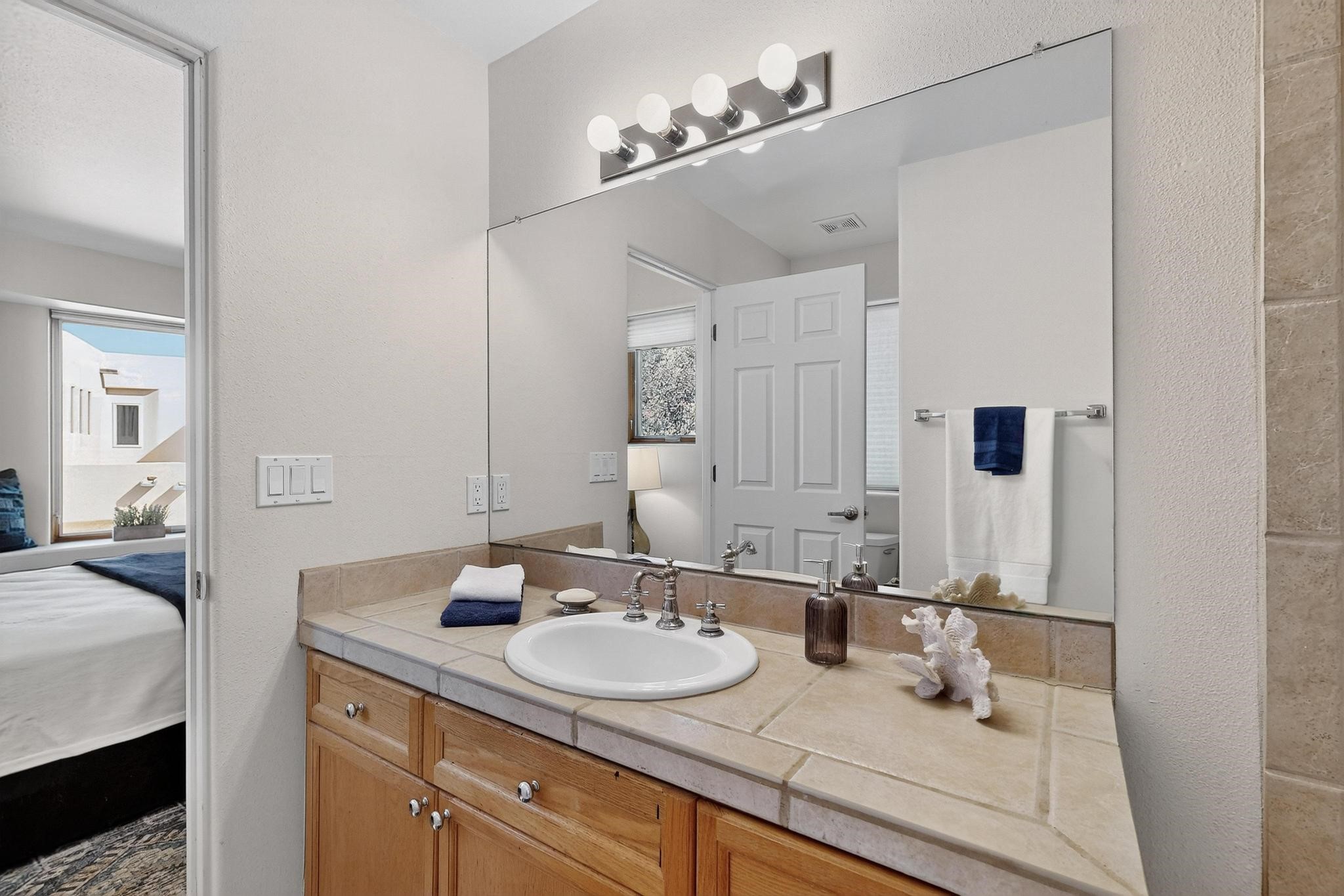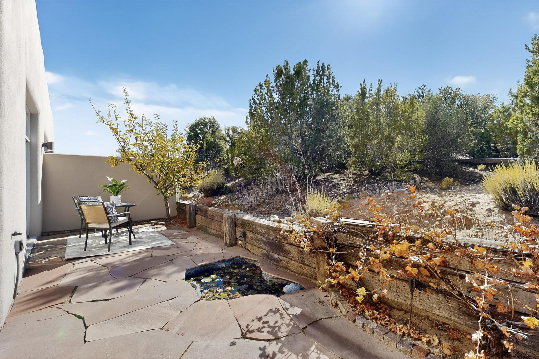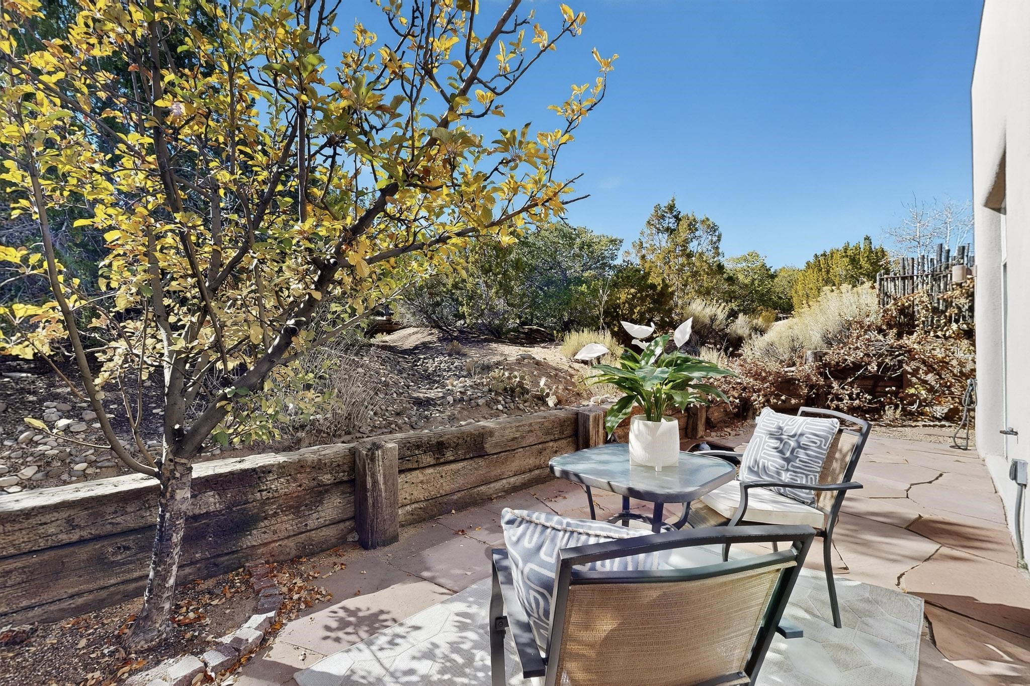 Lovely, light filled Condo conveniently located just a few minutes from the Plaza and Downtown with fabulous views of the Sangre de Cristo Mountains! The main floor consists of a high beamed ceiling open concept living room, dining room and kitchen, a cozy fireplace and direct access to a charming landscaped rear patio that looks out over protected, treed open space. A powder room is also situated on the main floor and a few steps up are the primary bedroom and bath as well as a guest bedroom with a private bath. Step out of the primary bedroom onto a private covered deck for wonderful mountain views to the North East. The home has an ample 2-car attached garage with lots of extra storage space and in-floor radiant heating for cozy warmth in the winter months. This home is part the Cielo Vista COA which is located close to several trail systems and is a super convenient location for the LANL commuter.