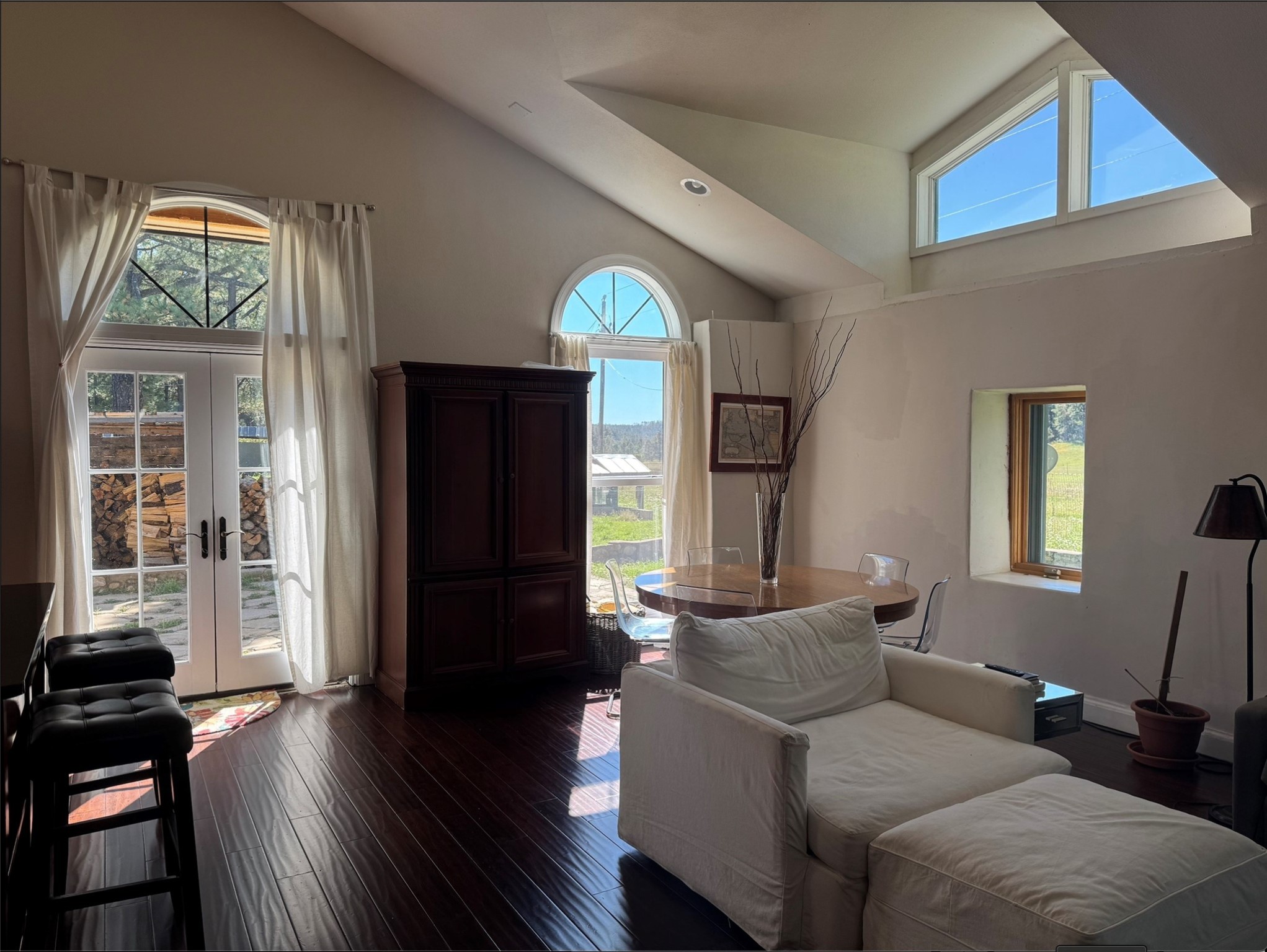 Welcome to your home in the mountains of Northern New Mexico! So many features on this large custom property! Open, vaulted living/dining, gourmet kitchen, full library with wood burning stove & balcony access, spacious first level master suite with large bath and huge walk-in closet, 2nd first-floor bedroom, flexible upstairs suite, attached two car garage with extra storage, solar system with Tesla batteries, greenhouse, PLUS Guest House with two separate two bedroom apartments! Six lovely private acres with woods and an open irrigated field! (Additional adjacent nine acres available for an additional $100,000 - ask for details!) All of this located in the much-loved Gallinas Canyon and just minutes from the El Porvenir campground in the Santa Fe National Forest where the trailhead for the hike up Hermit's Peak meets the Gallinas River!