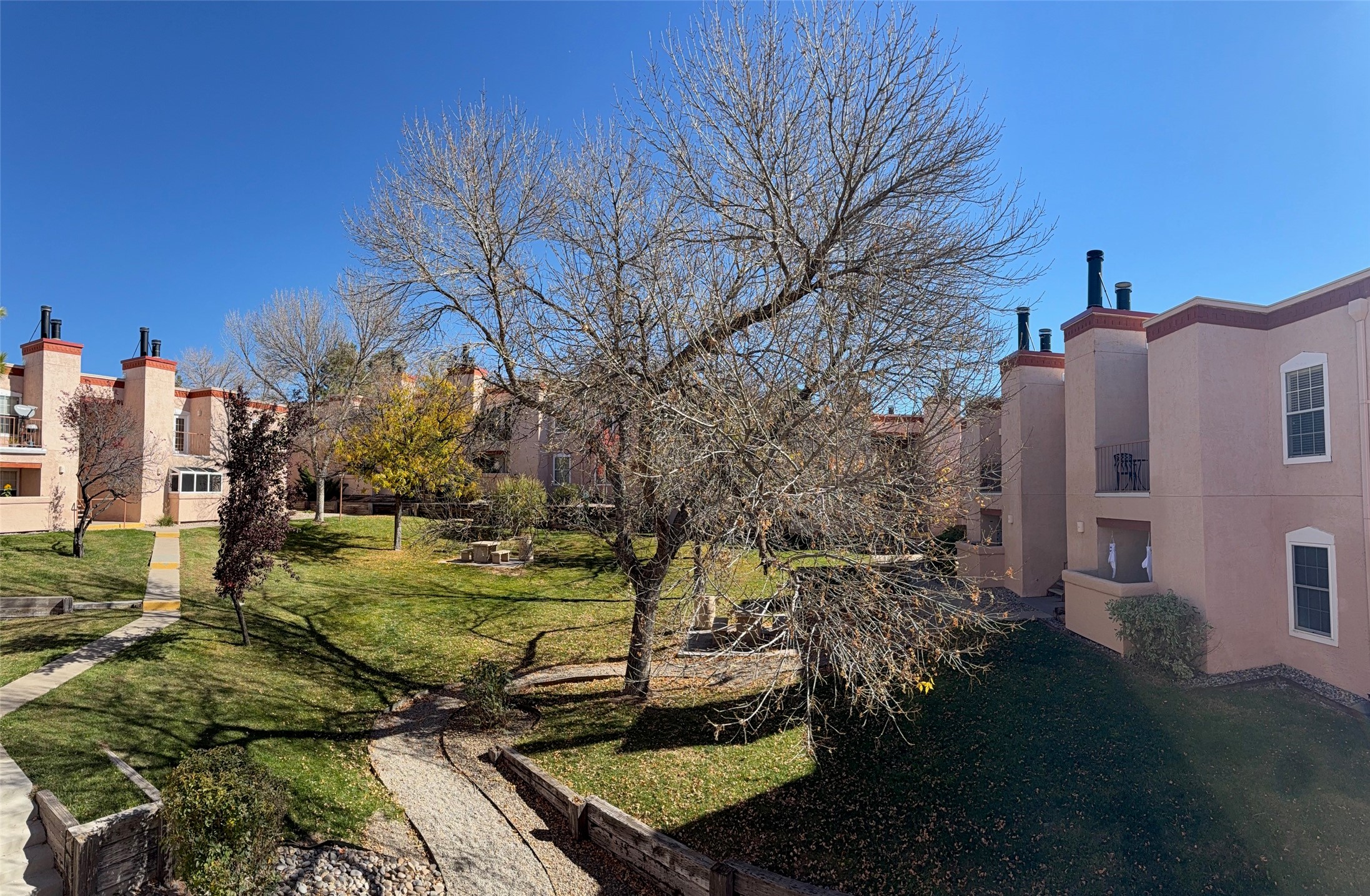 Discover comfort and convenience in this beautifully appointed 2-bedroom, 2-bath condo located on the second floor of the desirable Zia Vista community. The living area features a charming wood-burning fireplace and opens to a private balcony--perfect for relaxing. The primary suite offers a peaceful retreat with an en-suite bath and custom California Closets. The second bedroom also includes its own walk-in closet, providing ample storage. A dedicated utility room with washer and dryer adds everyday convenience. Residents of Zia Vista enjoy a full array of amenities, including a heated swimming pool, clubhouse, tennis court, on-site laundry facilities, and well-maintained outdoor common areas. Thoughtful touches like window shutters and tiled countertops in the kitchen and baths add character and style. Ideally located near shopping and just minutes from downtown Santa Fe, this condo combines lifestyle and location in one exceptional package.