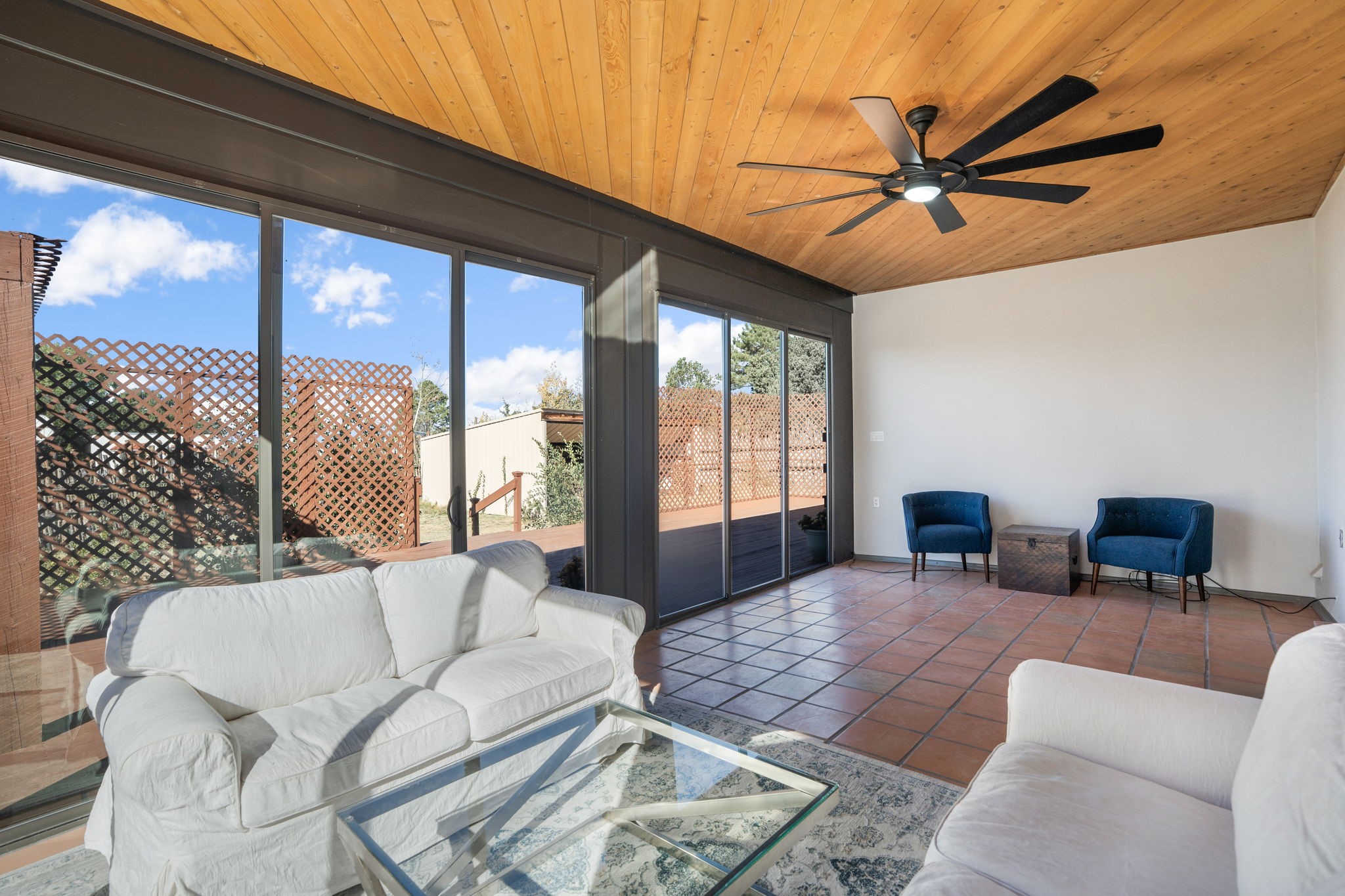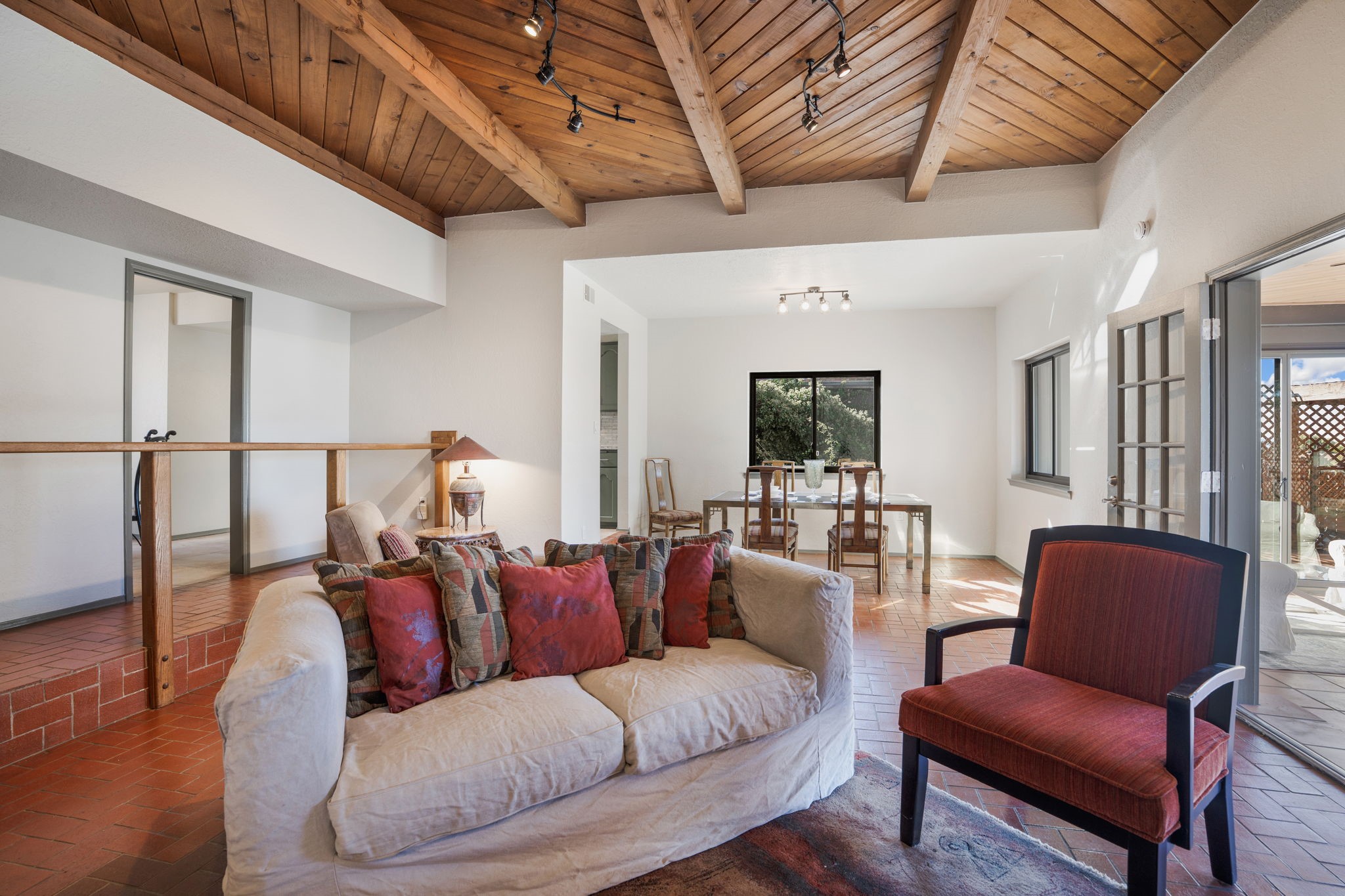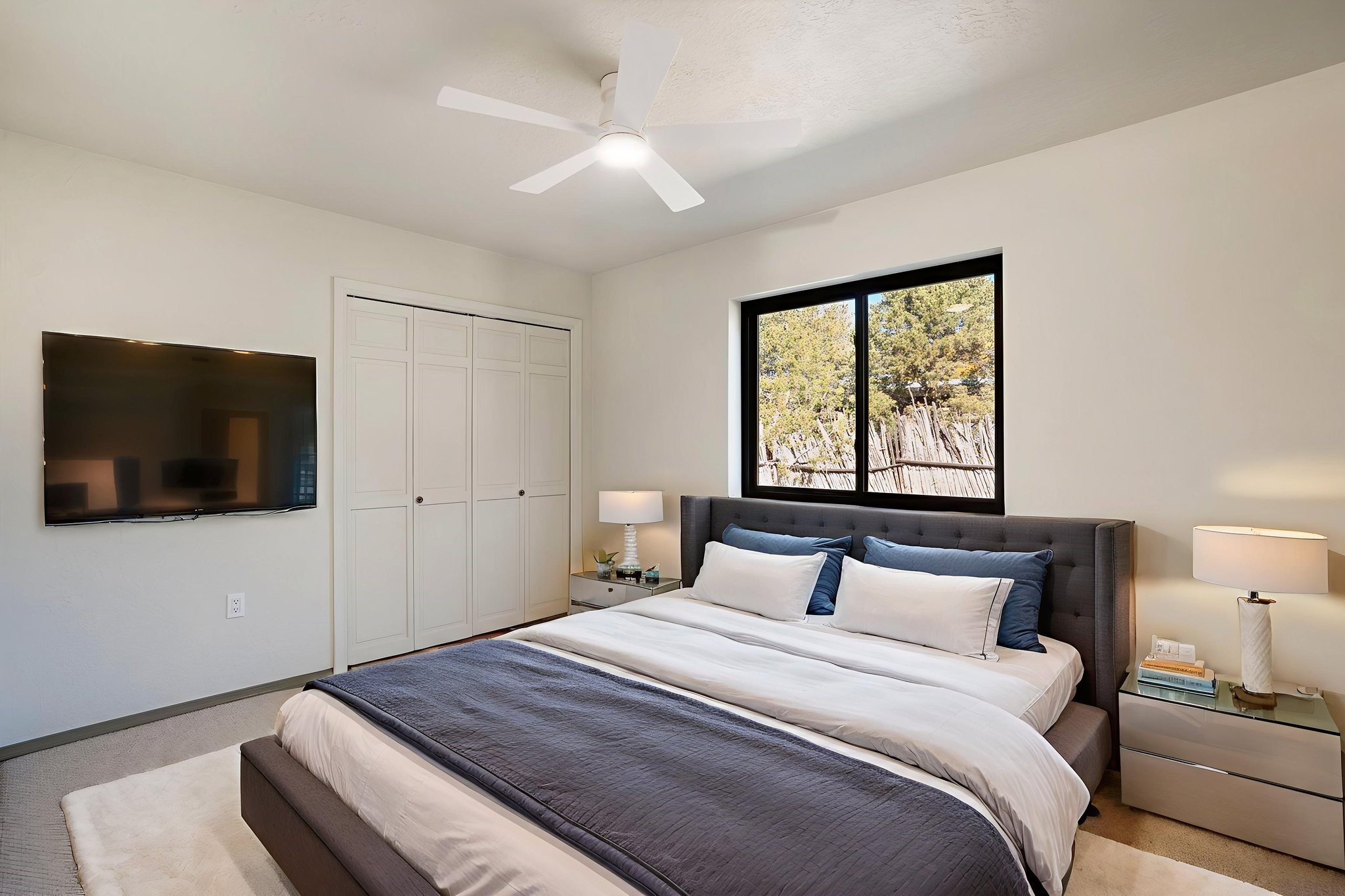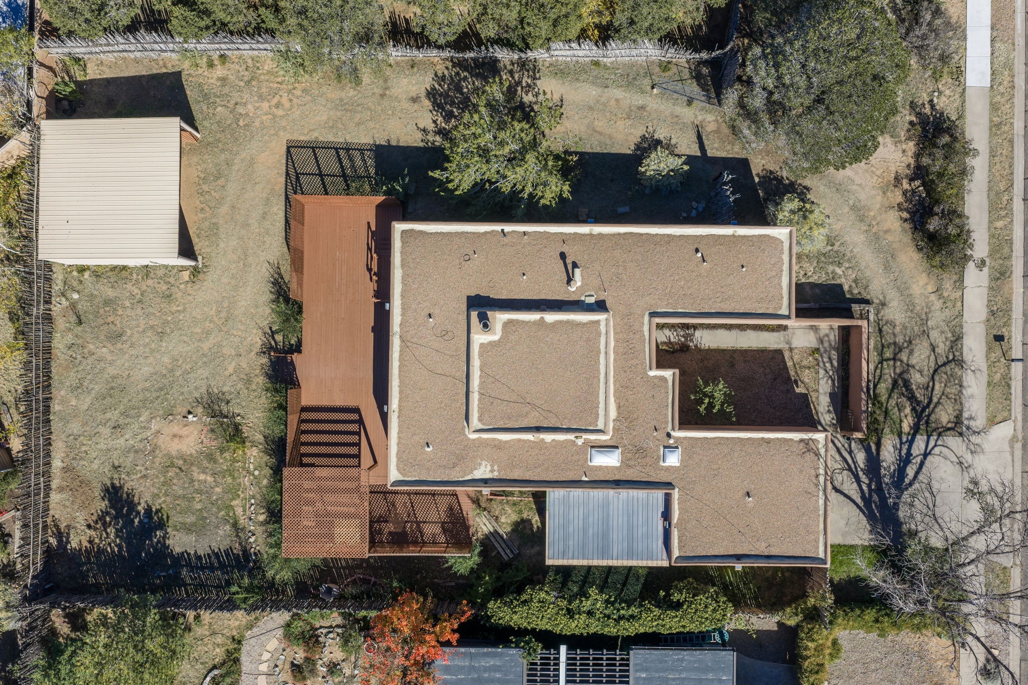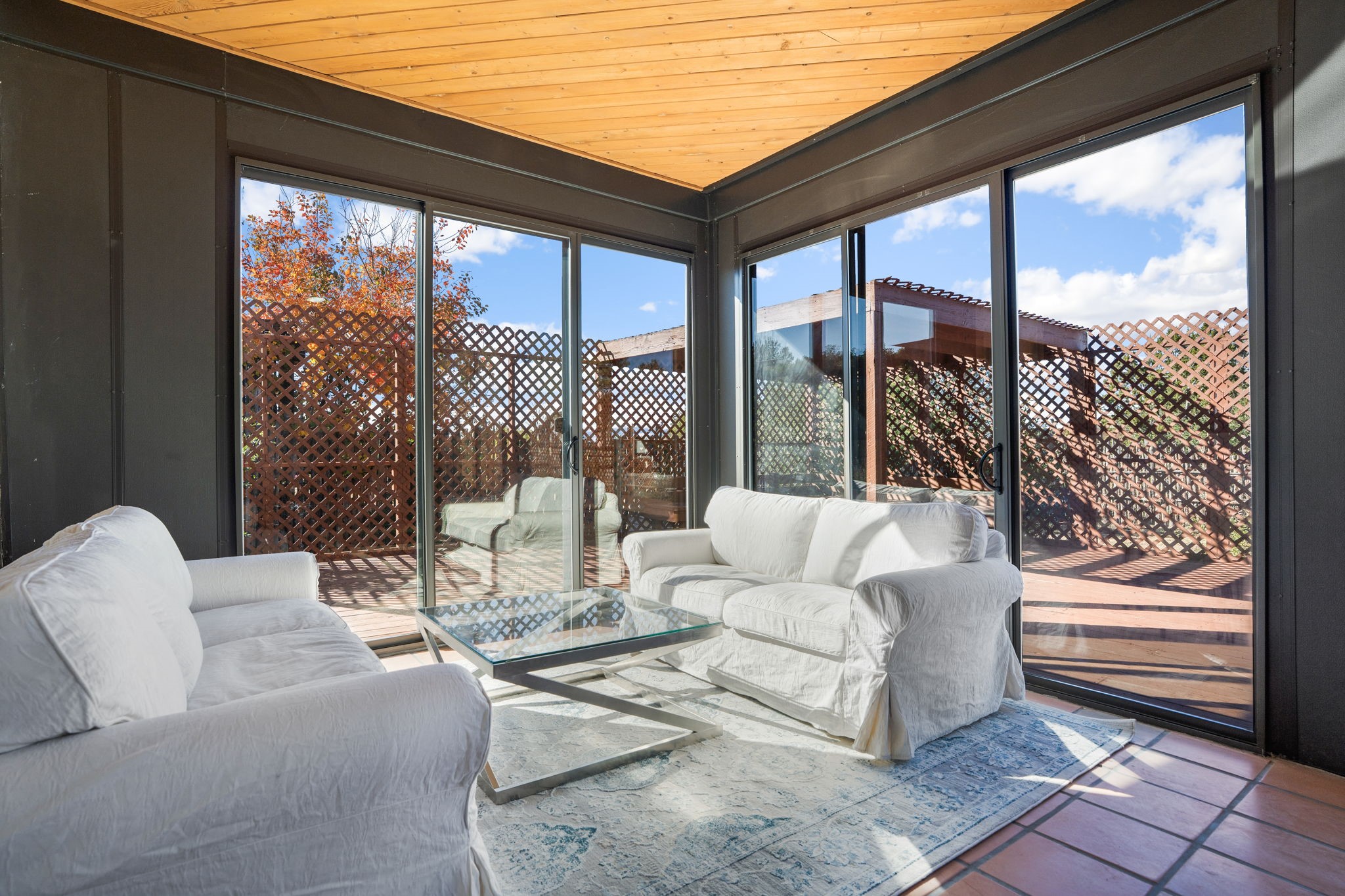An exceptional opportunity awaits in one of Santa Fe's most cherished communities, DeVargas Heights. The floor plan is both practical and elegant with the separate dining room off the updated Kitchen, including new granite countertops. The inviting living area features a warm wood-beamed ceiling and a charming fireplace, setting a distinctly Santa Fe tone. Three bedrooms and two fully renovated bathrooms offer a blend of modern luxury and neighborhood charm.Enjoy year-round light in the large sunroom that provides a seamless transition to an expansive wrap-around deck and large backyard. Additional highlights include drivable access to the backyard and a flex room located conveniently off the garage, adaptable to your specific needs Best of all, this tranquil retreat is conveniently located less than 4 miles from the vibrant Santa Fe Plaza.