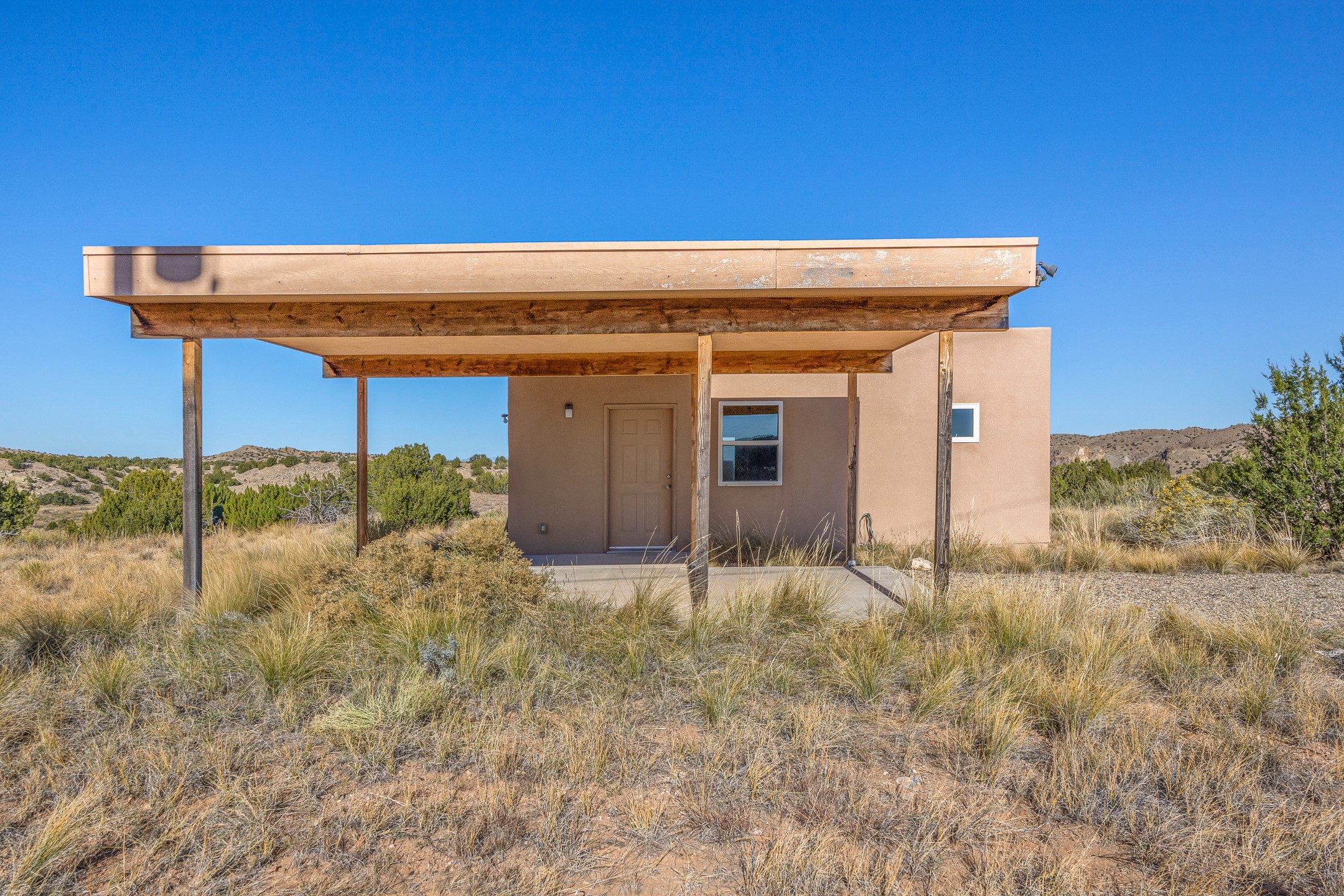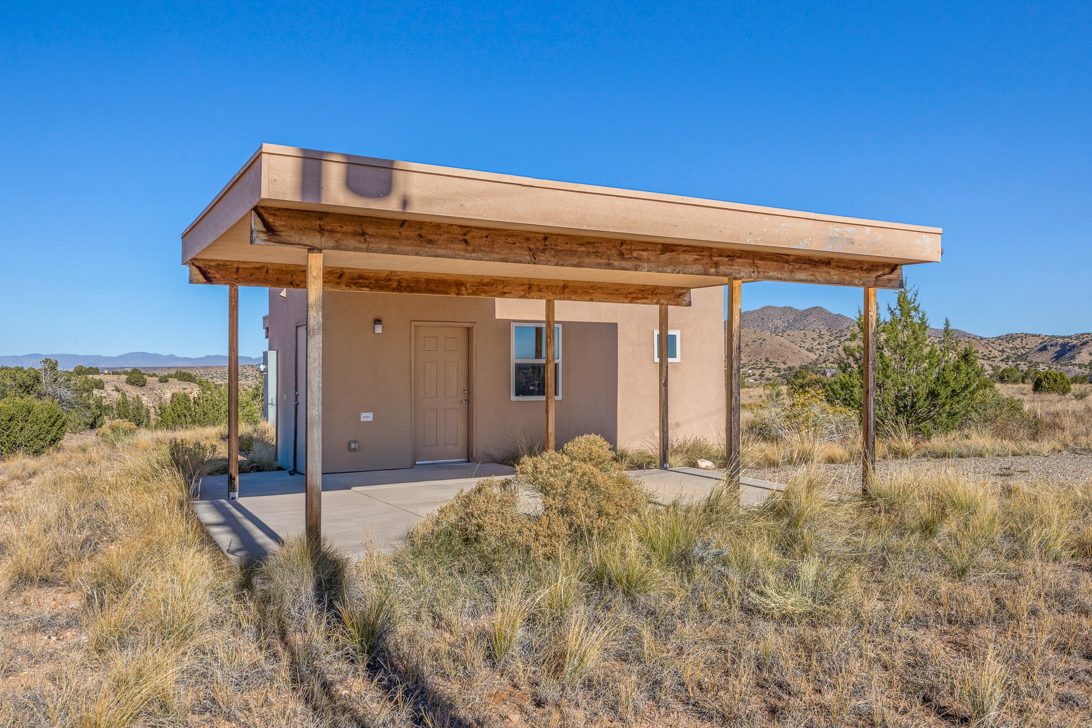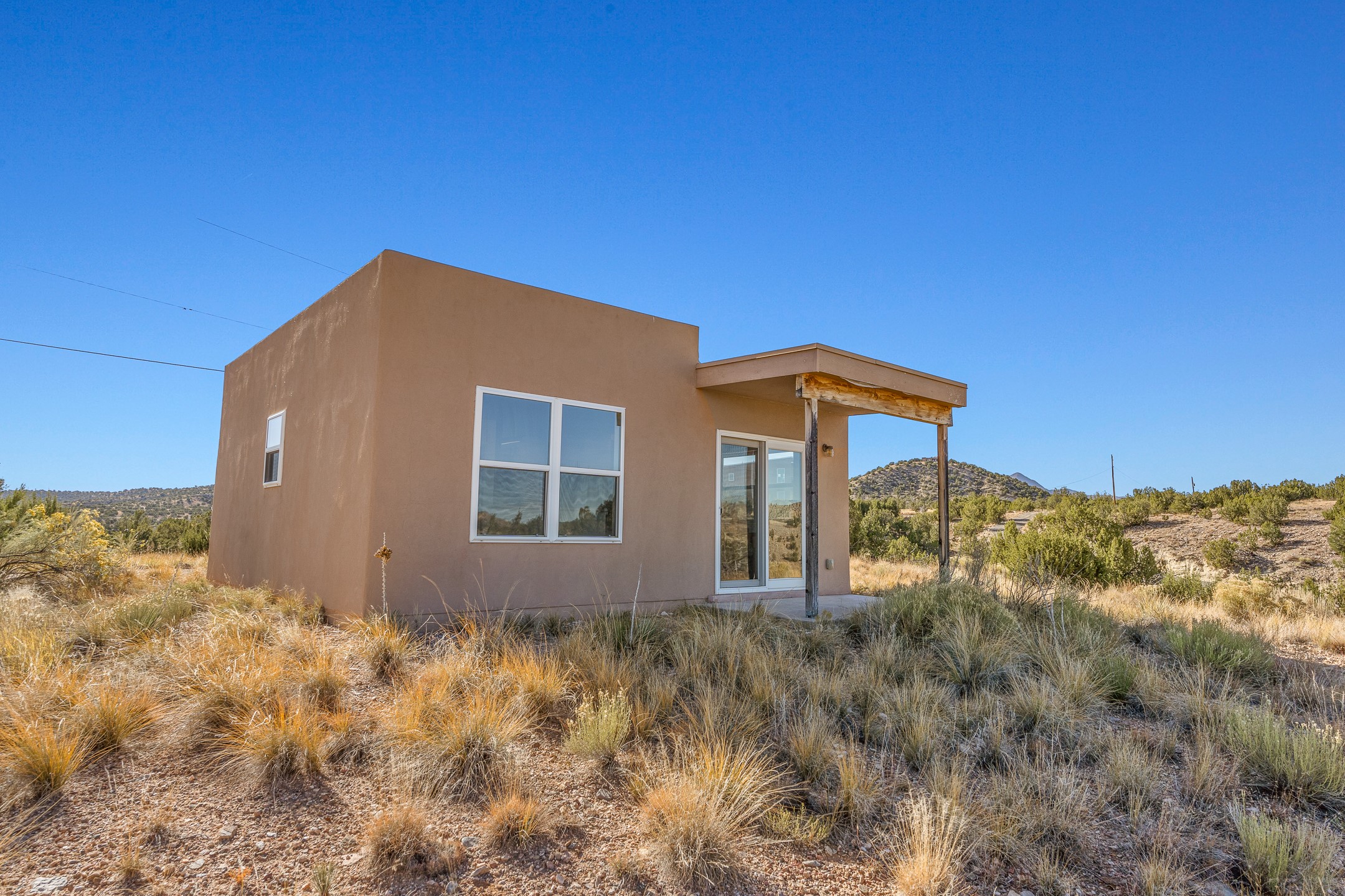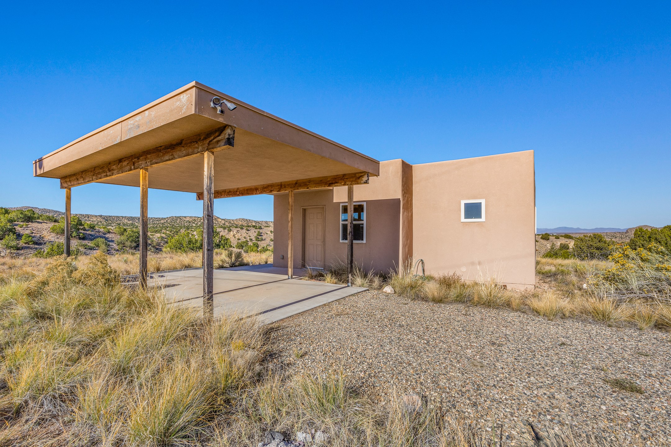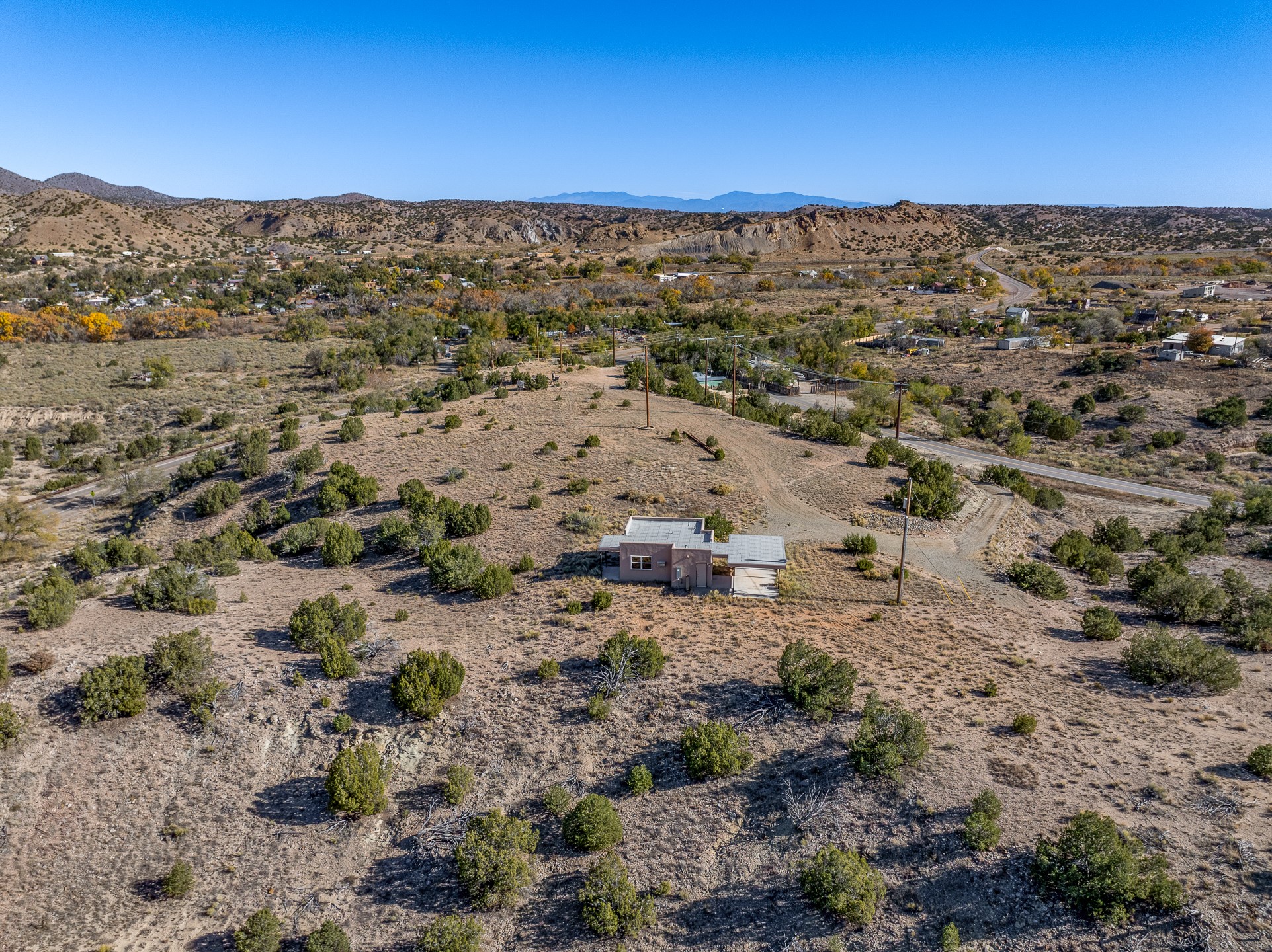 Thoughtfully designed small house on almost 5 acres. This 562 square foot, studio style home proves the adage that good things come in small packages. On a flat hilltop above Goldmine road, this home takes in views of Cerrillos and the Galisteo valley, as well as the Sangre de Cristo mountains. With stainless steel appliances, ample light, and stained concrete floors, the home feels more spacious than it's square footage would suggest. Designed with expansion in mind, it would be easy to add a bedroom, and the property is sold with two lots, a buyer could live in this home while building on the other lot. On septic and community water, within walking distance of Cerrillos and a short drive to Santa Fe. House has been smoked in and will need paint.