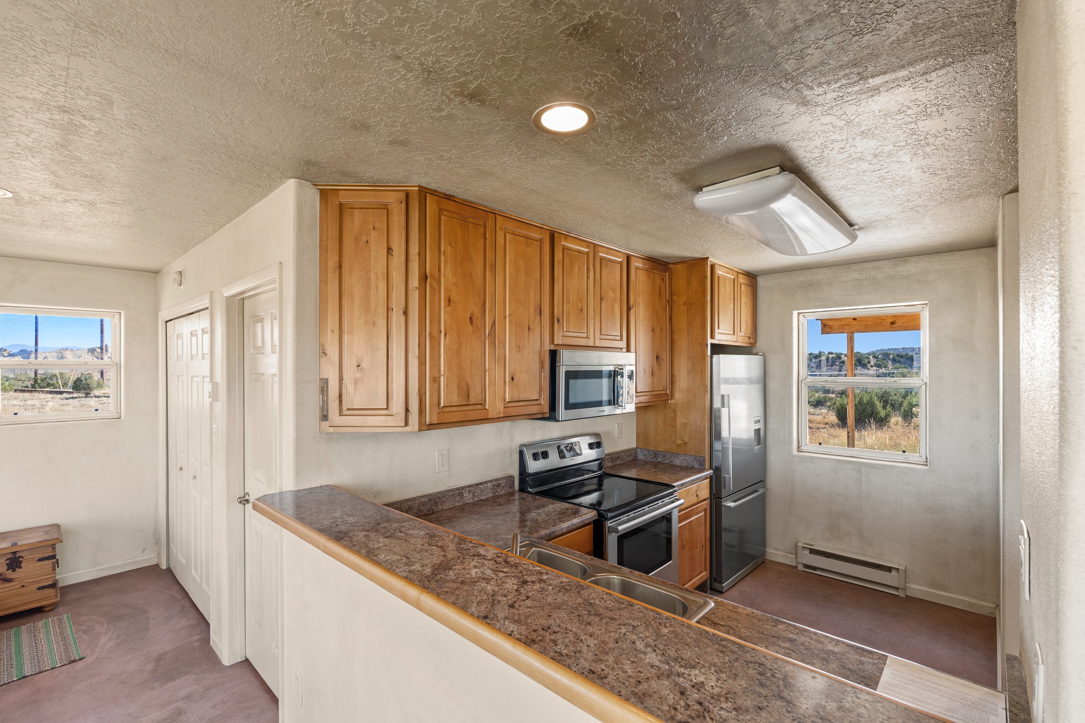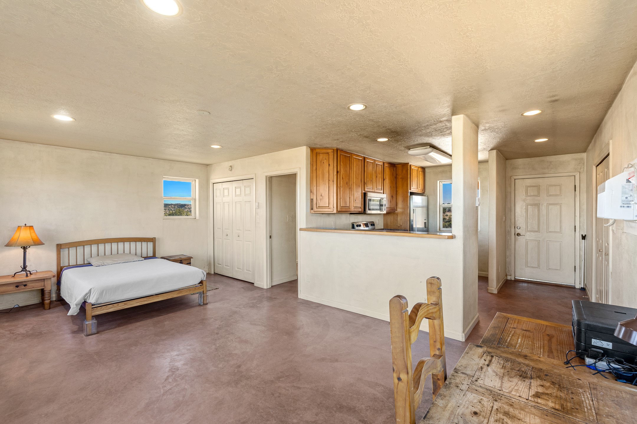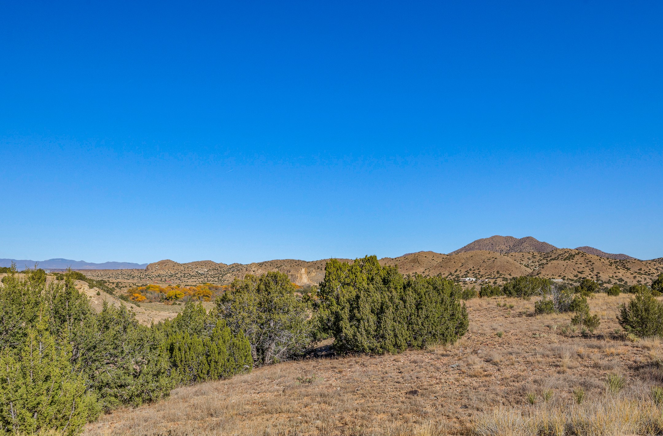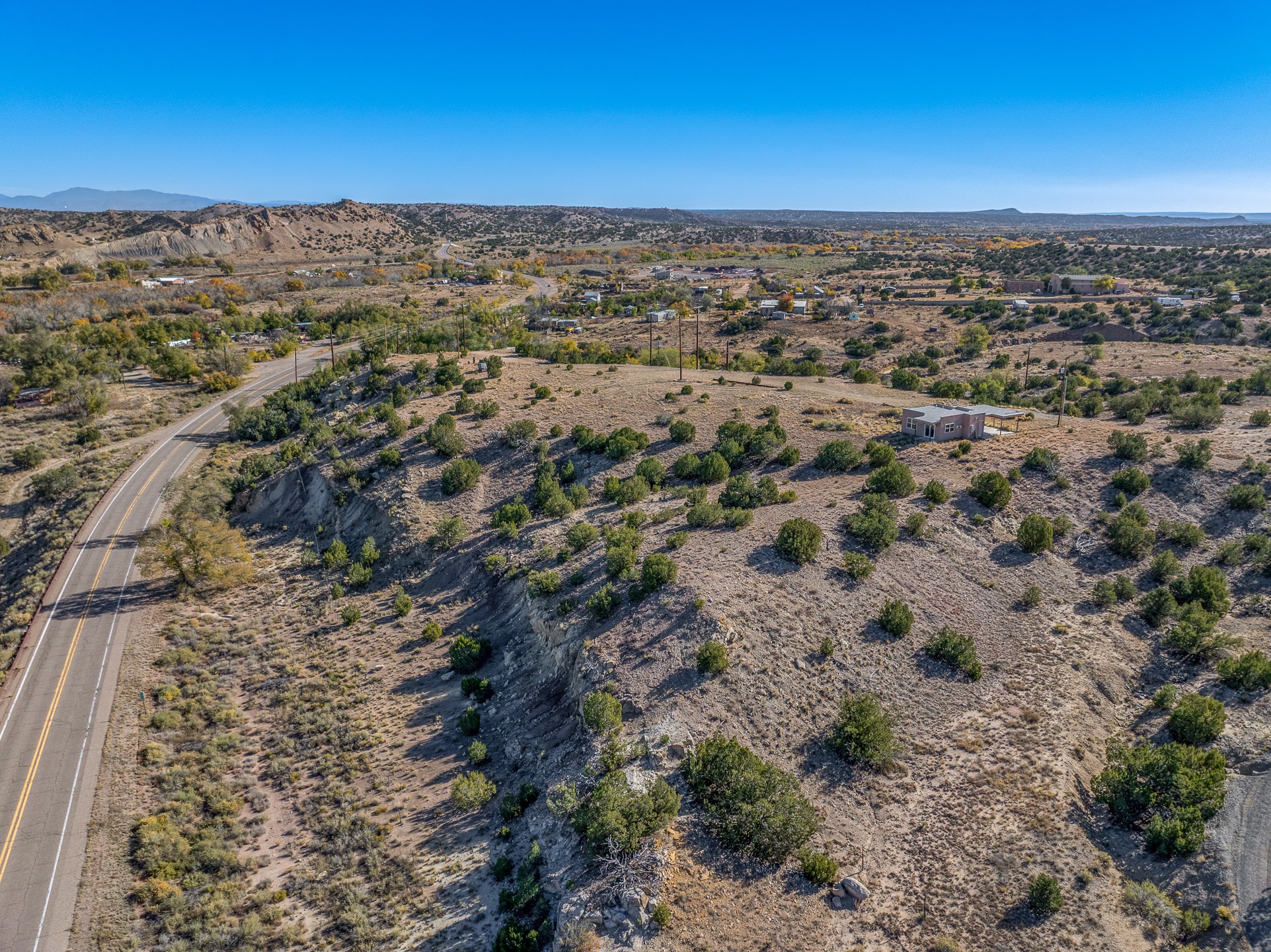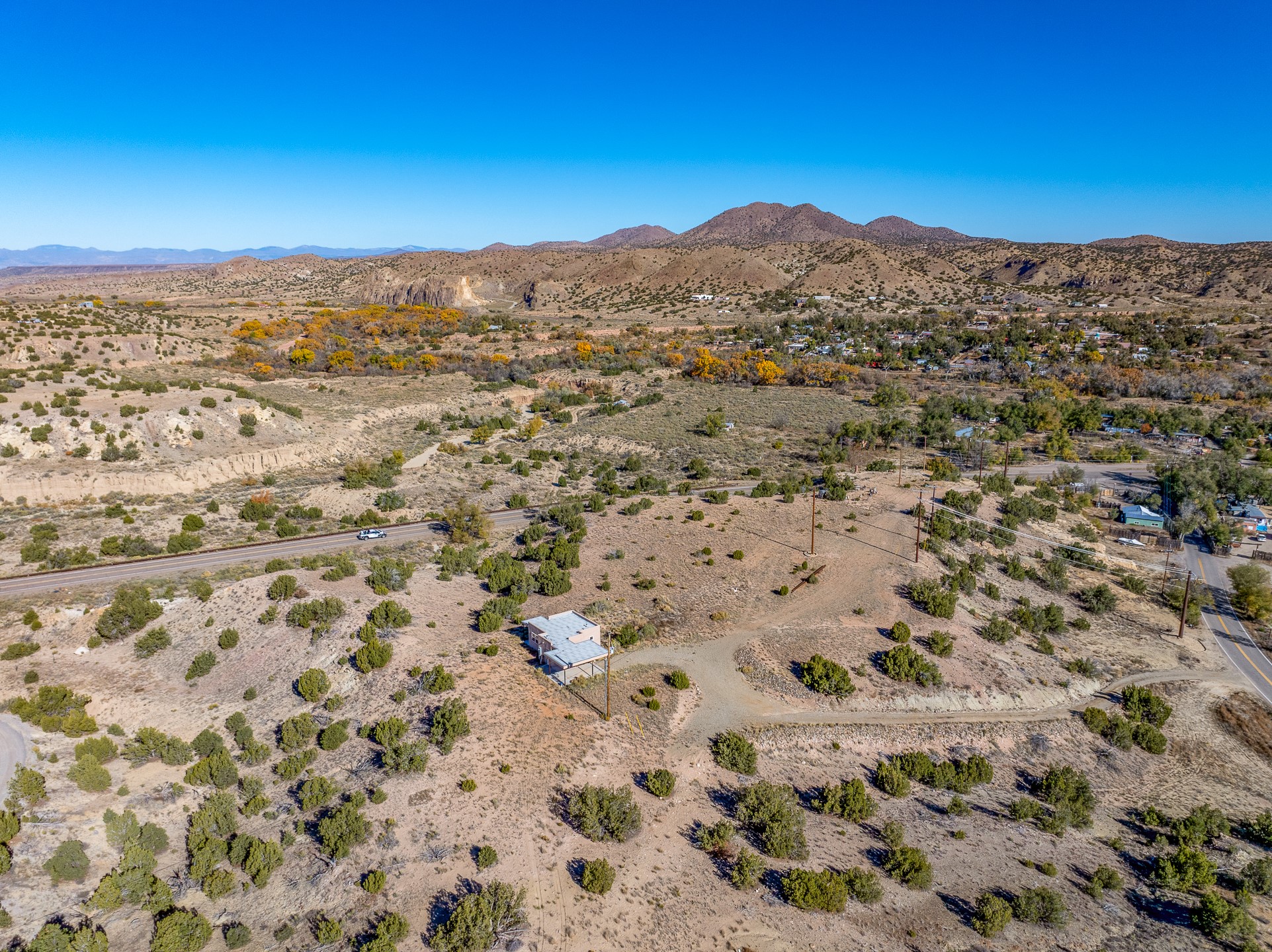 Thoughtfully designed small house on almost 5 acres. This 562 square foot, studio style home proves the adage that good things come in small packages. On a flat hilltop above Goldmine road, this home takes in views of Cerrillos and the Galisteo valley, as well as the Sangre de Cristo mountains. With stainless steel appliances, ample light, and stained concrete floors, the home feels more spacious than it's square footage would suggest. Designed with expansion in mind, it would be easy to add a bedroom, and the property is sold with two lots, a buyer could live in this home while building on the other lot. On septic and community water, within walking distance of Cerrillos and a short drive to Santa Fe. House has been smoked in and will need paint.