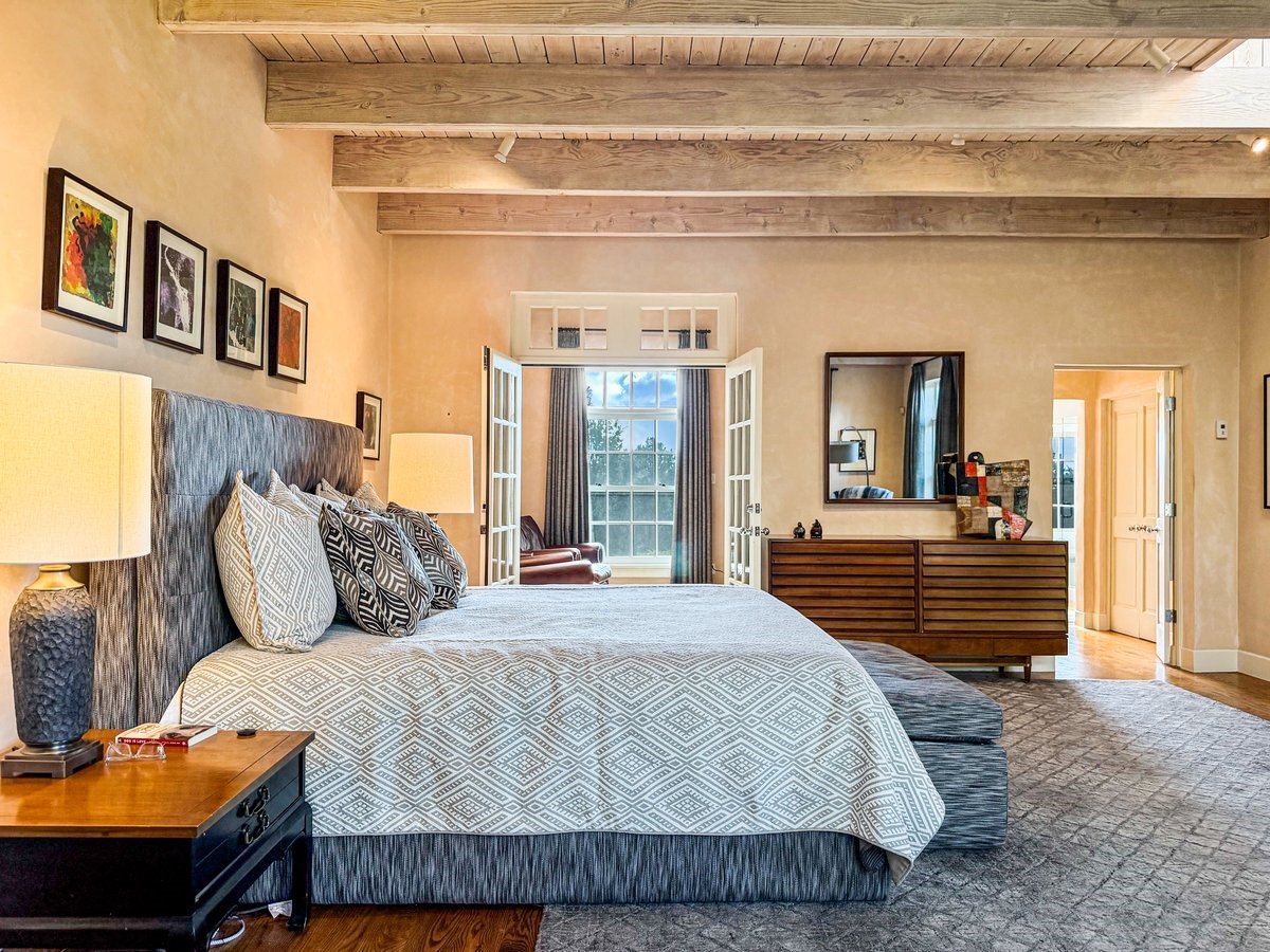 Nestled on 1.7 acres of lush, landscaped grounds near Bishop's Lodge Road, this timeless Territorial estate embodies the essence of Southwest living just five minutes from the Plaza. Behind a welcoming electronic gate, discover serene gardens and mature trees that set the tone for a private retreat filled with warmth and character. Inside, the residence unfolds with effortless grace, featuring hardwood and brick floors, tall ceilings and abundant natural light. The thoughtfully designed floor plan offers four bedrooms, three full baths, a three-quarter bath and a powder room, blending comfort and privacy throughout. Three inviting guest suites, each with its own en suite bath, are privately situated apart from the main living areas, providing an ideal layout for hosting family or friends. The elegant home captures the timeless charm of Santa Fe, where every detail invites relaxation and connection to the surrounding beauty.