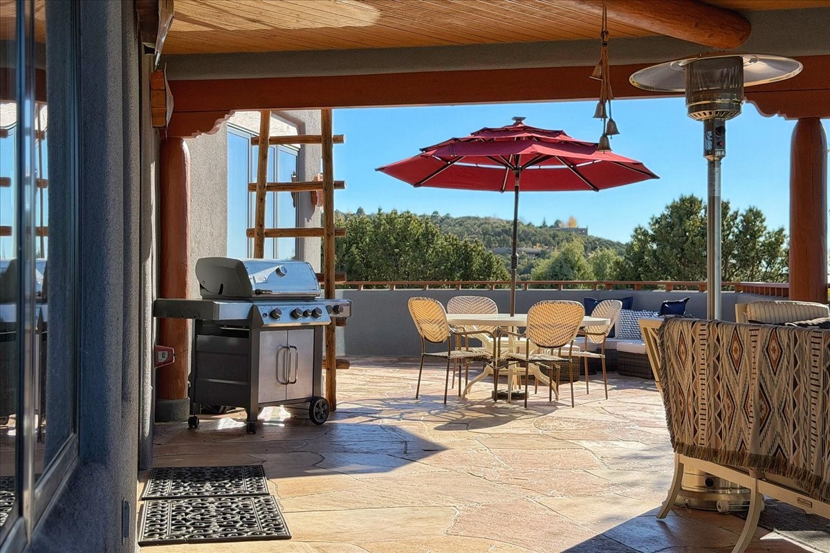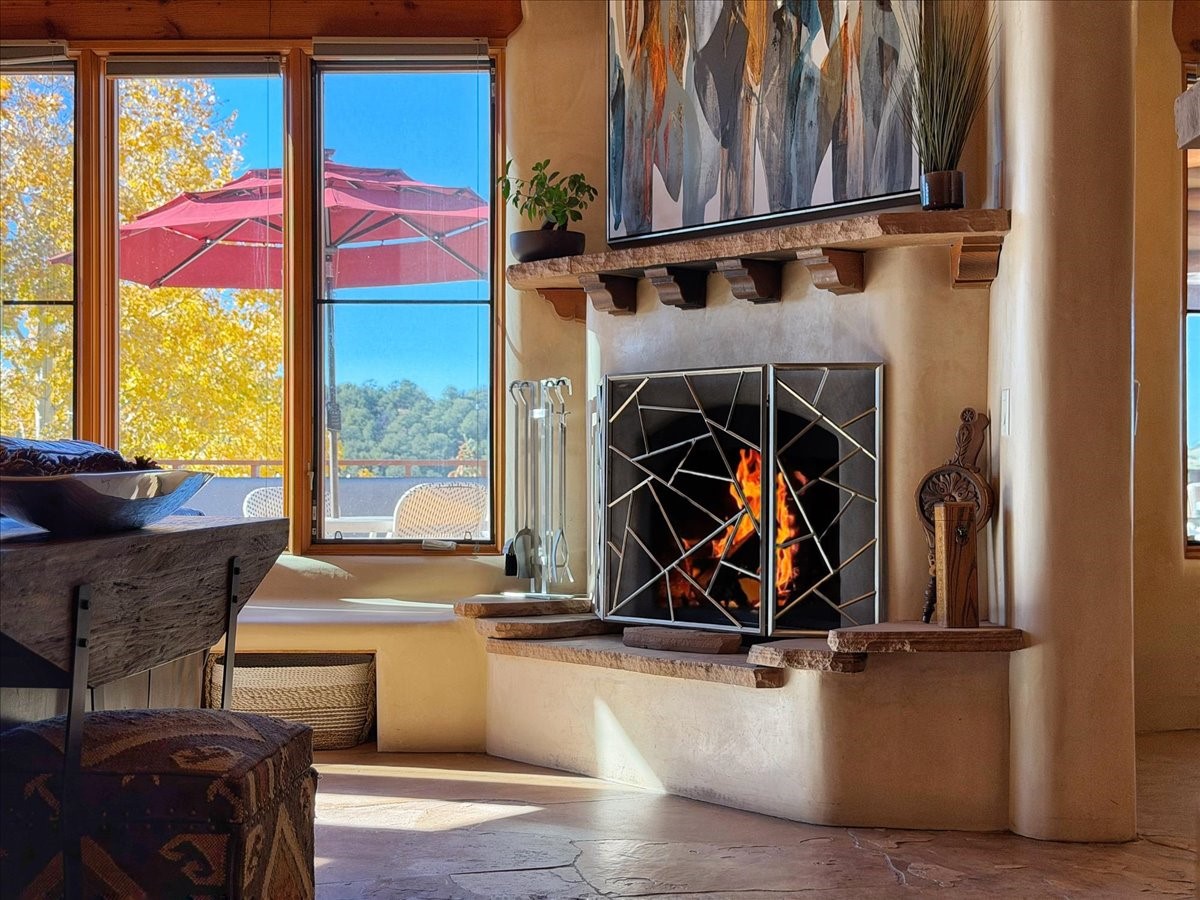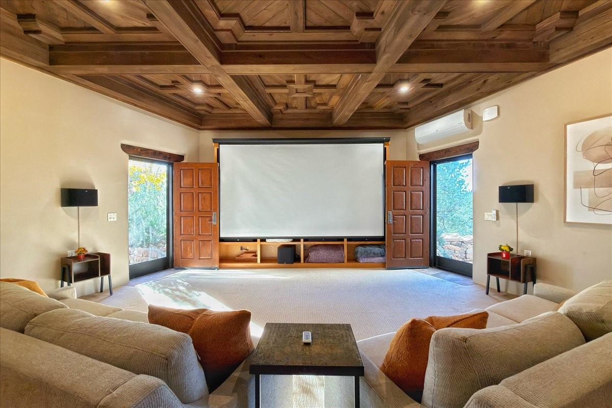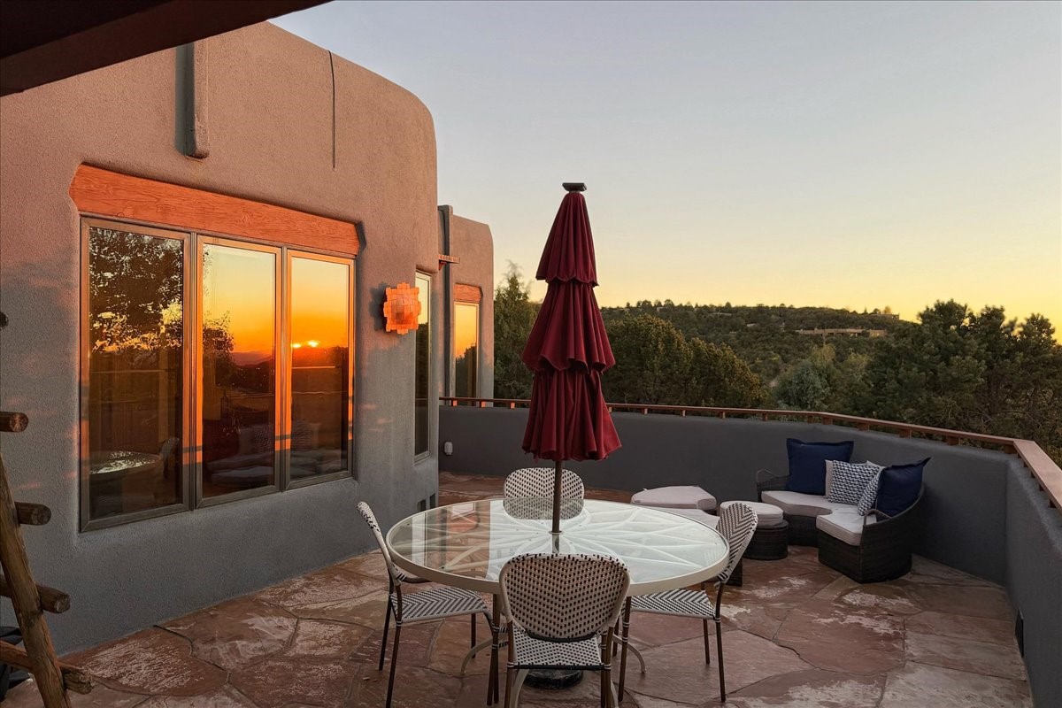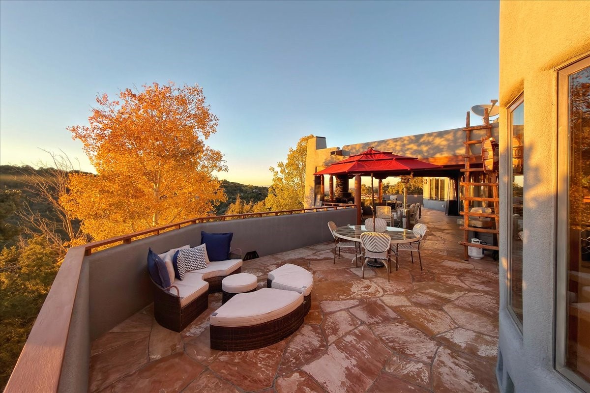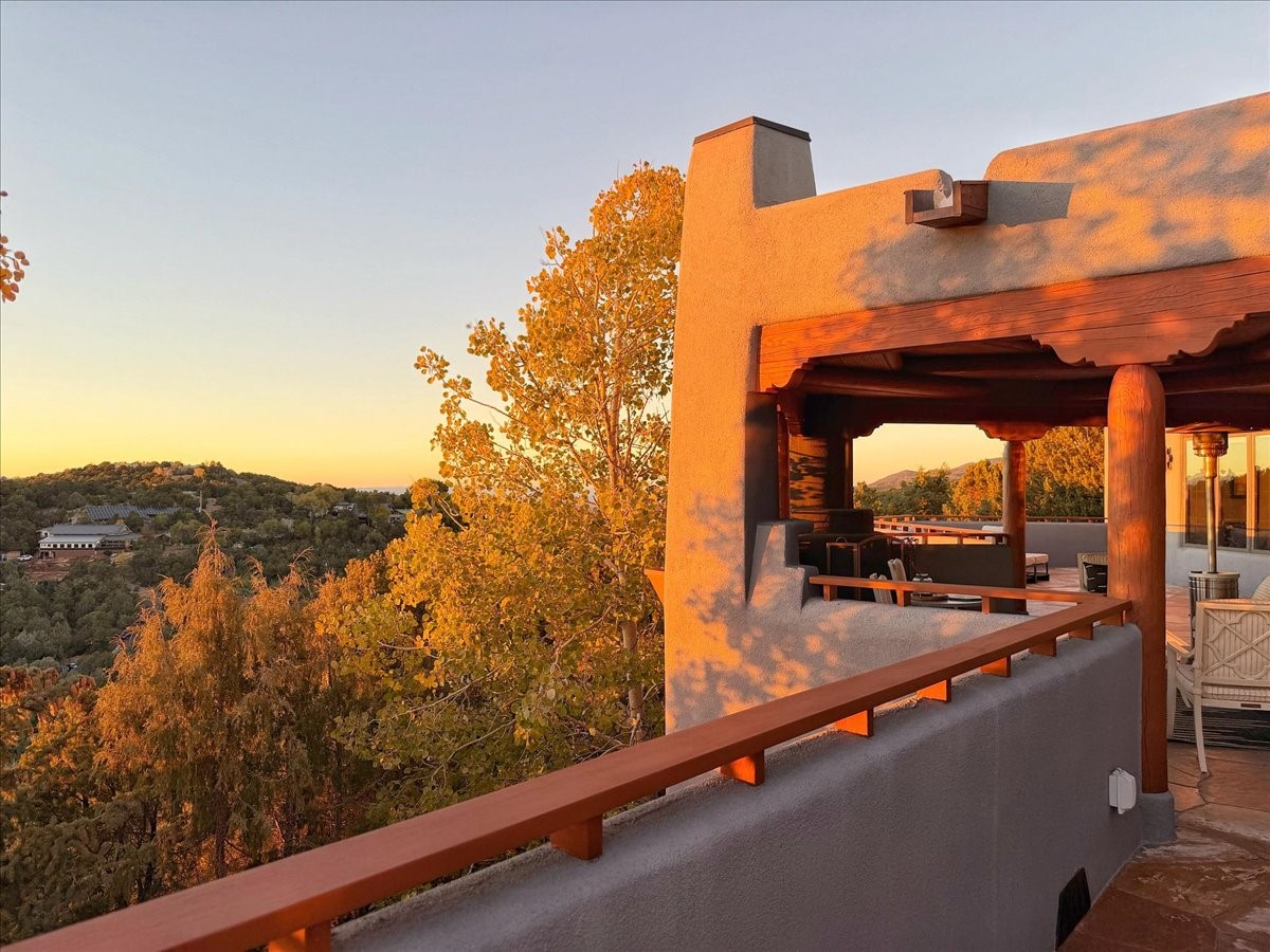 Whispering Hill--where nature's quiet beauty keeps its own gentle secrets. Set within Hyde Park Estates, this architectural statement captures panoramic vistas that are rare even for Santa Fe--a dramatic sweep of horizon, sculpted mountains, and ever-changing light. Designed with a flexible five-bedroom layout, Whispering Hill offers versatility without sacrificing elegance. The main level functions as a complete living environment, ideal for those who prefer life without stairs. A tranquil primary suite, sophisticated gathering areas, and rare hardwood cabinetry set a tone of refined luxury from the moment you arrive. Throughout the residence, artisan ceilings--each one individually crafted--serve as sculptural centerpieces across both levels and extend to the outdoor entertaining terrace, where their artistry meets the surrounding landscape with extraordinary effect. The Media Room, anchored by a gigantic viewing screen, was envisioned for cinema, live sporting events, and immersive entertainment--an atmospheric space designed for true enjoyment. The lower level continues the architectural flow with a second primary suite and additional bedrooms, each offering direct outdoor access to terraces, pathways, and quiet corners of the landscape. Outdoor living expands with multiple areas to gather, including a radiant-heated portal, a GreenHouse, secluded seating spaces designed for unplugged relaxation, and a private hot tub positioned just outside one of the lower-level bedrooms--a serene vantage point for stargazing and quiet evenings. From the elevated main terrace, you can see 10,000 Waves, Santa Fe's renowned Japanese-inspired spa nestled among the pines. Across the grounds, irrigated landscaping enhances the natural contours of the site, ensuring year-round beauty, color, and ease of care. Climate comfort is thoughtfully supported by eight strategically placed mini-splits for individualized heating and cooling, working in tandem with the primary systems to ensure four-season comfort at altitude. A pre-listing home inspection has already been completed, offering added transparency and confidence for prospective buyers. Minutes from the Santa Fe Plaza, Whispering Hill is an exceptional choice for those seeking either a full-time luxury residence or an elevated secondary retreat. With premium upgrades far too numerous to list, rare materials, master craftsmanship, and one of Santa Fe's most compelling vantage points, Whispering Hill stands as a true Santa Fe masterpiece--a seamless fusion of design, nature, and elevated mountain living.