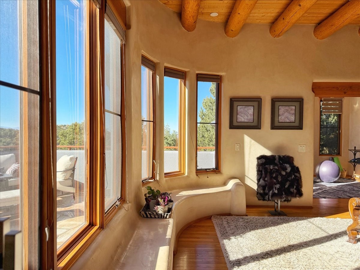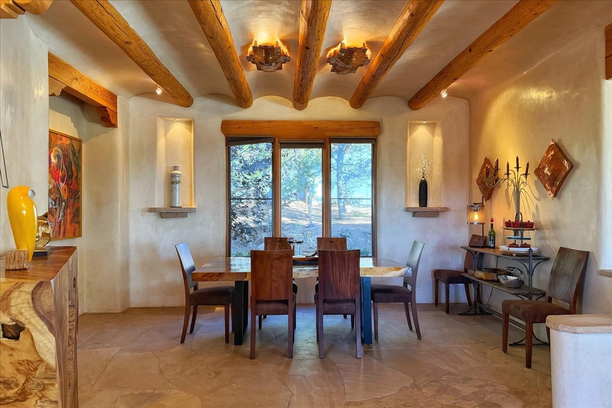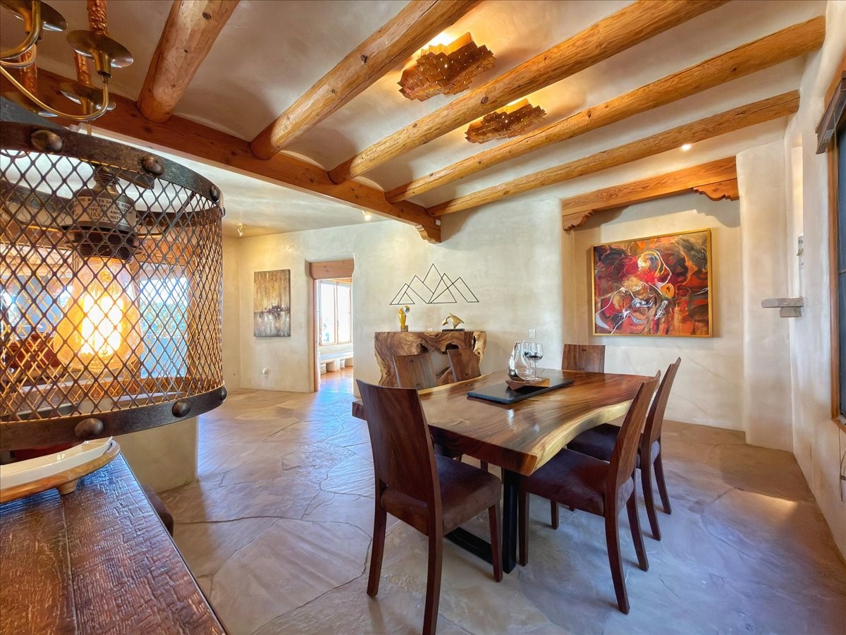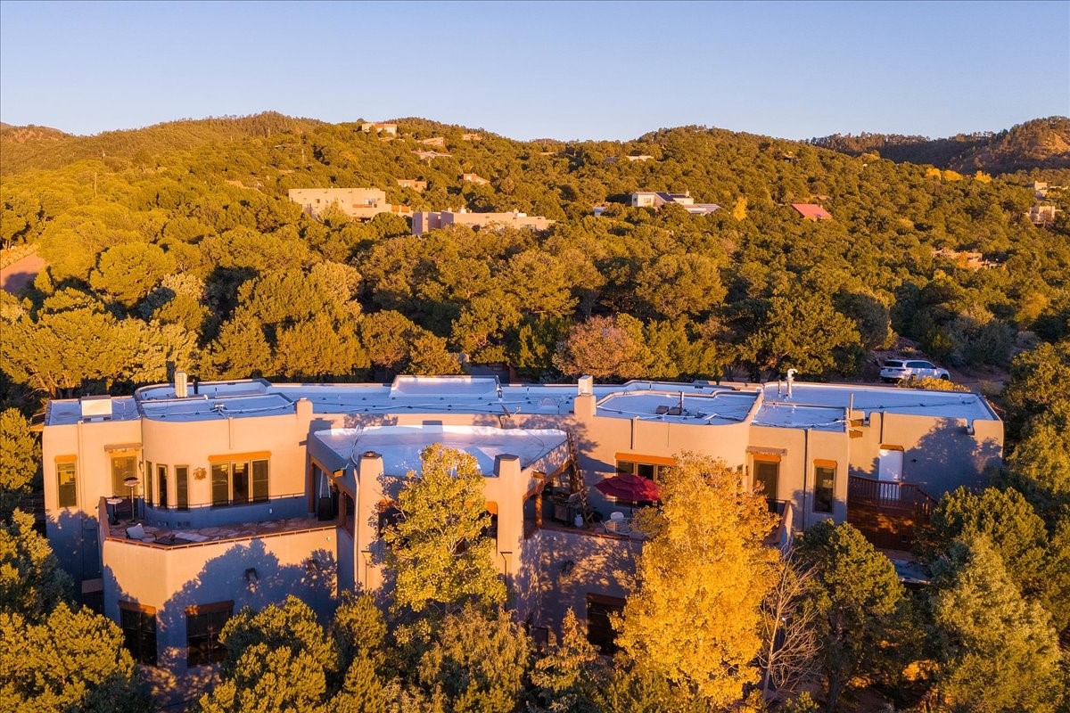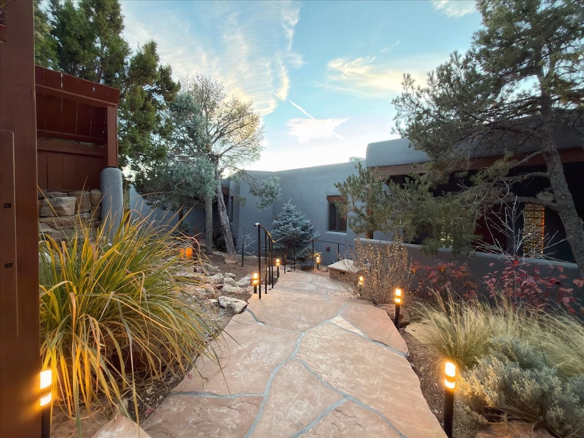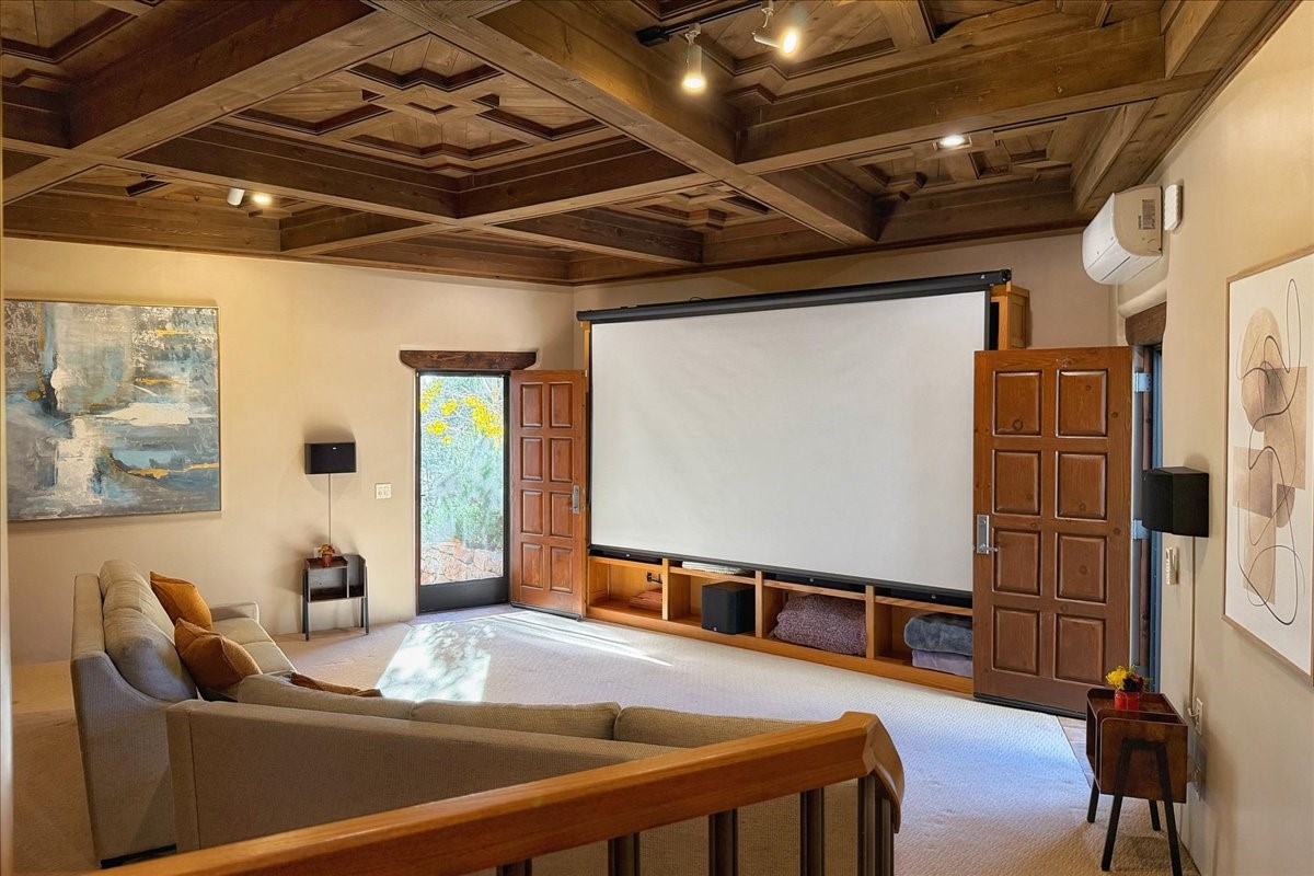 Whispering Hill--where nature's quiet beauty keeps its own gentle secrets. Set within Hyde Park Estates, this architectural statement captures panoramic vistas that are rare even for Santa Fe--a dramatic sweep of horizon, sculpted mountains, and ever-changing light. Designed with a flexible five-bedroom layout, Whispering Hill offers versatility without sacrificing elegance. The main level functions as a complete living environment, ideal for those who prefer life without stairs. A tranquil primary suite, sophisticated gathering areas, and rare hardwood cabinetry set a tone of refined luxury from the moment you arrive. Throughout the residence, artisan ceilings--each one individually crafted--serve as sculptural centerpieces across both levels and extend to the outdoor entertaining terrace, where their artistry meets the surrounding landscape with extraordinary effect. The Media Room, anchored by a gigantic viewing screen, was envisioned for cinema, live sporting events, and immersive entertainment--an atmospheric space designed for true enjoyment. The lower level continues the architectural flow with a second primary suite and additional bedrooms, each offering direct outdoor access to terraces, pathways, and quiet corners of the landscape. Outdoor living expands with multiple areas to gather, including a radiant-heated portal, a GreenHouse, secluded seating spaces designed for unplugged relaxation, and a private hot tub positioned just outside one of the lower-level bedrooms--a serene vantage point for stargazing and quiet evenings. From the elevated main terrace, you can see 10,000 Waves, Santa Fe's renowned Japanese-inspired spa nestled among the pines. Across the grounds, irrigated landscaping enhances the natural contours of the site, ensuring year-round beauty, color, and ease of care. Climate comfort is thoughtfully supported by eight strategically placed mini-splits for individualized heating and cooling, working in tandem with the primary systems to ensure four-season comfort at altitude. A pre-listing home inspection has already been completed, offering added transparency and confidence for prospective buyers. Minutes from the Santa Fe Plaza, Whispering Hill is an exceptional choice for those seeking either a full-time luxury residence or an elevated secondary retreat. With premium upgrades far too numerous to list, rare materials, master craftsmanship, and one of Santa Fe's most compelling vantage points, Whispering Hill stands as a true Santa Fe masterpiece--a seamless fusion of design, nature, and elevated mountain living.