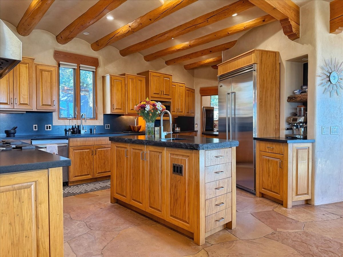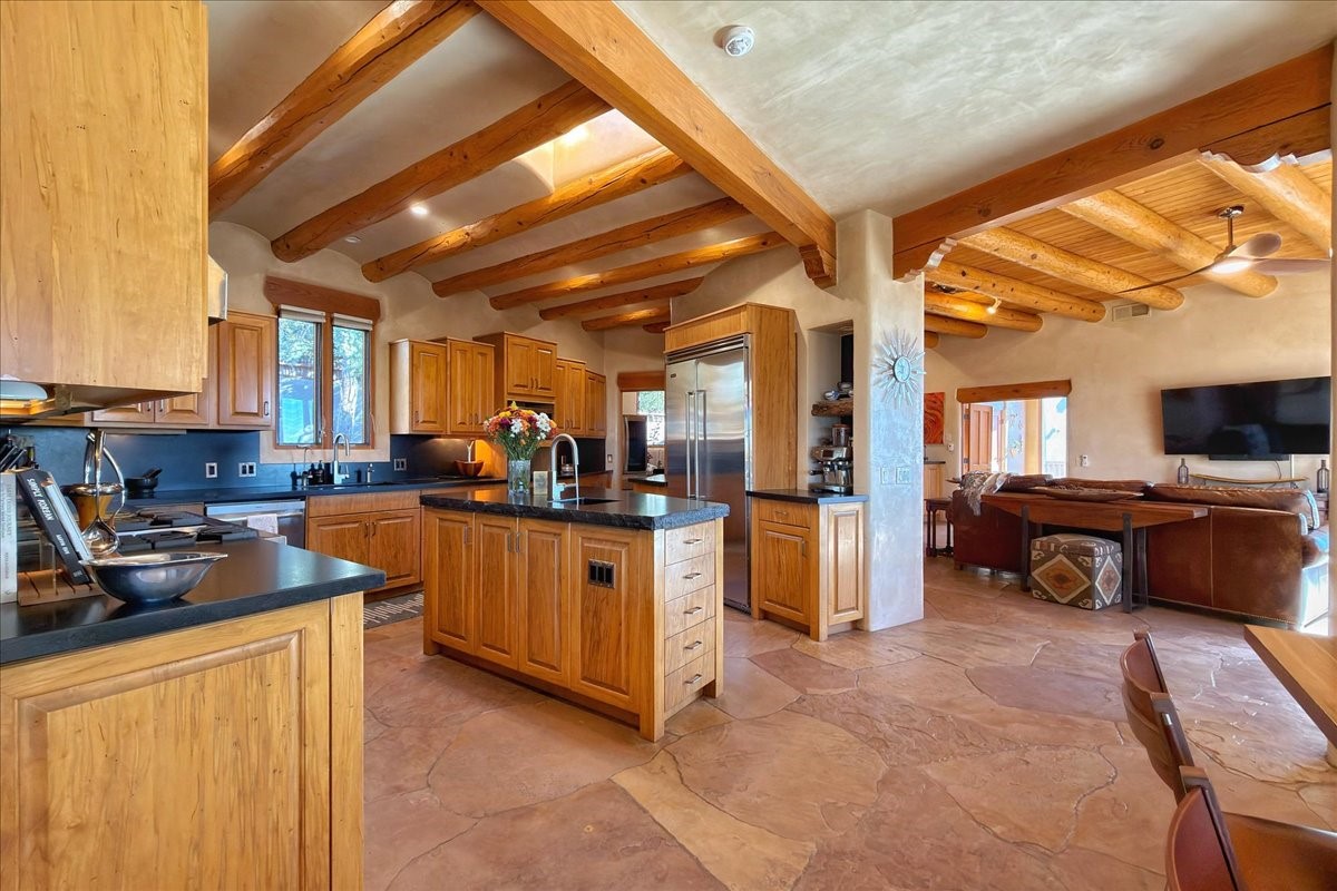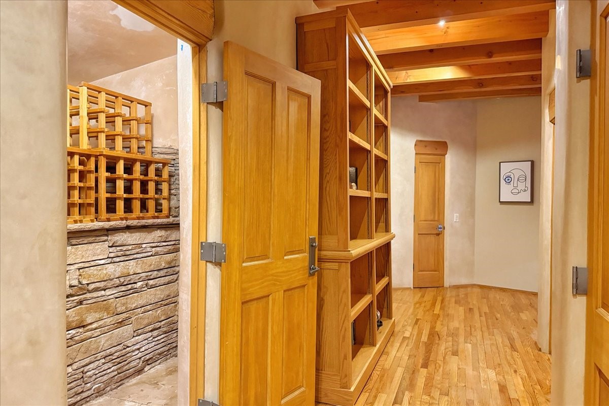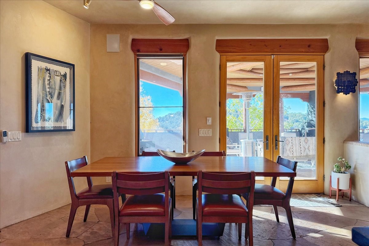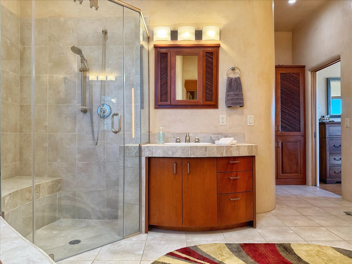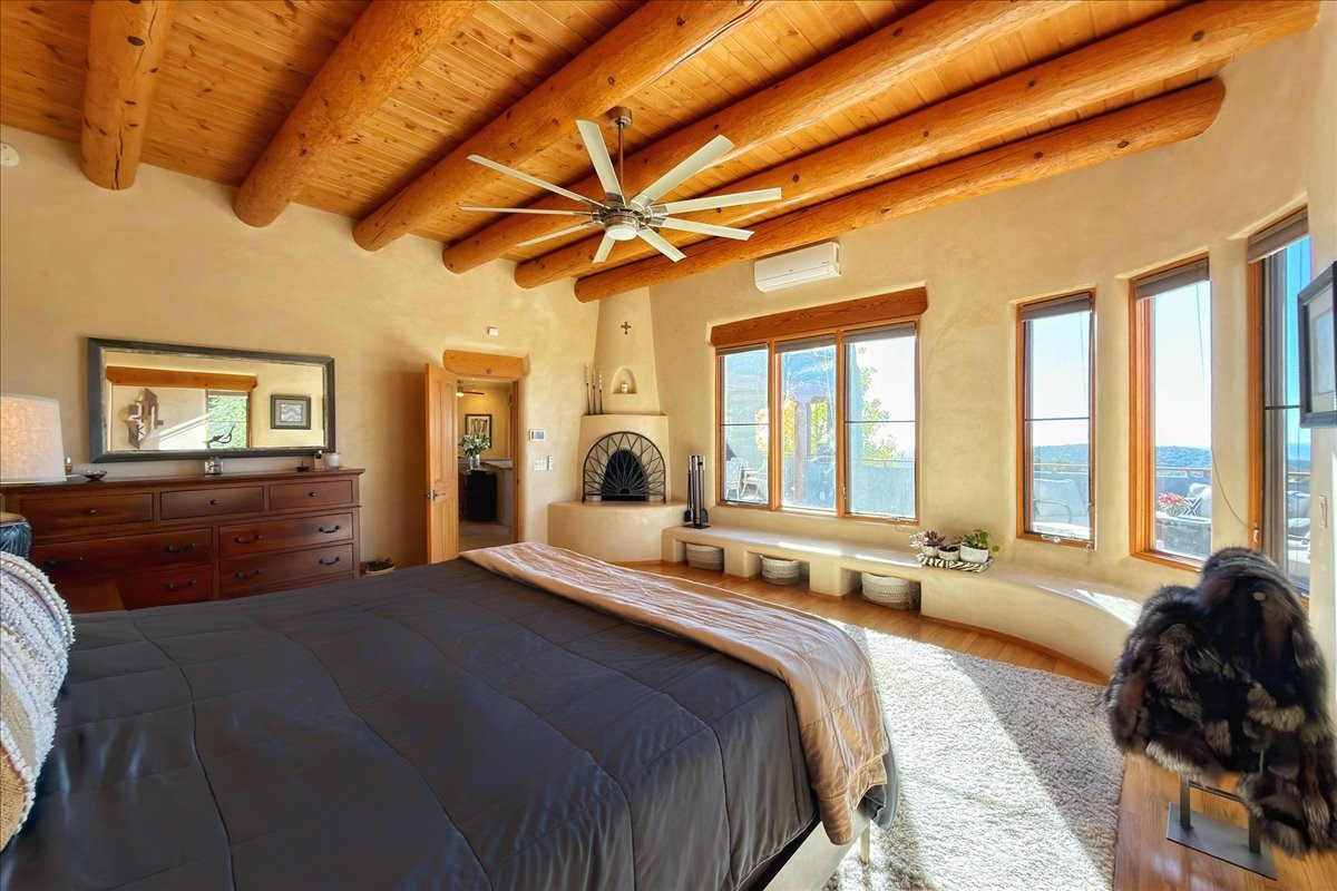 Whispering Hill--where nature's quiet beauty keeps its own gentle secrets. Set within Hyde Park Estates, this architectural statement captures panoramic vistas that are rare even for Santa Fe--a dramatic sweep of horizon, sculpted mountains, and ever-changing light. Designed with a flexible five-bedroom layout, Whispering Hill offers versatility without sacrificing elegance. The main level functions as a complete living environment, ideal for those who prefer life without stairs. A tranquil primary suite, sophisticated gathering areas, and rare hardwood cabinetry set a tone of refined luxury from the moment you arrive. Throughout the residence, artisan ceilings--each one individually crafted--serve as sculptural centerpieces across both levels and extend to the outdoor entertaining terrace, where their artistry meets the surrounding landscape with extraordinary effect. The Media Room, anchored by a gigantic viewing screen, was envisioned for cinema, live sporting events, and immersive entertainment--an atmospheric space designed for true enjoyment. The lower level continues the architectural flow with a second primary suite and additional bedrooms, each offering direct outdoor access to terraces, pathways, and quiet corners of the landscape. Outdoor living expands with multiple areas to gather, including a radiant-heated portal, a GreenHouse, secluded seating spaces designed for unplugged relaxation, and a private hot tub positioned just outside one of the lower-level bedrooms--a serene vantage point for stargazing and quiet evenings. From the elevated main terrace, you can see 10,000 Waves, Santa Fe's renowned Japanese-inspired spa nestled among the pines. Across the grounds, irrigated landscaping enhances the natural contours of the site, ensuring year-round beauty, color, and ease of care. Climate comfort is thoughtfully supported by eight strategically placed mini-splits for individualized heating and cooling, working in tandem with the primary systems to ensure four-season comfort at altitude. A pre-listing home inspection has already been completed, offering added transparency and confidence for prospective buyers. Minutes from the Santa Fe Plaza, Whispering Hill is an exceptional choice for those seeking either a full-time luxury residence or an elevated secondary retreat. With premium upgrades far too numerous to list, rare materials, master craftsmanship, and one of Santa Fe's most compelling vantage points, Whispering Hill stands as a true Santa Fe masterpiece--a seamless fusion of design, nature, and elevated mountain living.
