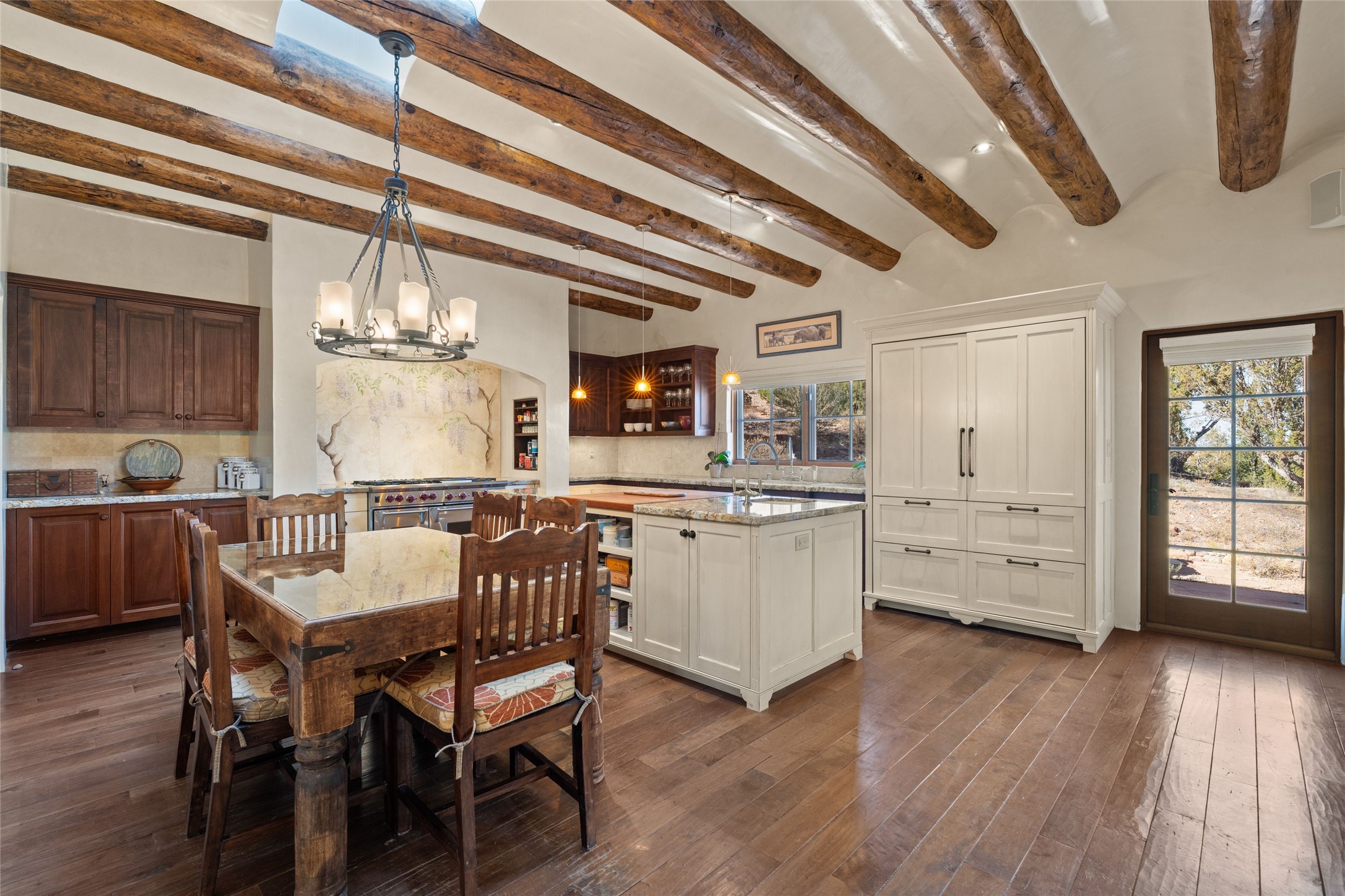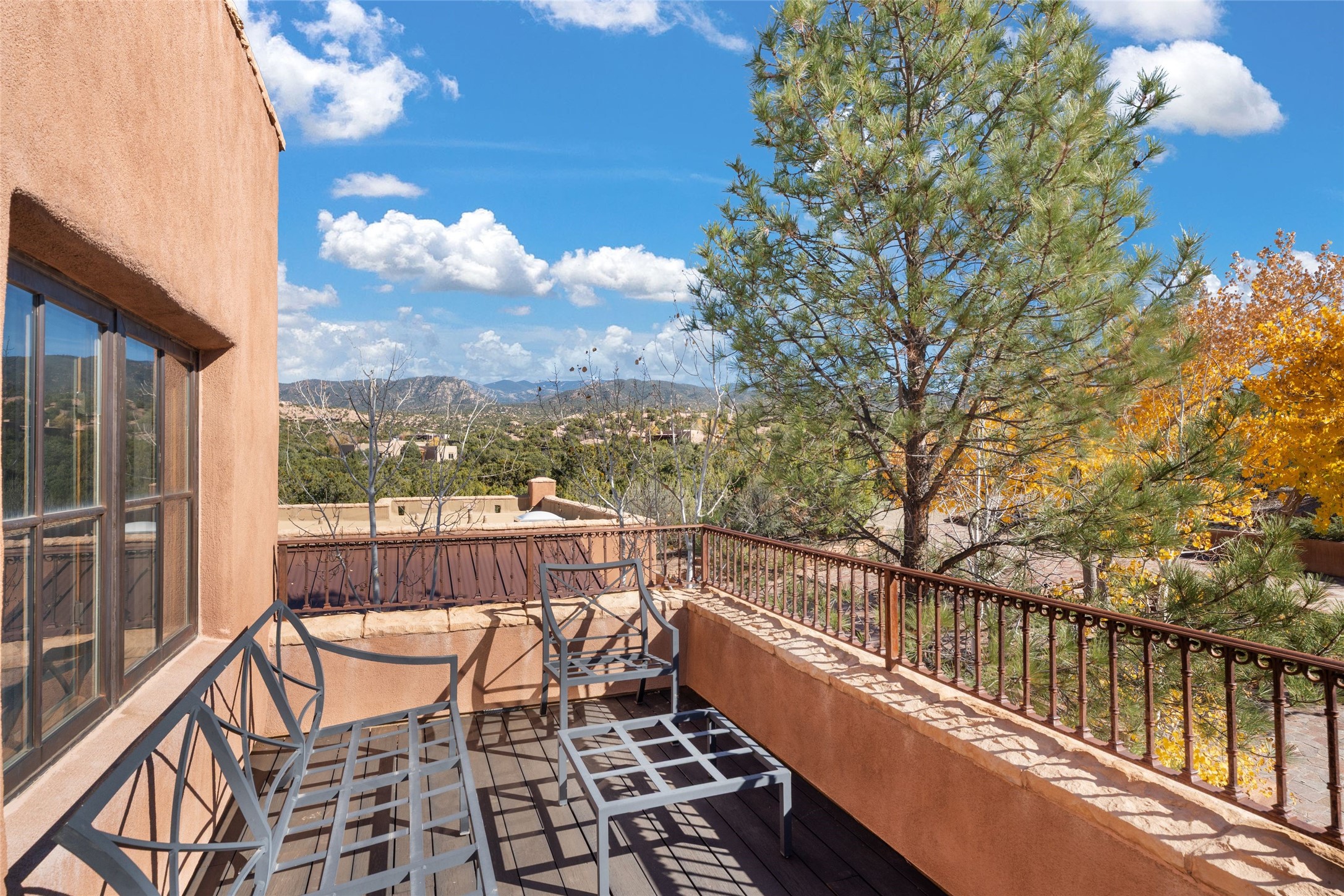 Backing up to breathtaking Tesuque Pueblo tribal land, this private and gated Tesuque property is a short drive to El Nido Restaurant, the famed Tesuque Village Market and the world-renowned Four Seasons Resort and Spa. The totality of the property consists of 13.24 +/- acres, with two separately deeded lots, two private wells, and a 5,112 +/- sq.ft. adobe and frame constructed home that exudes classic Santa Fe style and high-end craftsmanship. The home is multi leveled with two bedrooms and one bath upstairs and two bedrooms and two and a half baths on the main level. A separate office space is located near the owners suite with an additional private gallery room near the entry, perfect for quiet reflection. The basement has temperature and humidity controlled art or wine storage. Smooth plaster walls are awash with high desert light and mountain views evolve with the clouds. Formal living spaces open out onto delightful indoor/outdoor entertaining options of spacious portals that weave the beauty of nature into the living environment.This sensuous property was constructed with every attention to detail including hardwood and stone tile floors, vigas and beams, coved ceilings, custom wood doors, wood and copper windows, custom cabinetry, stone countertops, and 6 wood burning fireplaces both inside and outside. This idyllic property has plenty of potential with the adjacent vacant lot overlooking mountain and higher elevation views ideal for future improvements. This is an impressive retreat home completely tucked away in one of Santa Fe's finest locales.