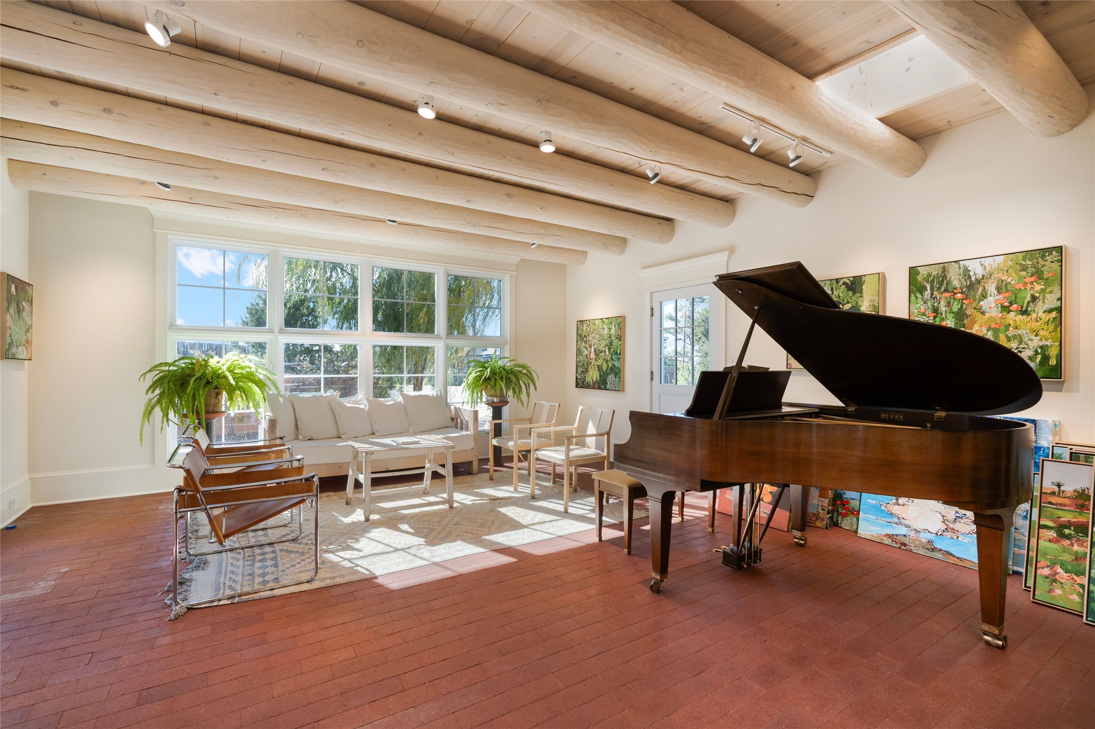 Built in 2019 in the desirable Museum Hill neighborhood, this is Doug Atwill's last home and is the culmination of his inspired sense of design over several decades. Discreetly nestled on a little over 1 maturely treed and impeccably landscaped acre, this 2,400 sq.ft. home was designed with over 50 years of personal love and experience, and built with a timelessness of exceptional Santa Fe character. Morning and afternoon sunlight wash the walls and wood floors in the substantial living and formal dining areas with high ceilings graced with white-washed rounded vigas and latillas. The adjacent eat-in kitchen is equipped with top of the line stainless steel appliances, granite counters, with glass French doors and windows showcasing the multi-seasonal gardens. The large owners bedroom, bath and study are spa-like in nature with access to private patios and a lovely entertaining loggia. The 800 sq.ft. art studio boasts brick floors, wrapped completely in warmth and sunlight from banks of double hung windows, French doors and skylights, and could be easily converted into another large bedroom. An oversized 2-car garage is tucked from the front elevation with plenty of guest parking on site. The home is equipped with two wood burning fireplaces, radiant floor heating, as well as forced air heating and cooling all on one level. A shared well aids in irrigation of the gardens. The outdoor spaces with sumptuous landscaping frame every corner of the property and bring the beauty of nature inside. The premier, private location, in addition to the high-end details of the home, embody an elevated and rewarding lifestyle worthy of those who simply require the best.