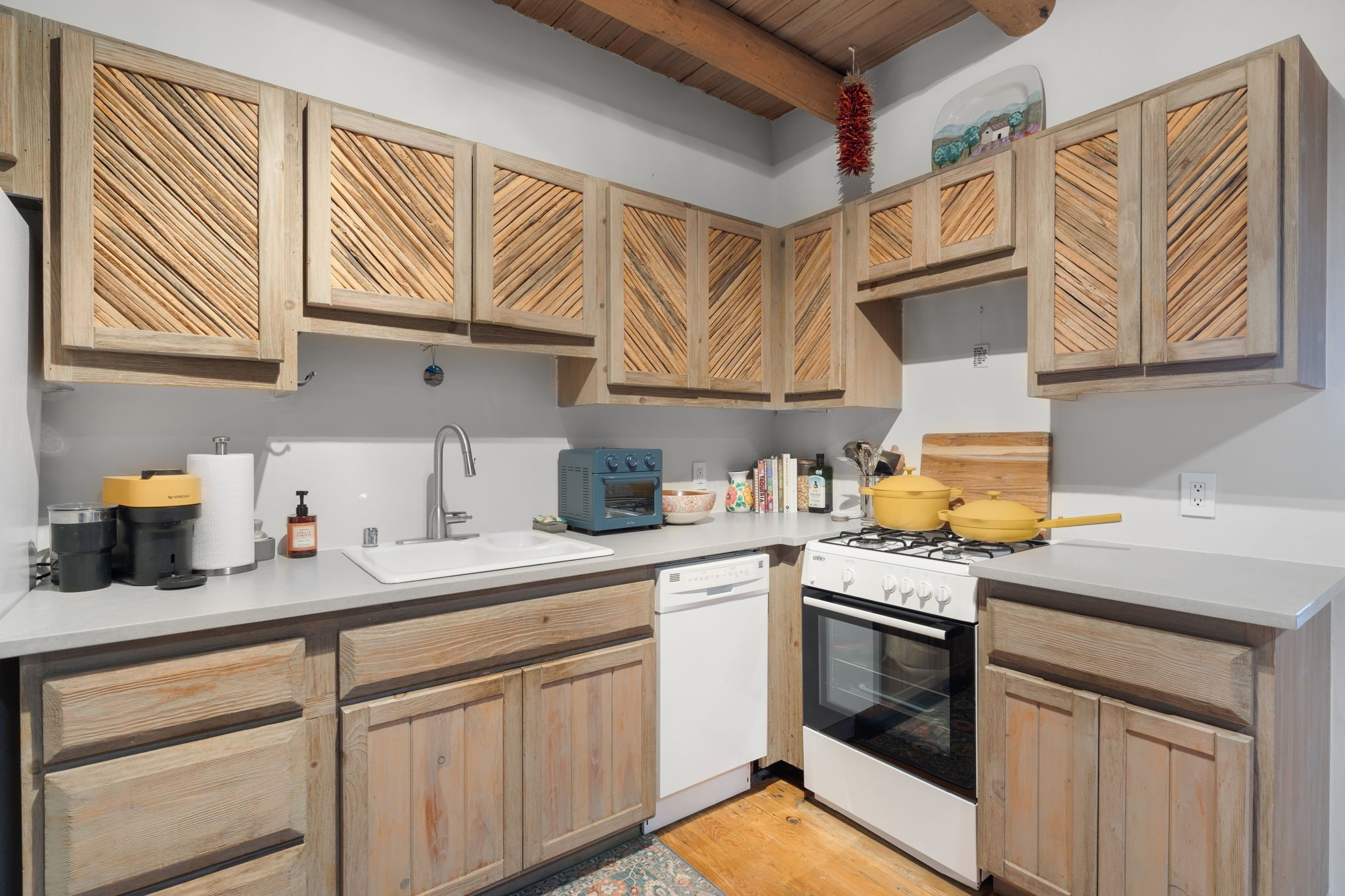 Updated 1 bed 1 bath condo in the heart of the Guadalupe Historic District. Warm Santa Fe style throughout with vigas, T and G ceilings, a kiva fireplace and pine plank floors. The kitchen is refreshed with quartz counters and solid storage. A private flagstone patio and garden give you real outdoor living space for dinner, coffee or quiet mornings. Single level, no interior steps and your own reserved parking spot. Close to the Railyard, the Plaza and Museum Hill.
