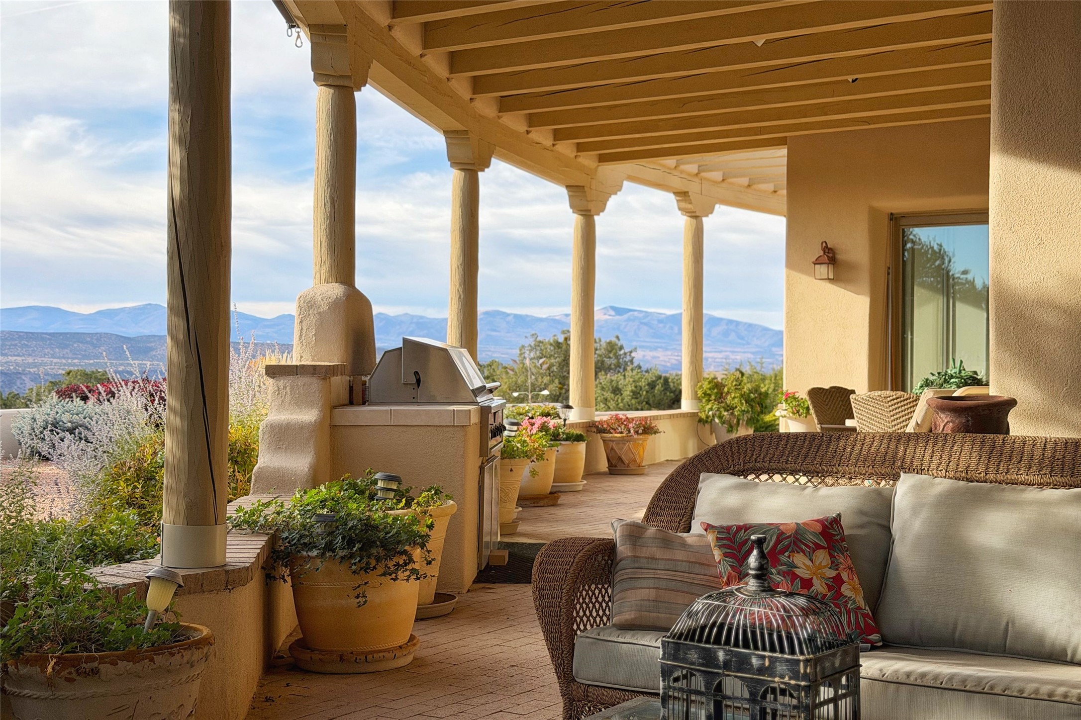 A long, private, winding driveway leads to this secluded, expansive hilltop retreat spanning 16.58 acre and showcasing unobstructed, panoramic sunrise & sunset views of the Jemez and Sangre de Cristo mountains- from inside and outside of the house. A sophisticated estate with detached studio/guest house and impressive 5 car garage encompasses 5,225 total sq ft in the equestrian friendly community of La Tiera Nueva. The 4,310 sq ft main home, with no steps, is introduced by a courtyard with a perennial garden, water feature and sculptures which leads inside to a dramatic galleria showcasing a great room with 10 floor-to-ceiling windows/doors, a gas fireplace and a entertainment center perfect for large gatherings plus a grand piano. The gourmet kitchen boasts a large center island, cozy eating area, gas fireplace and built-in bookcase. Perfect for large or intimate gatherings. The primary suite provides a quiet retreat with a sitting room, custom built-ins, dual walk in closets, picture windows and a spa-style bath with soaking tub and separate showers and views of the Jemez mountains. Two ensuite guest rooms, a powder room and laundry room complete the main home. Outside, an expansive portal spans the length of the home, and features two wood-burning fireplaces and semi-enclosed dining and seating areas capturing the views of the Jemez Mountains, ideal for year round enjoyment. The detached 915 sq ft. studio/guest house offers a flexible, light filled space with a fireplace, kitchen, walk-in closet, and 3/4 bath. All suitable for creative work, guests or multi-generational use. Two extra large bedrooms could be easily created in the studio. The landscaped grounds include sculptured gardens, water features, contemporary stone elements, and an orchard with a variety of trees, plus space for a horse barn to be built. Only 20 minutes to the Santa Fe airport and renowned Plaza, La Tierra Nueva provides manned security, gated privacy, and on-site tennis & pickleball.