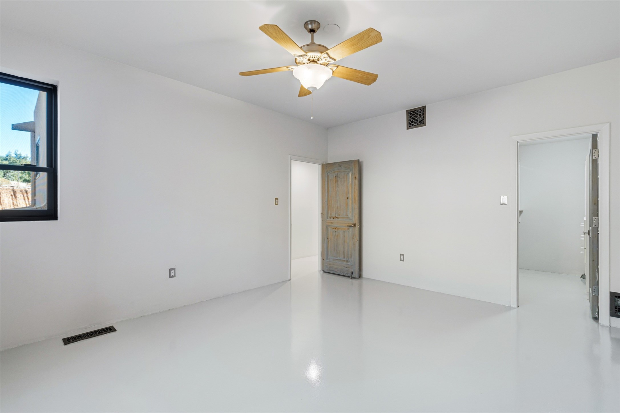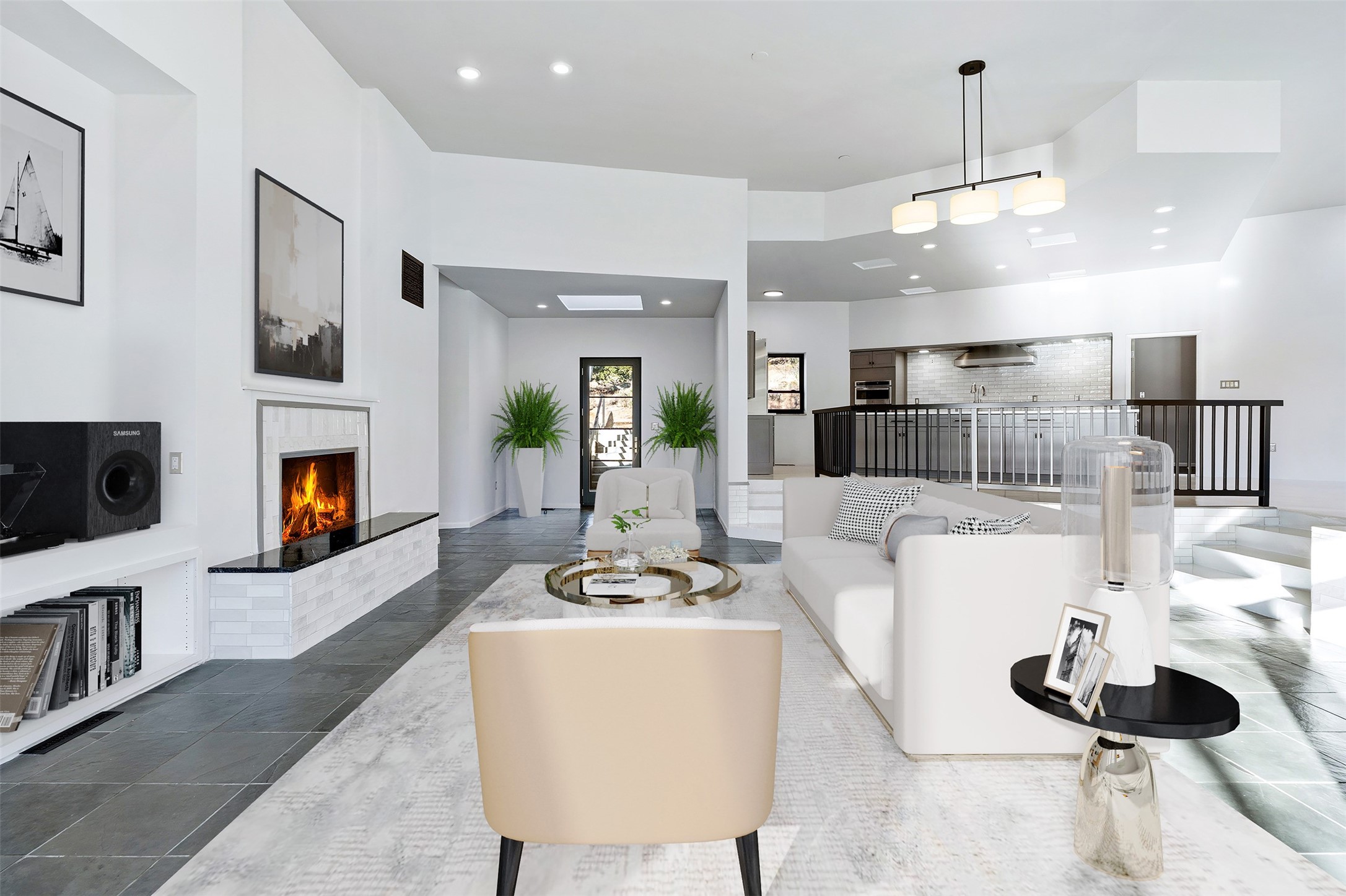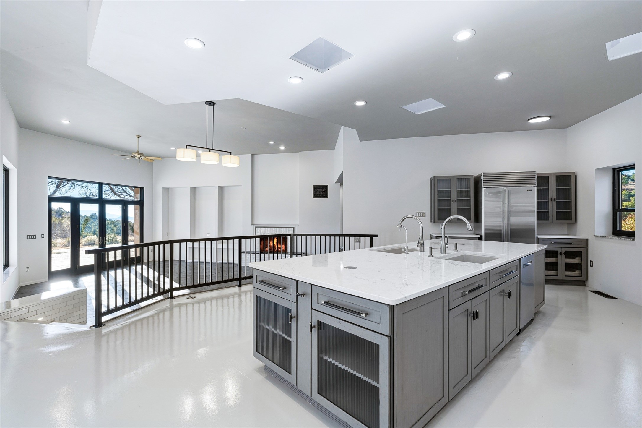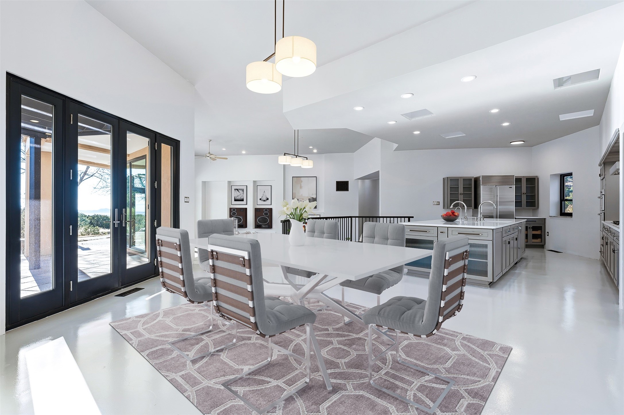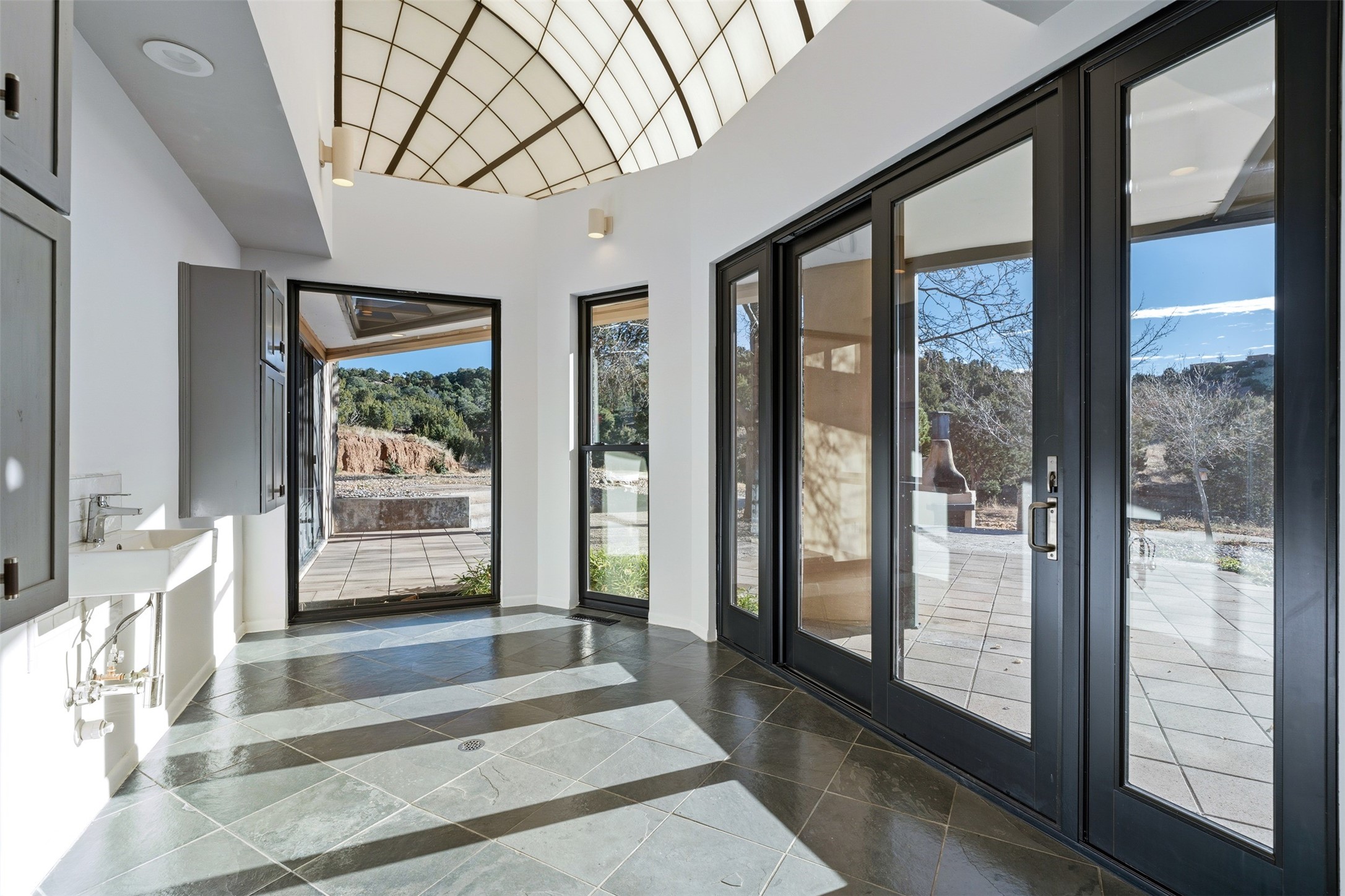 Designed by noted architect John Klee, this 4,300-square-foot 4 bedroom residence embodies the clean lines and luminous spaces of late-century modern design. The home rests gracefully within the contours of Arroyo Hondo Vistas, opening to generous portals and patios that frame sweeping mountain and high-desert views. A landscaped approach sets the tone--mature trees, natural stone, and a low-profile stucco and rock faade emerges as the home comes into sight. Tucked into the terrain, a series of descending steps leads to the front entry. Inside, an expansive great room unfolds beneath high ceilings, where slate floors, a fireplace, and a full wall of custom shelving anchor the space. Huge glass doors and windows dissolve the boundary between indoors and out, creating a luminous, seamless connection to the surrounding landscape. The grand kitchen features generous granite surfaces, a breakfast bar, and excellent flow for both cooking and entertaining. Nearby, the formal dining area offers the first view of one of the home's most distinctive architectural elements: a conservatory crowned by a softly arched, translucent ceiling. The expansive owner's suite includes a sitting area, a walk-in closet, large fireplace, and a well-appointed bath with free-standing tub, double vanity, and walk-in shower. Returning to the main living area, a gently sweeping hallway leads to a wing with two bedrooms, each with walk-in closets, a guest bathroom, and a flexible room that can be used as an office, studio, or exercise room. Nearly every room features large windows and/or patio doors opening to the expansive, view-rich outdoor spaces, creating a lifestyle centered on indoor-outdoor living and quiet retreat. Numerous skylights illuminate the interior throughout. Other features include central air conditioning, forced-air heating, and a gated entry. Some rooms have been digitally staged.