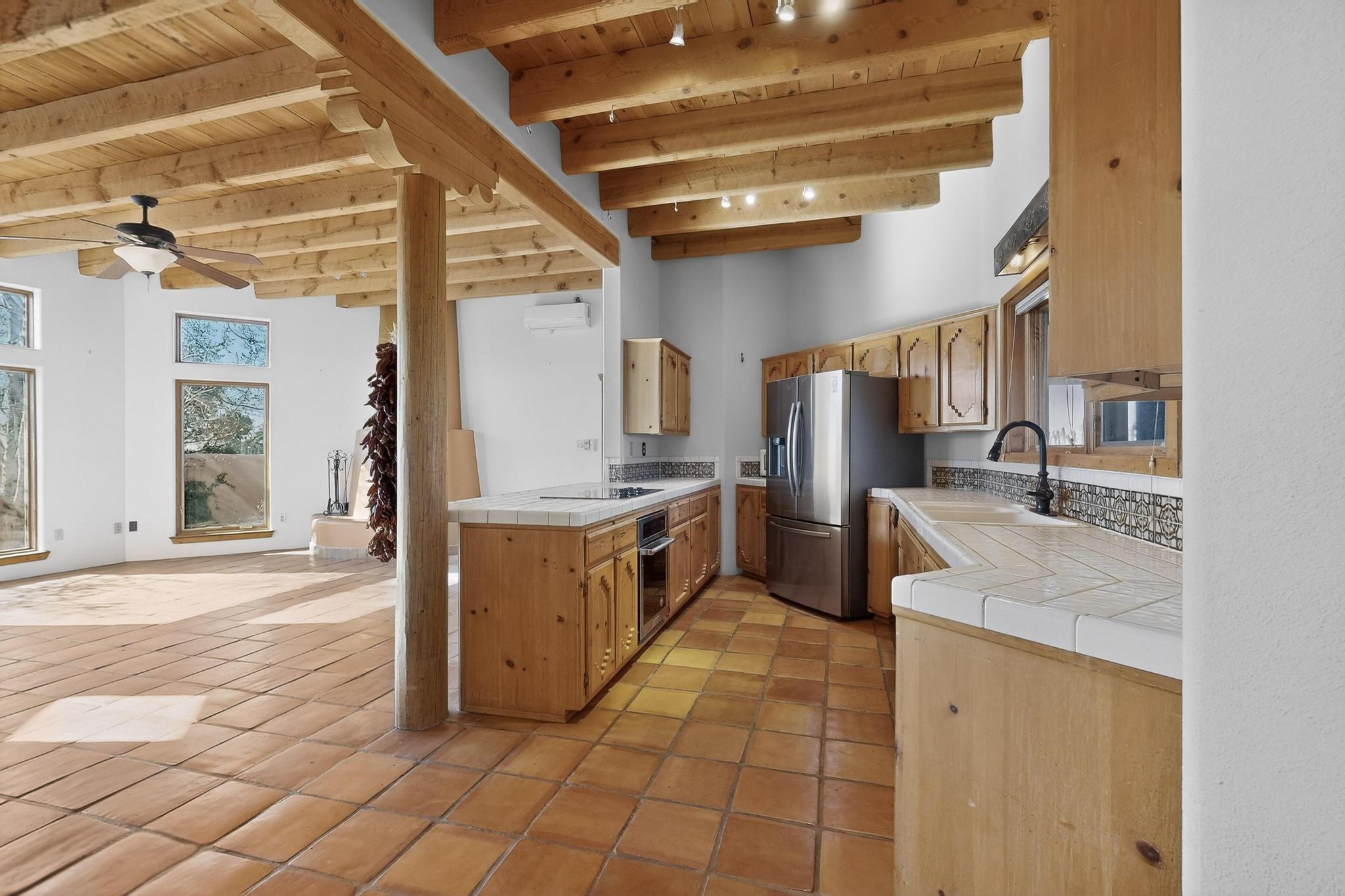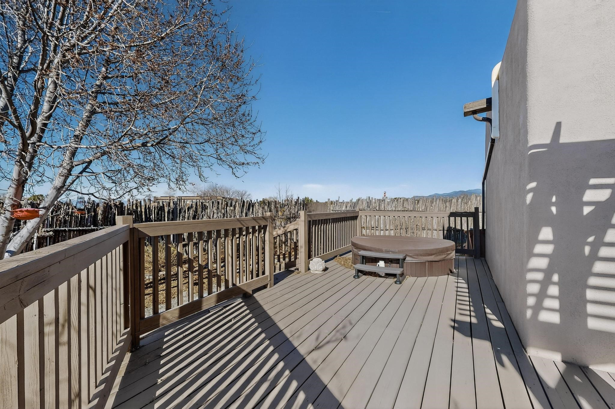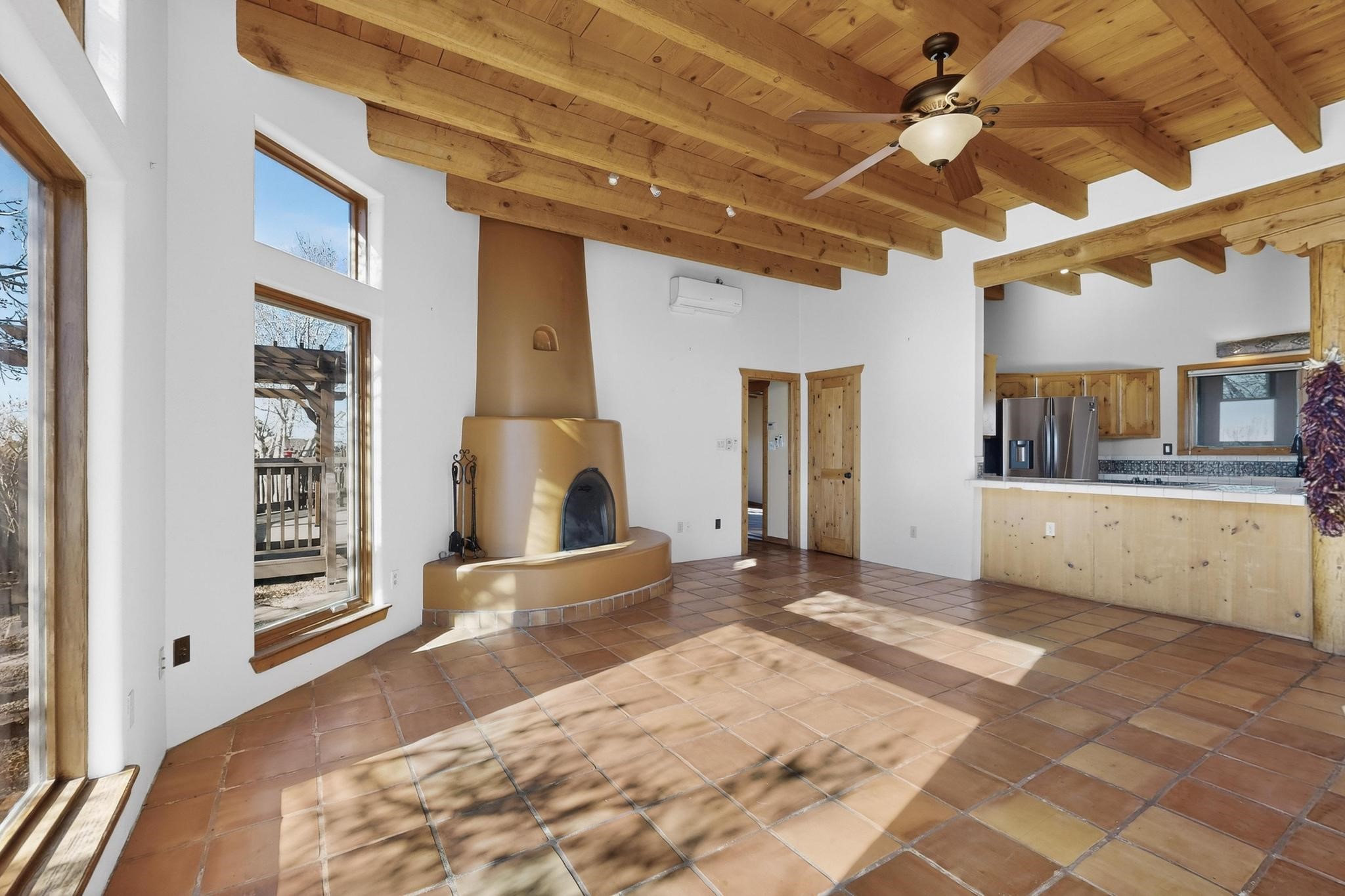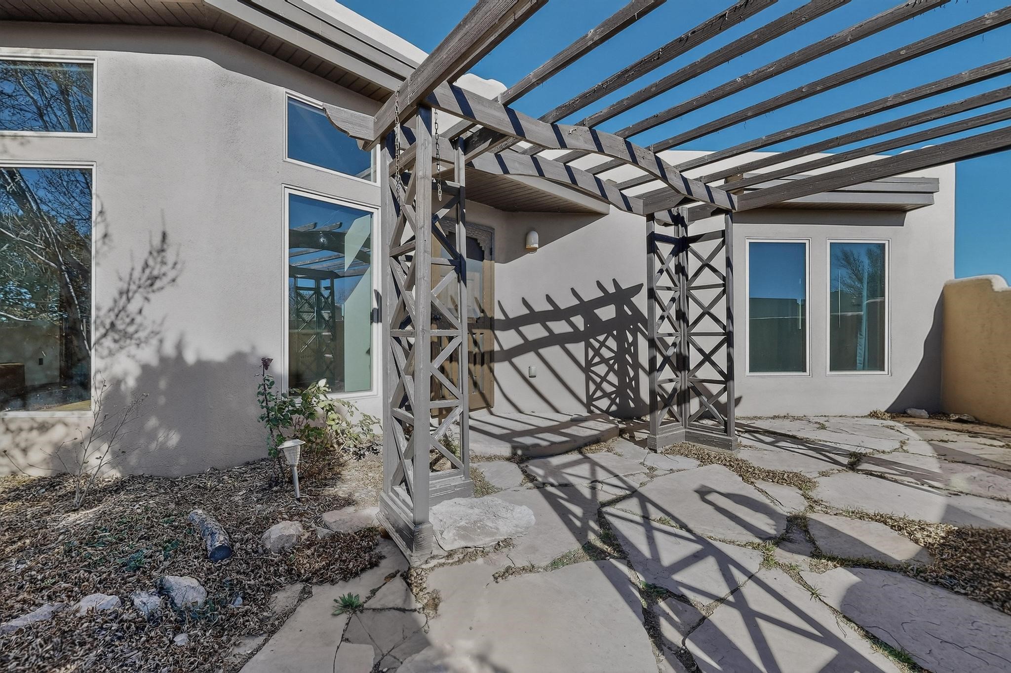 Open plan, split bedroom passive solar Eldorado cottage custom built by Santa Fe Solar homes. Beam ceilings, gleaming saltillo tile floors, a traditional kiva fireplace creates the Santa Fe ambience and warmth of character. Filled with sunlight this single level home has no steps to negotiate and flows easily from great room to kitchen/dining areas. The polybutylene radiant heating system is supplemented by mini splits which add a layer of comfortable air conditioning for summer cool. The main bedroom flows to a deck with hot tub and the guest bedroom is separated by the living areas for ultimate privacy. There is a separate study/ den with a vaulted ceiling which flows to a privately fenced rear yard and a summer enclosed atrium. There is 2 car garage plus plenty of guest parking. This home is located on the west side of Eldorado close to paved road and has access to all Eldorado amenities, close to local shopping centers and is within easy reach to Santa Fe.
