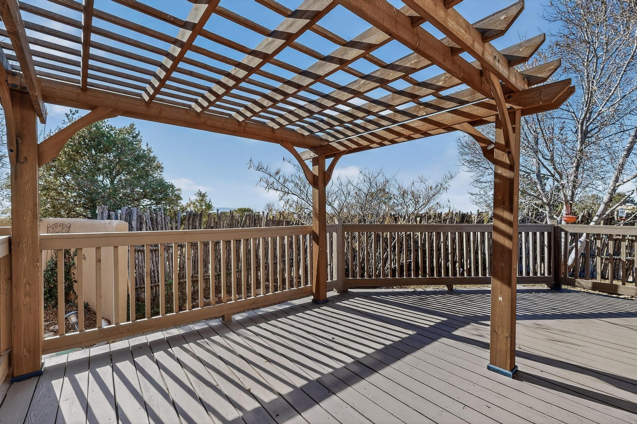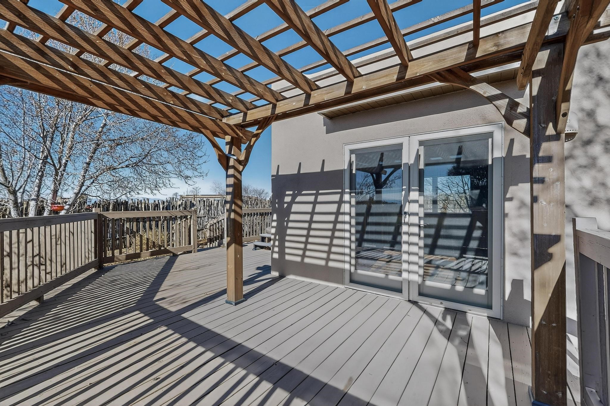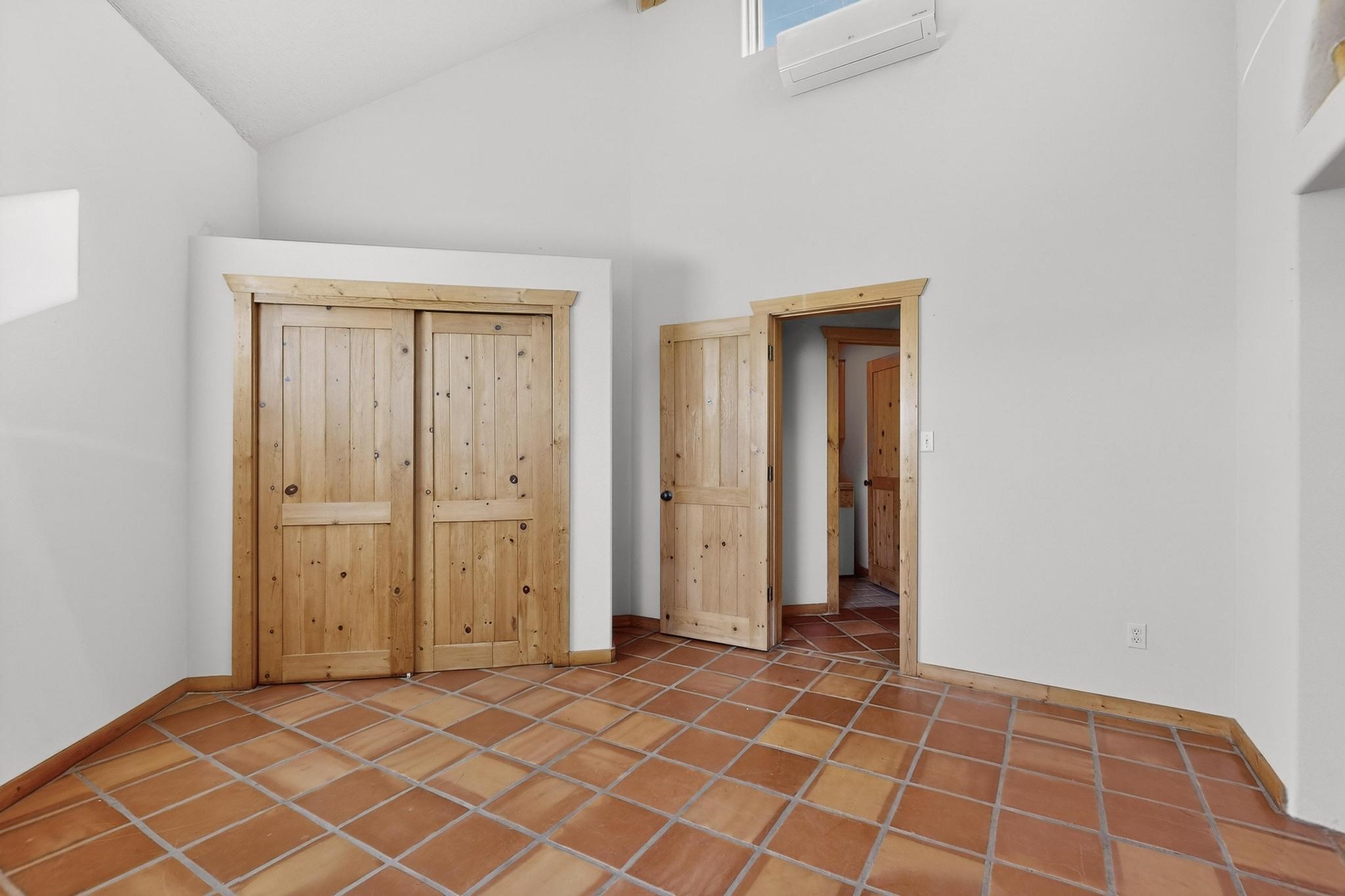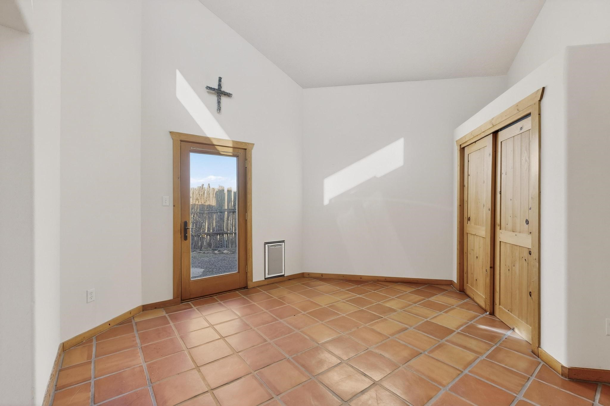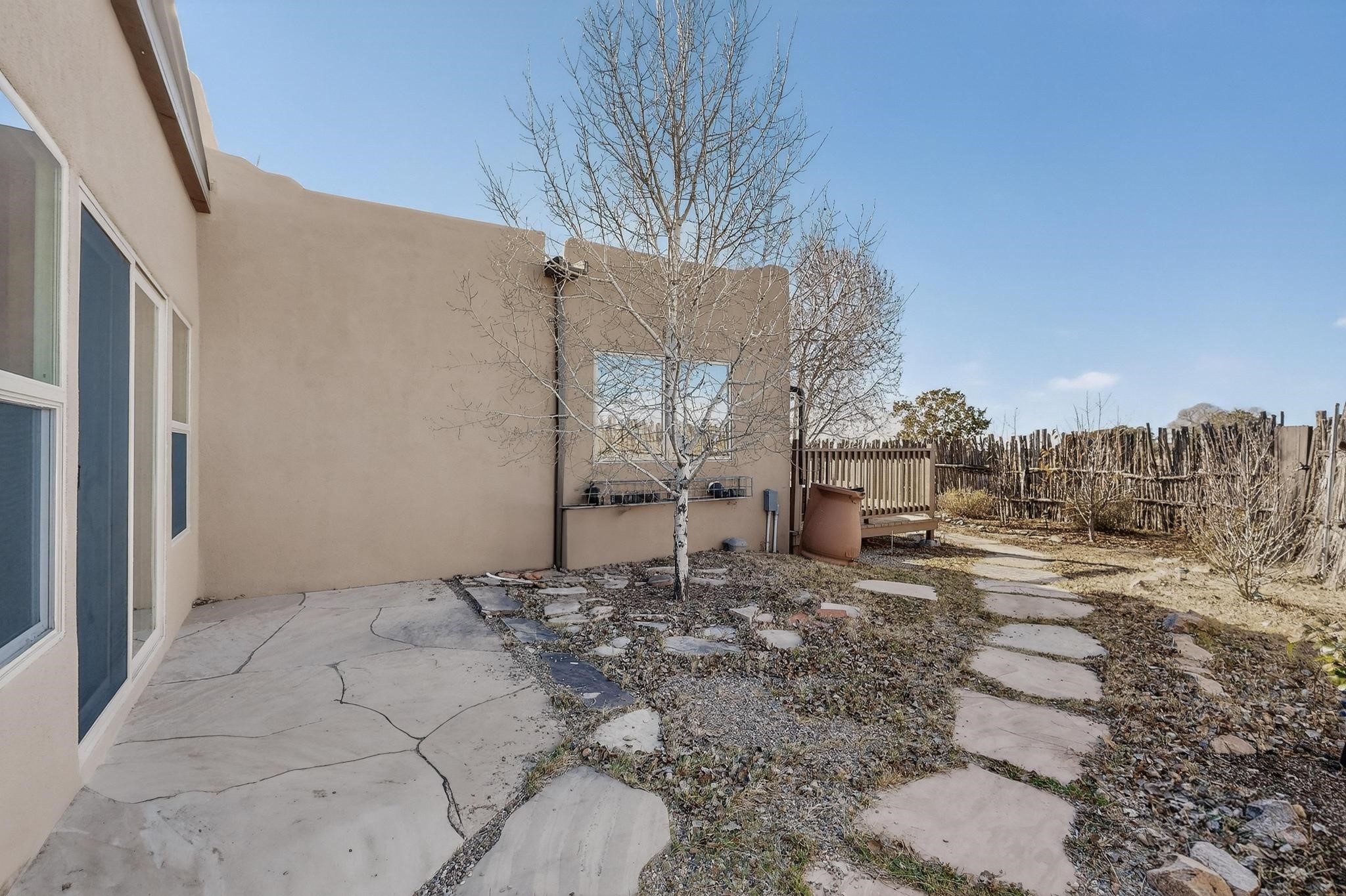Open plan, split bedroom passive solar Eldorado cottage custom built by Santa Fe Solar homes. Beam ceilings, gleaming saltillo tile floors, a traditional kiva fireplace creates the Santa Fe ambience and warmth of character. Filled with sunlight this single level home has no steps to negotiate and flows easily from great room to kitchen/dining areas. The polybutylene radiant heating system is supplemented by mini splits which add a layer of comfortable air conditioning for summer cool. The main bedroom flows to a deck with hot tub and the guest bedroom is separated by the living areas for ultimate privacy. There is a separate study/ den with a vaulted ceiling which flows to a privately fenced rear yard and a summer enclosed atrium. There is 2 car garage plus plenty of guest parking. This home is located on the west side of Eldorado close to paved road and has access to all Eldorado amenities, close to local shopping centers and is within easy reach to Santa Fe.