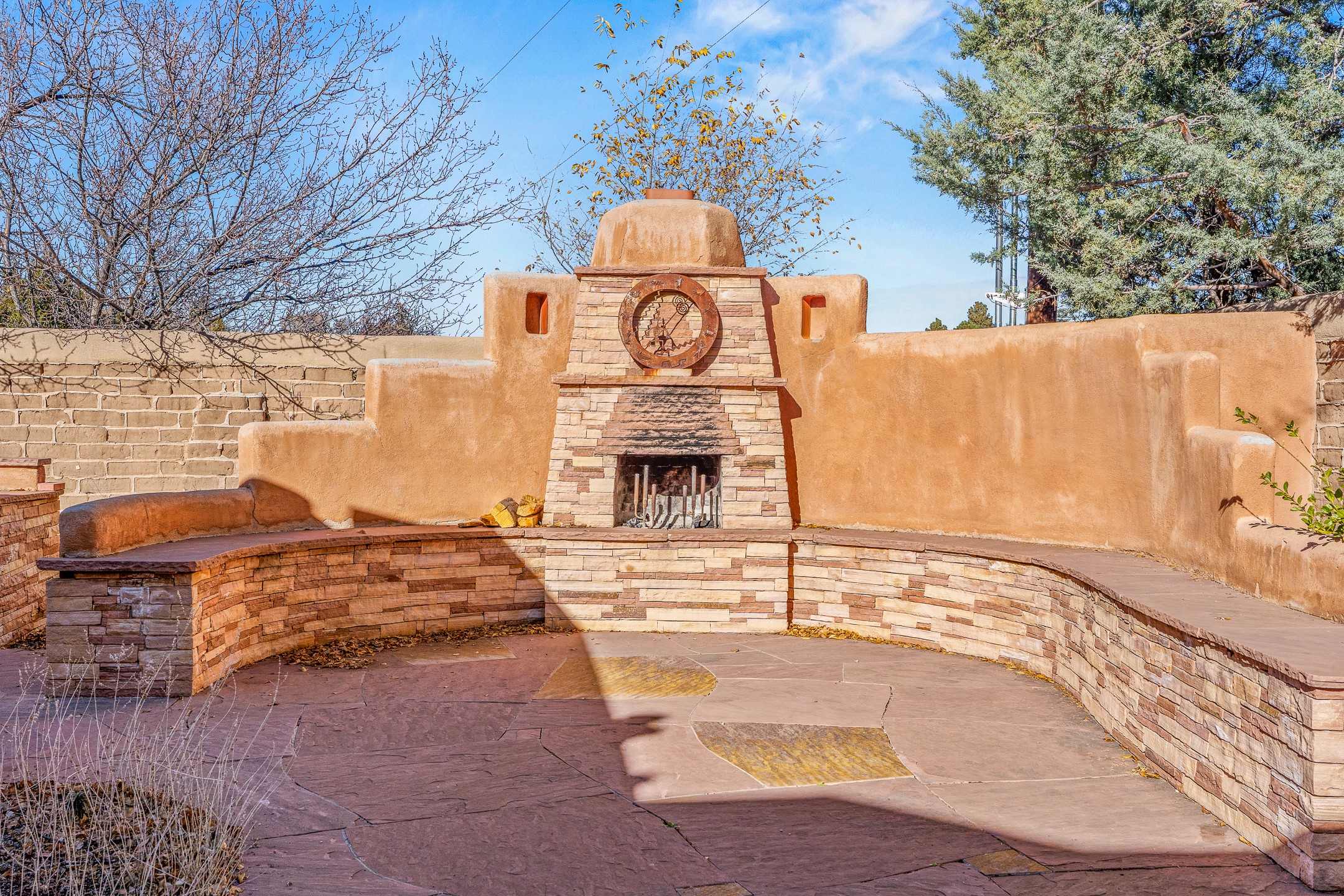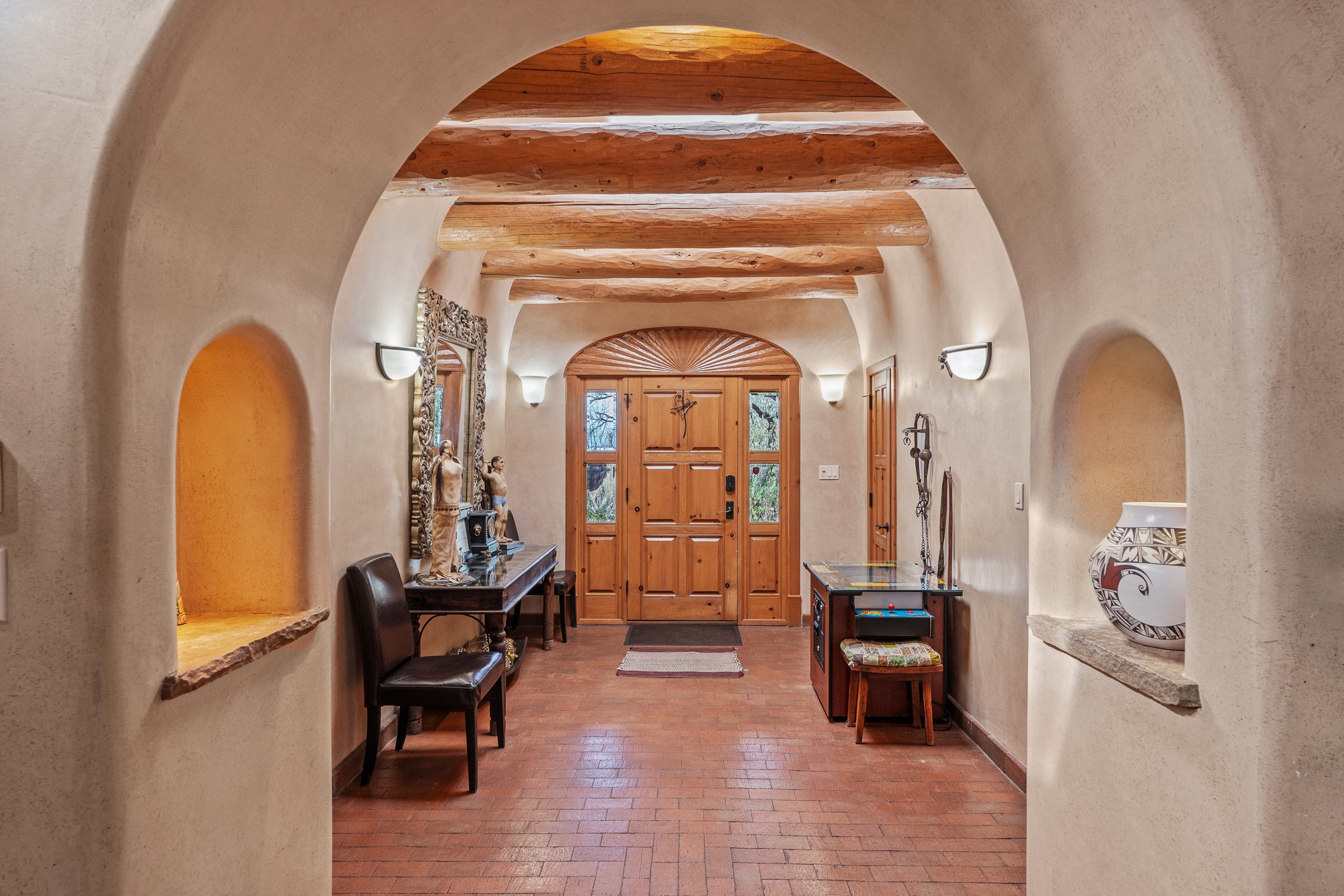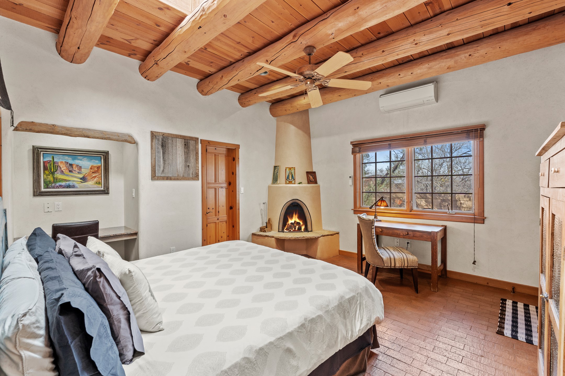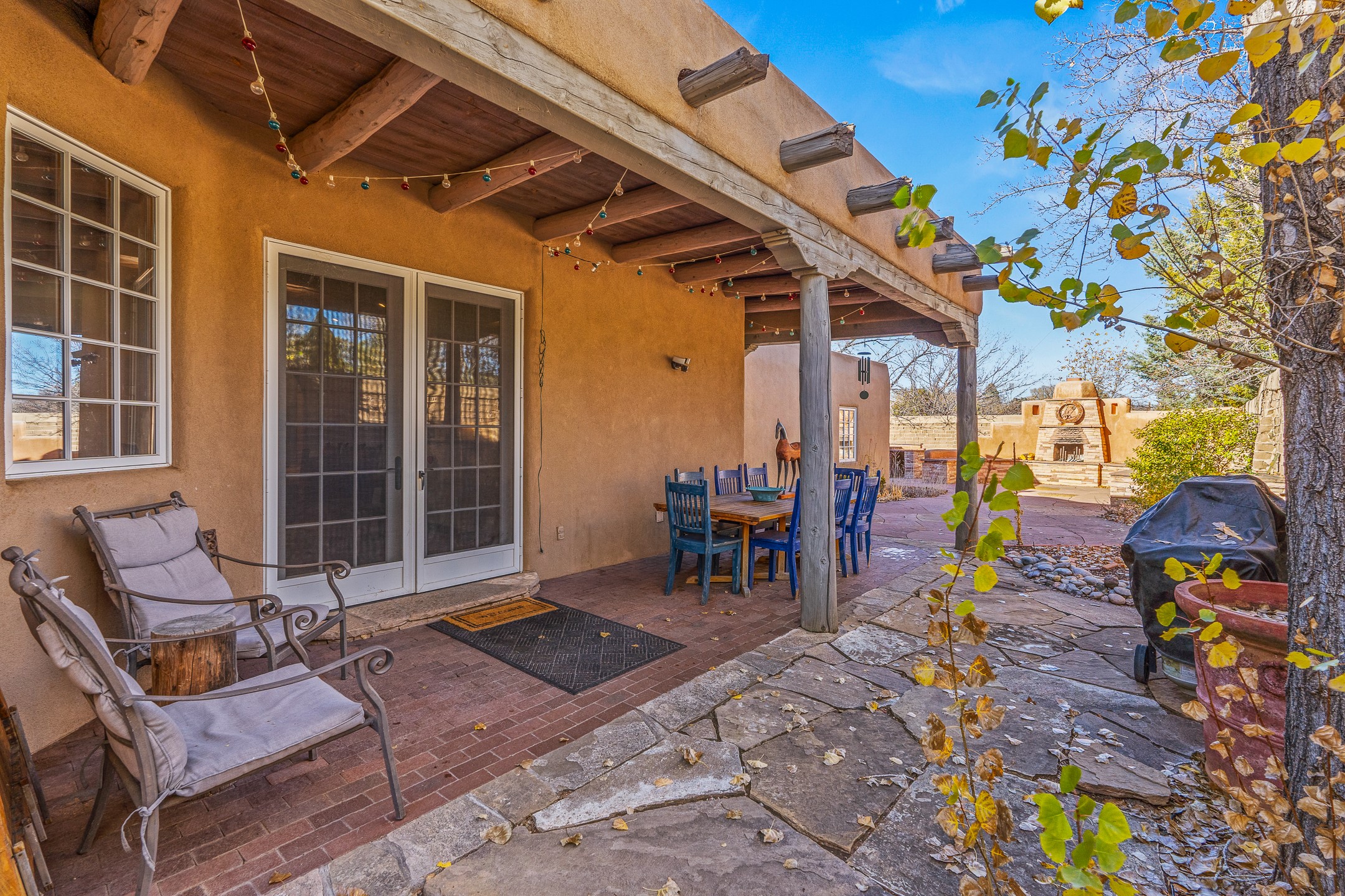 Nestled on a quiet cul-de-sac in Santa Fe's coveted South Capitol neighborhood, this beautifully crafted 3,600 sq. ft. single-level home offers 5 bedrooms, 3 bathrooms, and an attached studio/workshop. Sited on a rare 0.4-acre lot, the home provides generous space for entertaining while still maintaining an intimate, welcoming feel. Enclosed by a handsome adobe wall, the property offers both privacy and timeless Southwestern character--all just minutes from downtown and Wood Gormley Elementary.The home's central living space features a warm and inviting blend of Santa Fe style and spacious flow. Vigas, rough cut wood ceilings, and a commanding fireplace define the living room, while classically arched openings with corbels subtly distinguish the open kitchen, dining, and den areas--offering connectivity with architectural charm. A large den--just off the living room--provides additional living space, perfect for a media room or library/office space. A separate studio/workshop is another perfect space for an in-home office, gym or studio. The home's thoughtful floor plan includes two guest wings, with 2 bedrooms/1 bathroom in each guest area. The primary suite is privately situated in the SouthEast corner of the property with plenty of light and outdoor connectivity and features a wood-burning kiva fireplace, a spacious bathroom with a jetted soaking tub and walk-in shower. Outdoor spaces include a wraparound portal, a thoughtfully landscaped South yard area with a large kiva firepit and a North yard has a second outdoor fireplace, a built-in barbecue and portal that is perfect for outdoor dining. The home features an attached 2-car garage, in-floor radiant heat throughout and mini-splits for cooling. This special property combines scale, privacy, and Santa Fe charm in one of the city's most desirable neighborhoods--truly a rare find.