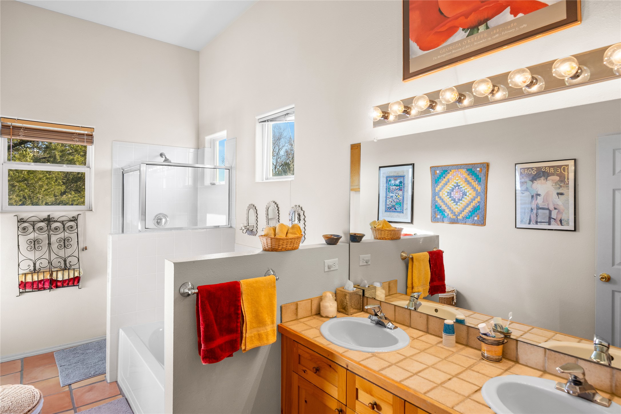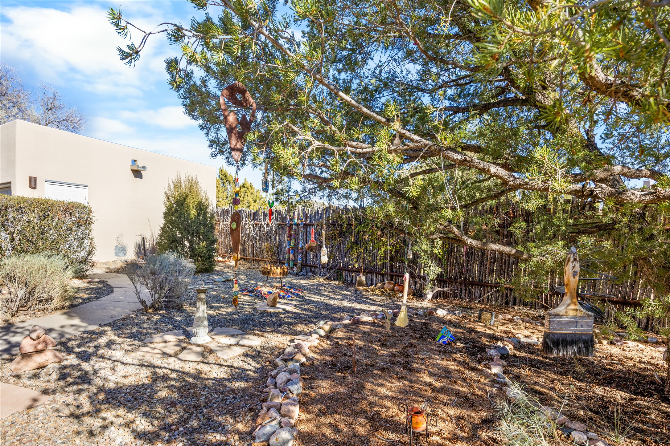 Get ready for this lovely, well cared for single level home in Nava Ade! Sited on a sizeable lot bordered on two sides by green space and adjacent to the walking path, this property features all the interior and exterior comforts that allow for authentic Santa Fe living. Enter through a sweet portal to a spacious Living Room with high ceilings adorned with wood beams. A decorative wall, which sports a two-sided gas fireplace, separates the Living Room and oversized Dining Room/Sitting Room. A wall of tall windows with wooden blinds graces this area. Beautiful Saltillo tile flooring adds to the warmth and Southwestern feeling of these rooms. Exit the Living Room through sliders that lead to a charming portal, ideal for outdoor entertaining. The whimsical rear yard provides a delightful retreat year-round! Custom shelving in all bedroom closets, and owner-made tin accents for the home's vertical blinds are thoughtful and creative touches. In addition to miles of walking paths, enjoy the community clubhouse, pool and gym. This much loved, special home will enchant its next lucky owner.