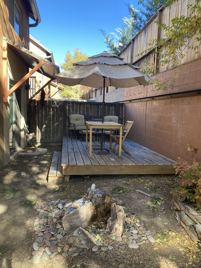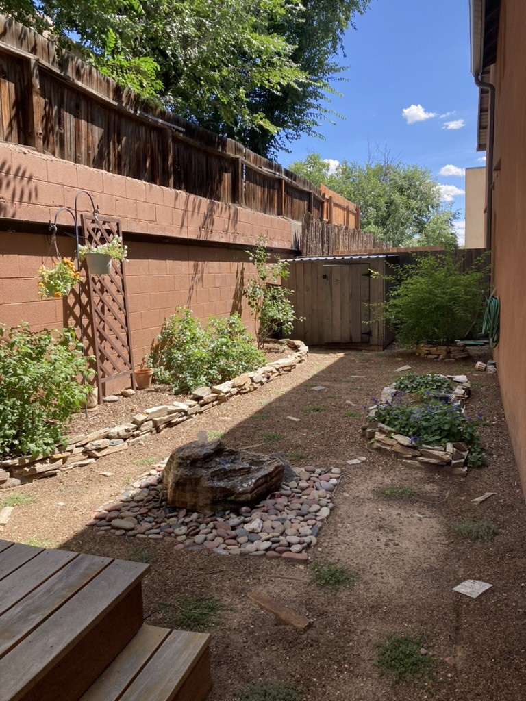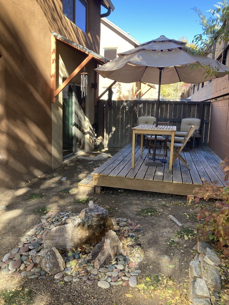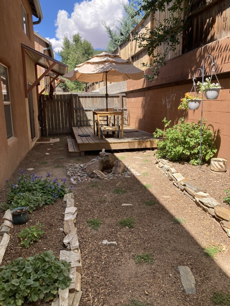 Discover an exceptional blend of comfort, style, and location at this beautifully upgraded 4 bed, 2 bath residence in River Trail Lofts. With direct access to the Santa Fe River Trail from your front door, this lightly used 1,877+/- sq ft home offers bright, inviting living spaces and a thoughtful two-story layout. Interior features include radiant heat, real red oak flooring, high and vaulted ceilings, deep closets, upgraded kitchen appliances, and top down bottom up cellular blinds throughout. The kitchen and baths feature padded gym flooring for added comfort, with tile in the laundry room. The private backyard has been transformed into a serene outdoor retreat with a custom hardwood deck, fountain, custom storage shed, flower beds, new ground coverings, shrubs, and automated irrigation. It feels like a true extension of the living space and works well for quiet enjoyment or outdoor dining. Ample parking adds to the convenience. River Trail Lofts is tucked below Alameda with no through street, offering a peaceful setting with minimal traffic while still being minutes from downtown, the Railyard, shopping, and the airport. The seller is open to conveying the home furnished, including art, rugs, TV, dishware, and washer dryer, which can create a seamless turnkey move-in experience or investment opportunity. All furnishings would be sold separately under a separate agreement. The seller would like to close near the end of March 2026.
