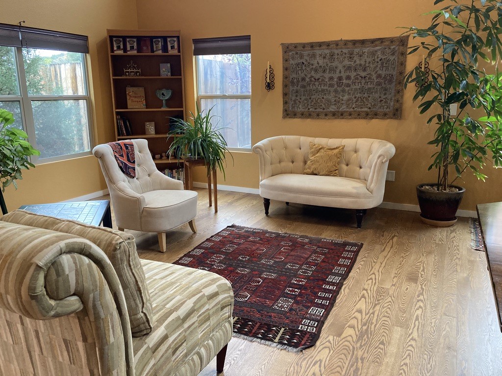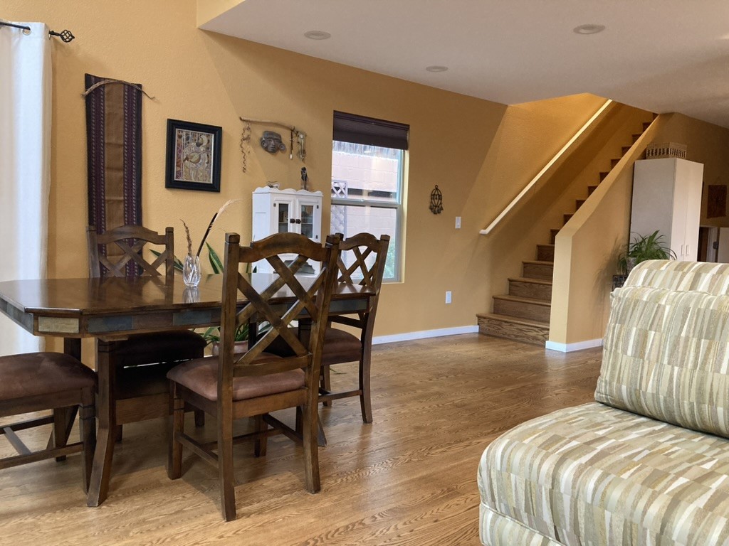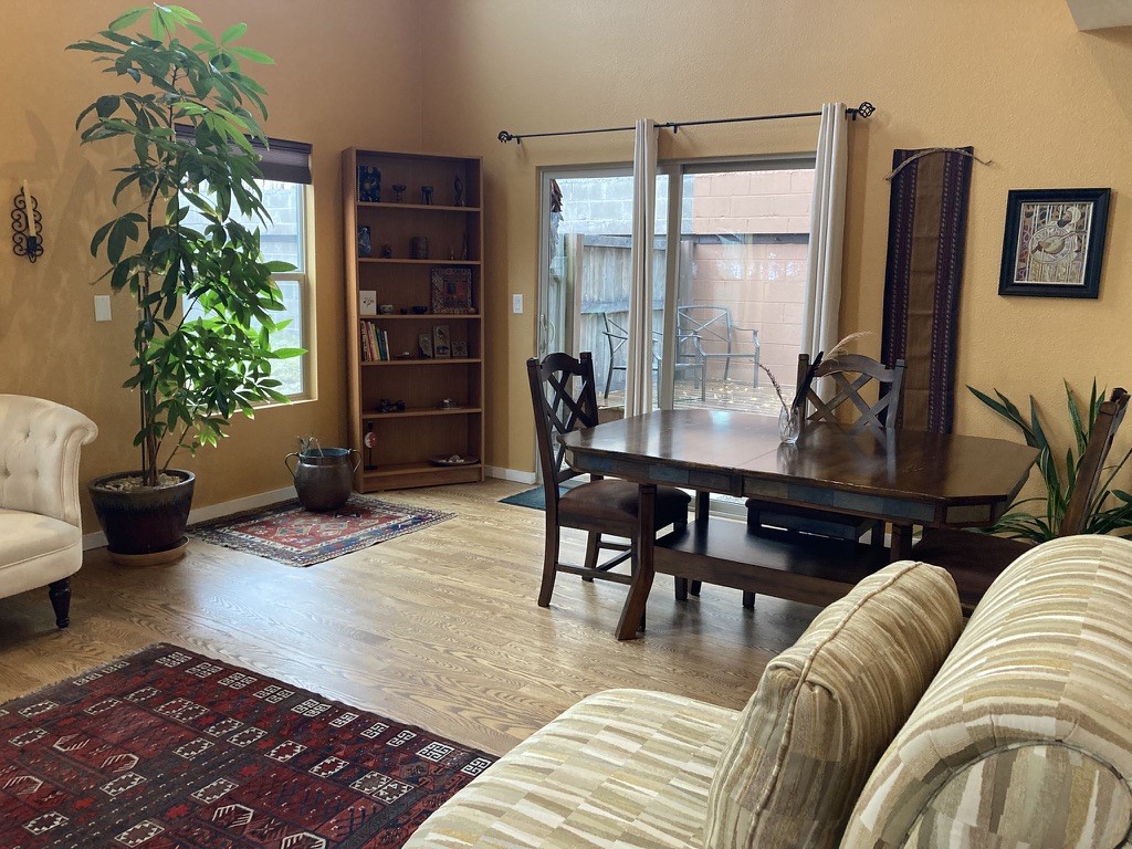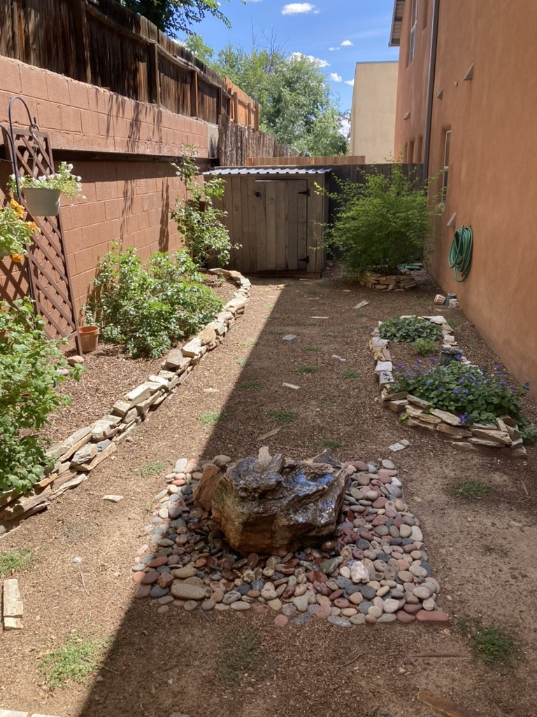 Discover an exceptional blend of comfort, style, and location at this beautifully upgraded 4 bed, 2 bath residence in River Trail Lofts. With direct access to the Santa Fe River Trail from your front door, this lightly used 1,877+/- sq ft home offers bright, inviting living spaces and a thoughtful two-story layout. Interior features include radiant heat, real red oak flooring, high and vaulted ceilings, deep closets, upgraded kitchen appliances, and top down bottom up cellular blinds throughout. The kitchen and baths feature padded gym flooring for added comfort, with tile in the laundry room. The private backyard has been transformed into a serene outdoor retreat with a custom hardwood deck, fountain, custom storage shed, flower beds, new ground coverings, shrubs, and automated irrigation. It feels like a true extension of the living space and works well for quiet enjoyment or outdoor dining. Ample parking adds to the convenience. River Trail Lofts is tucked below Alameda with no through street, offering a peaceful setting with minimal traffic while still being minutes from downtown, the Railyard, shopping, and the airport. The seller is open to conveying the home furnished, including art, rugs, TV, dishware, and washer dryer, which can create a seamless turnkey move-in experience or investment opportunity. All furnishings would be sold separately under a separate agreement. The seller would like to close near the end of March 2026.