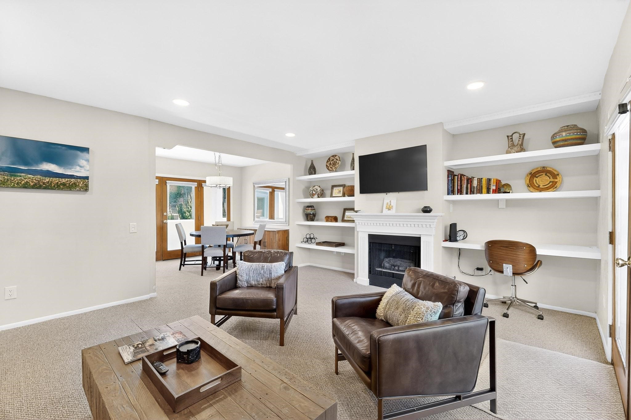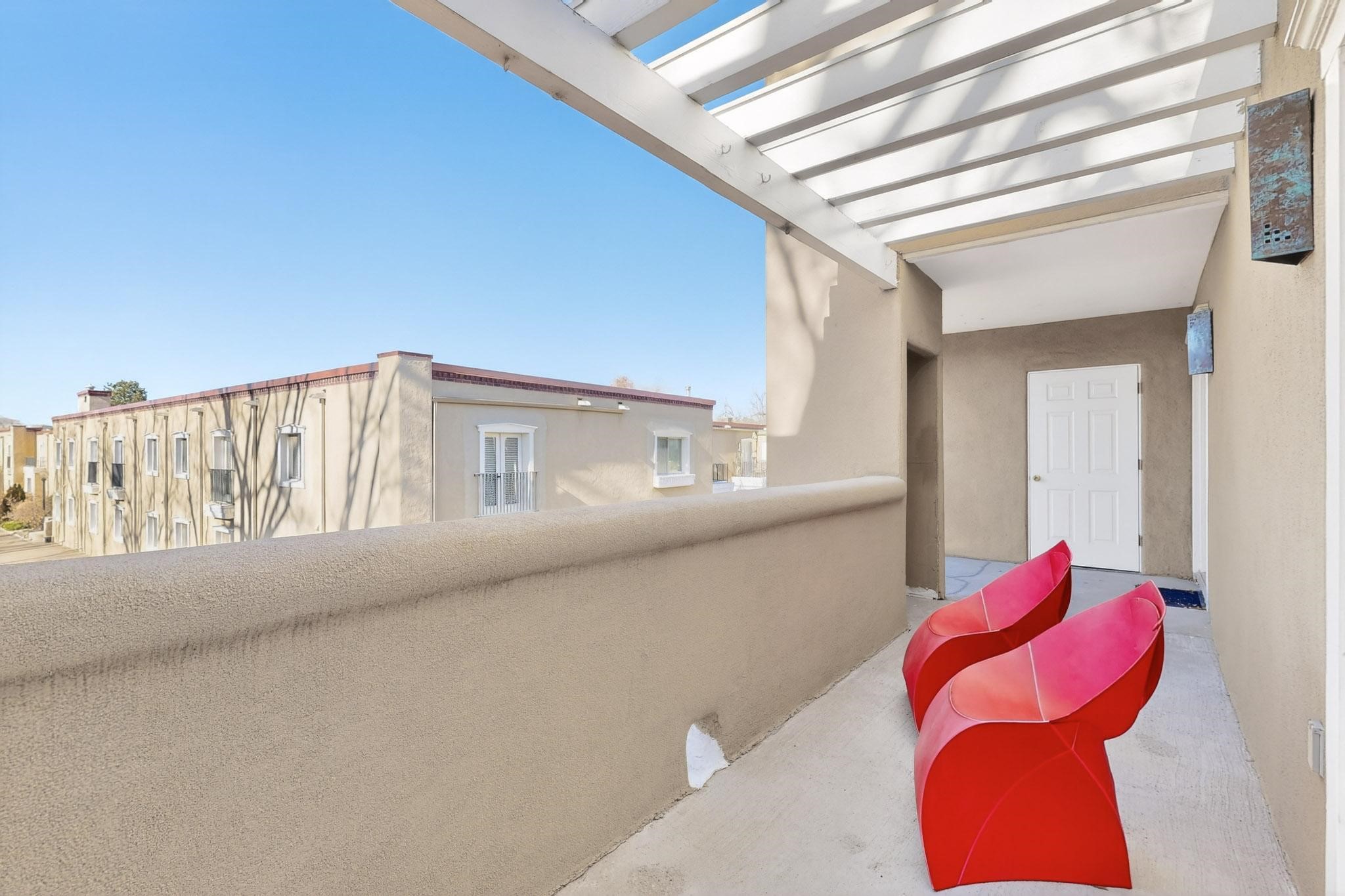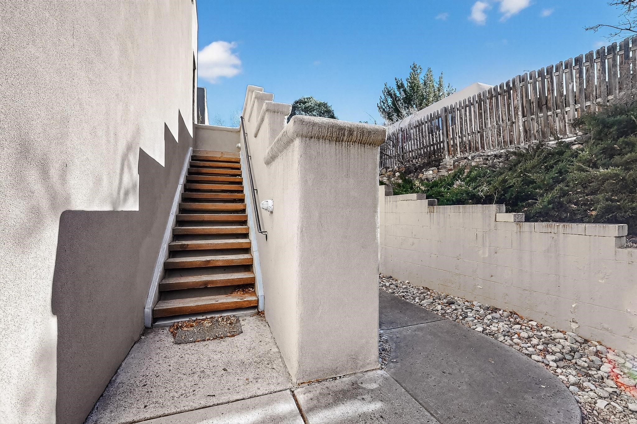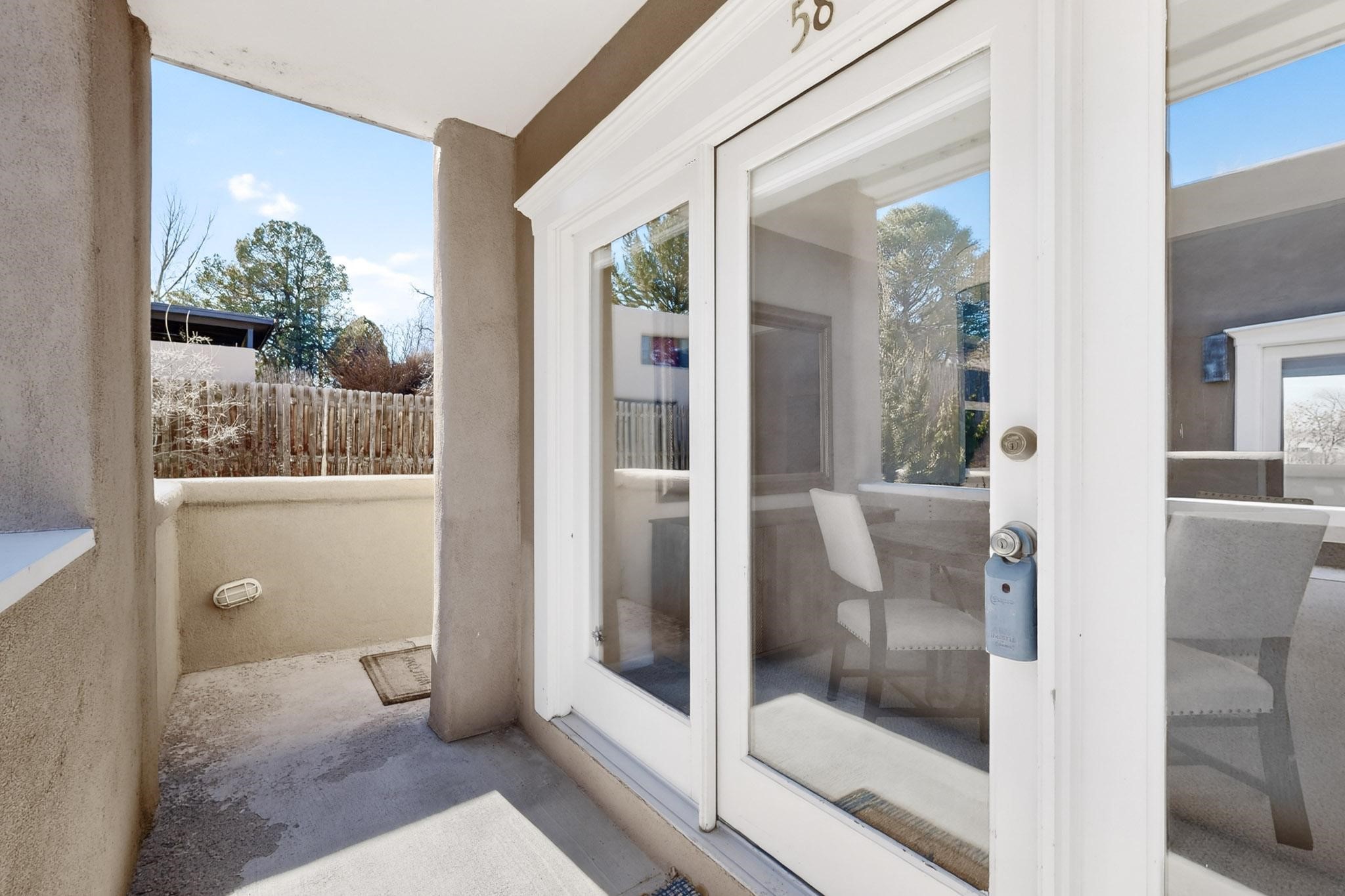 Just in time for the holidays in Santa Fe! Ideally located just six blocks from the Santa Fe Plaza, this spacious one-bedroom, one-bath condominium offers rare walkability paired with privacy and quiet. Situated on the second floor at the back of the complex, this corner unit enjoys a peaceful setting along with a covered, dedicated parking space. Thoughtfully upgraded throughout, the home features granite countertops, stainless steel appliances, new wood flooring in the kitchen and bath, diamond plaster walls, and updated lighting. Built-in bookcases flank the cozy gas fireplace, adding both charm and function. French doors open to a tranquil patio with two private storage closets, creating an inviting indoor-outdoor flow. Additional highlights include central heating and air conditioning, a second balcony, and an HOA that covers exterior maintenance, landscaping, and gated security, making this an easy full-time residence or a perfect Santa Fe lock-and-leave. A furniture package is available with a satisfactory offer, allowing for a seamless move-in experience.