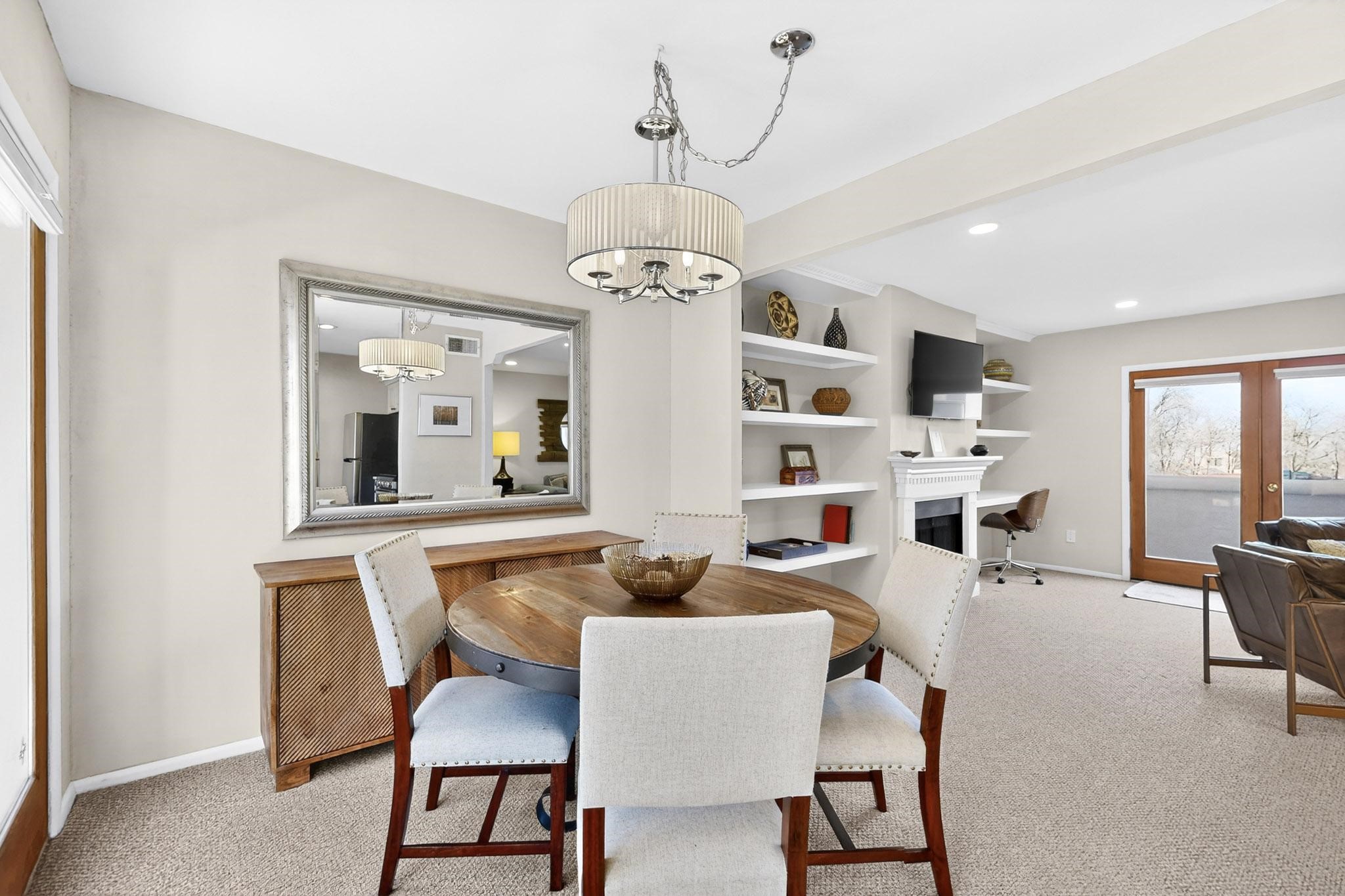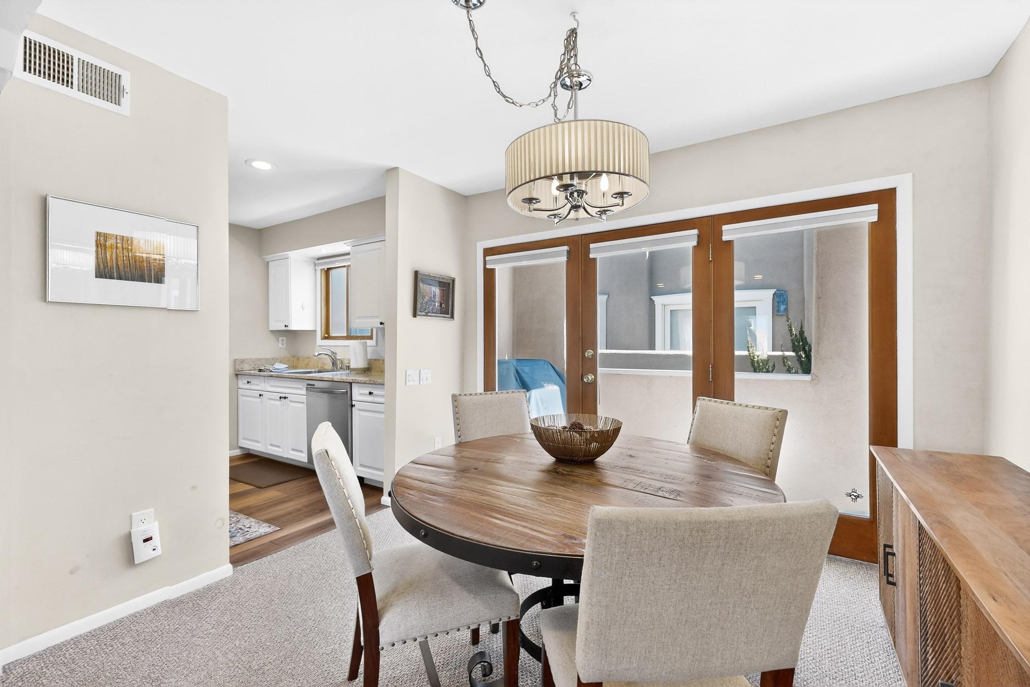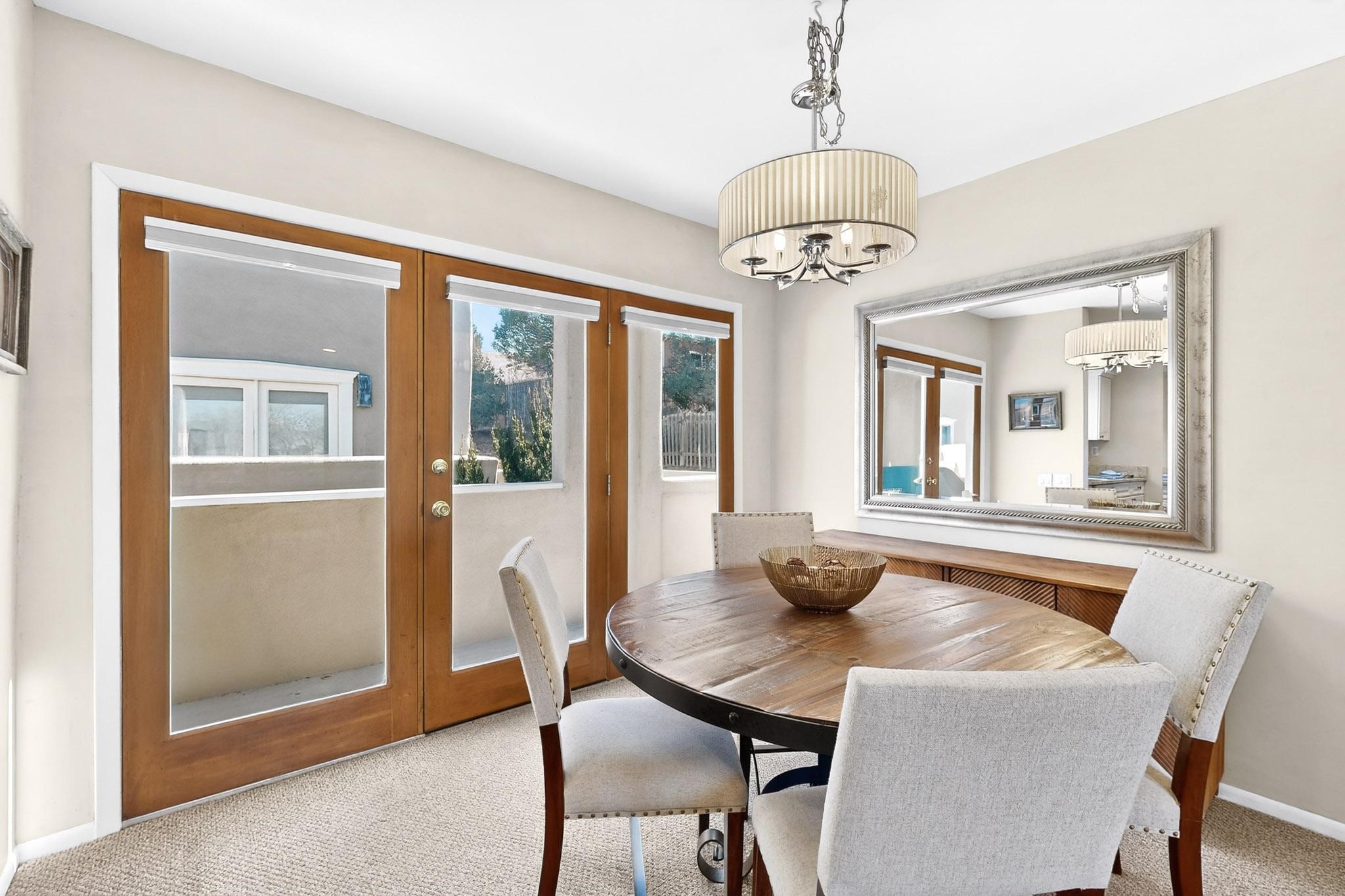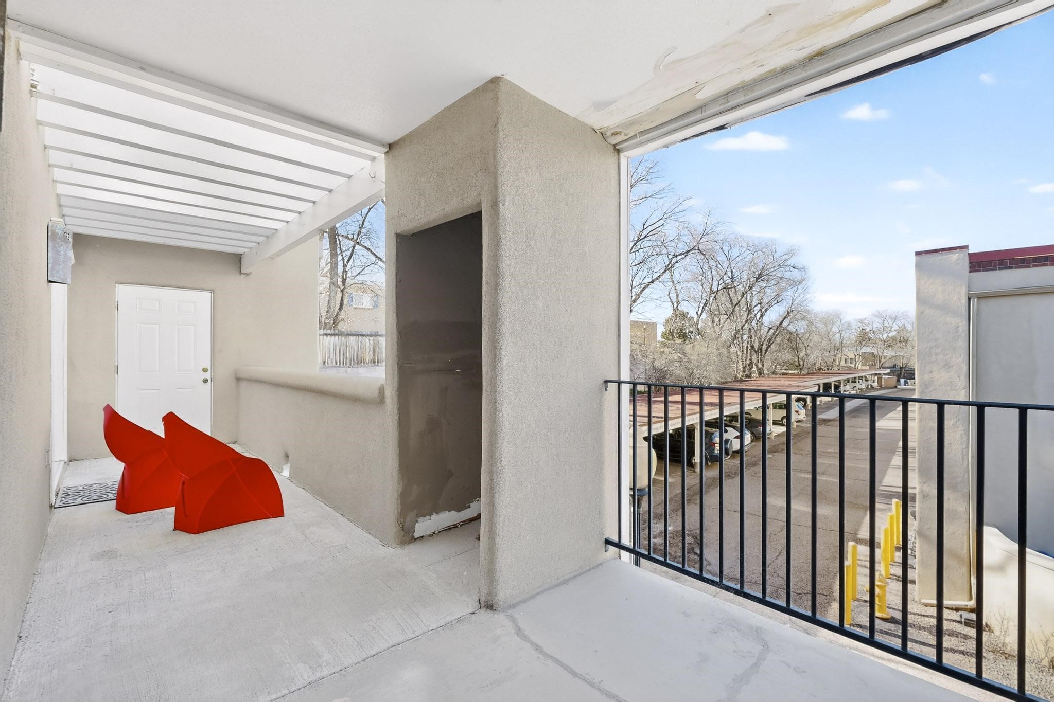 Just in time for the holidays in Santa Fe! Ideally located just six blocks from the Santa Fe Plaza, this spacious one-bedroom, one-bath condominium offers rare walkability paired with privacy and quiet. Situated on the second floor at the back of the complex, this corner unit enjoys a peaceful setting along with a covered, dedicated parking space. Thoughtfully upgraded throughout, the home features granite countertops, stainless steel appliances, new wood flooring in the kitchen and bath, diamond plaster walls, and updated lighting. Built-in bookcases flank the cozy gas fireplace, adding both charm and function. French doors open to a tranquil patio with two private storage closets, creating an inviting indoor-outdoor flow. Additional highlights include central heating and air conditioning, a second balcony, and an HOA that covers exterior maintenance, landscaping, and gated security, making this an easy full-time residence or a perfect Santa Fe lock-and-leave. A furniture package is available with a satisfactory offer, allowing for a seamless move-in experience.
