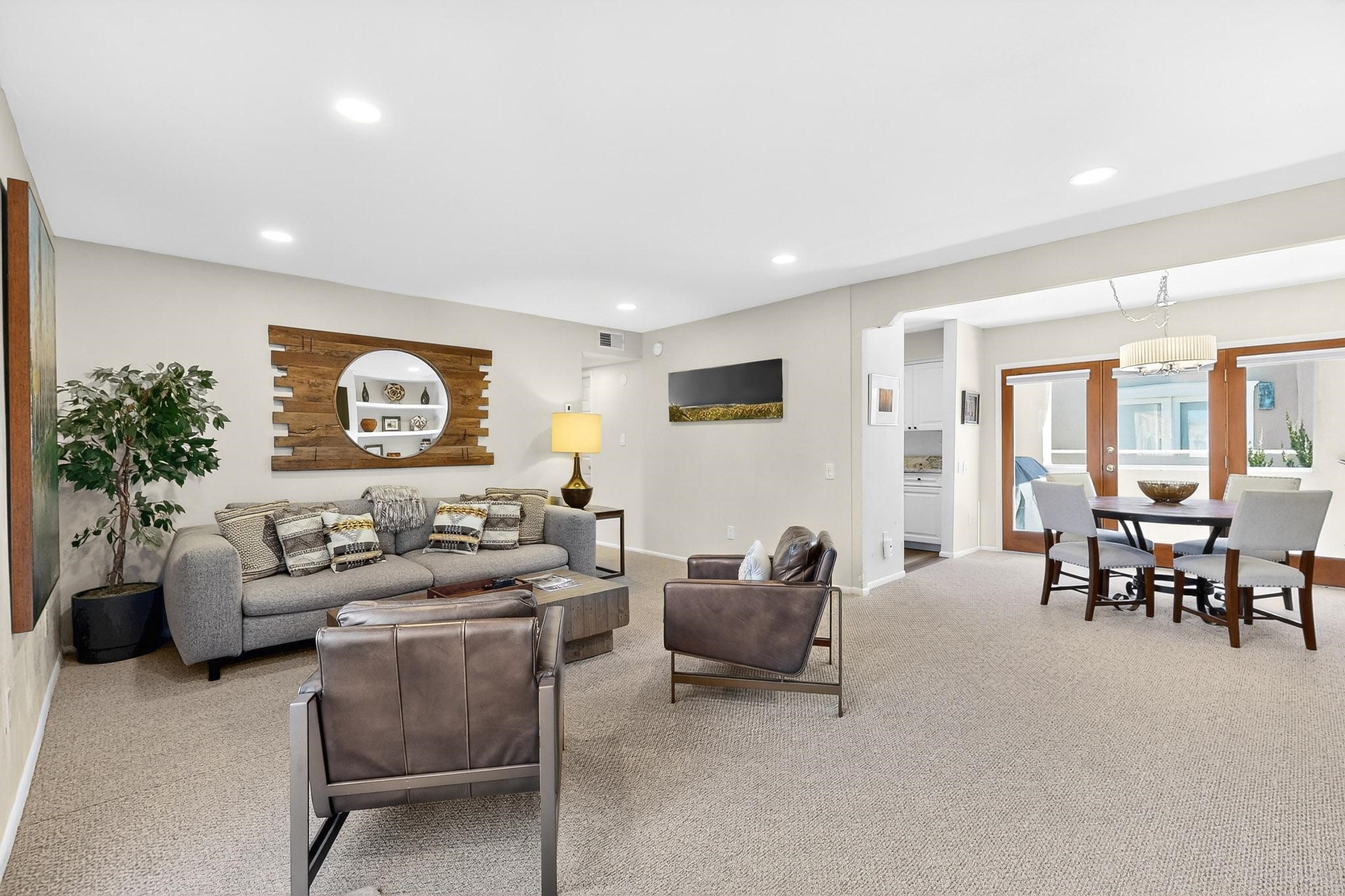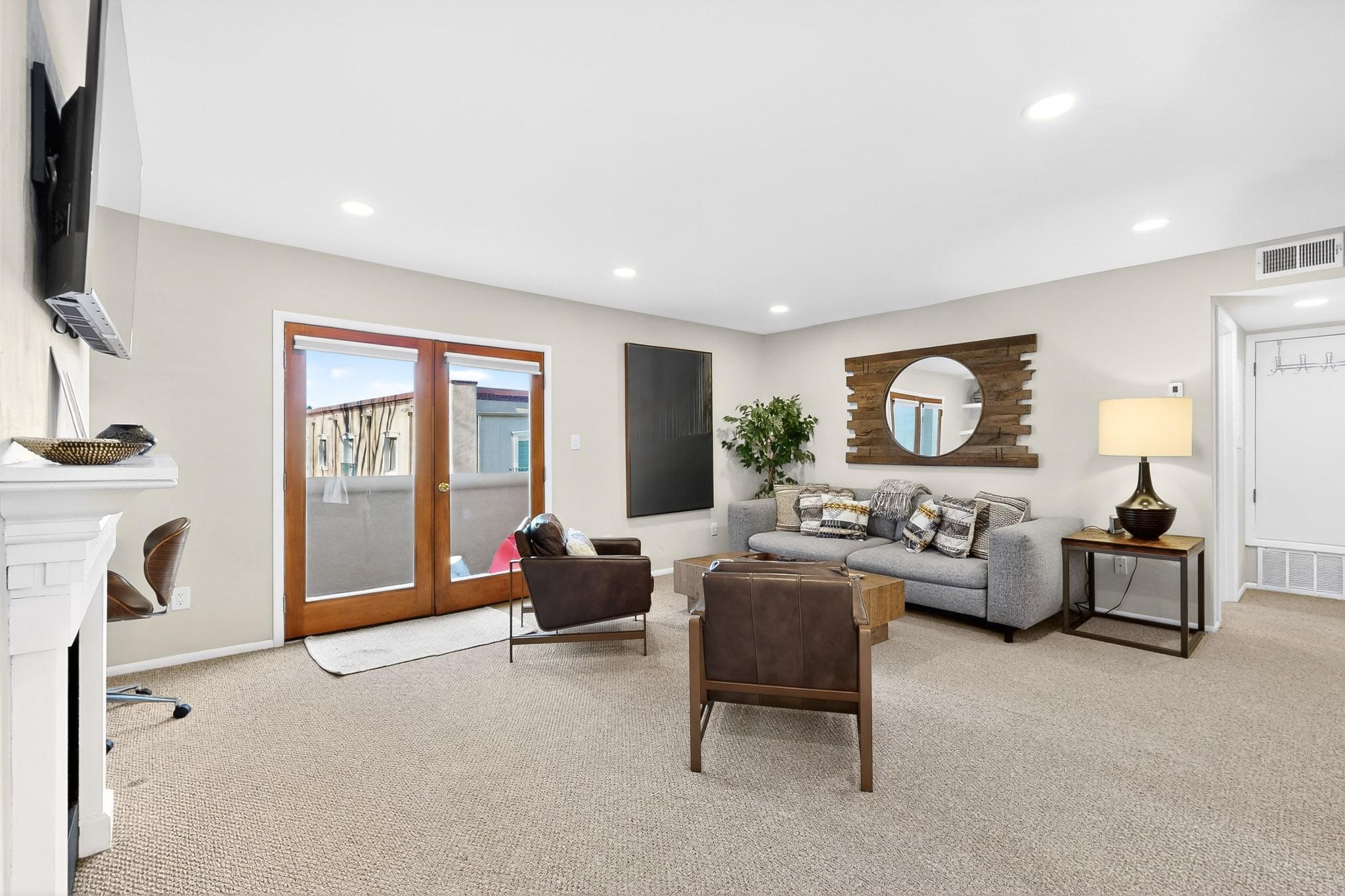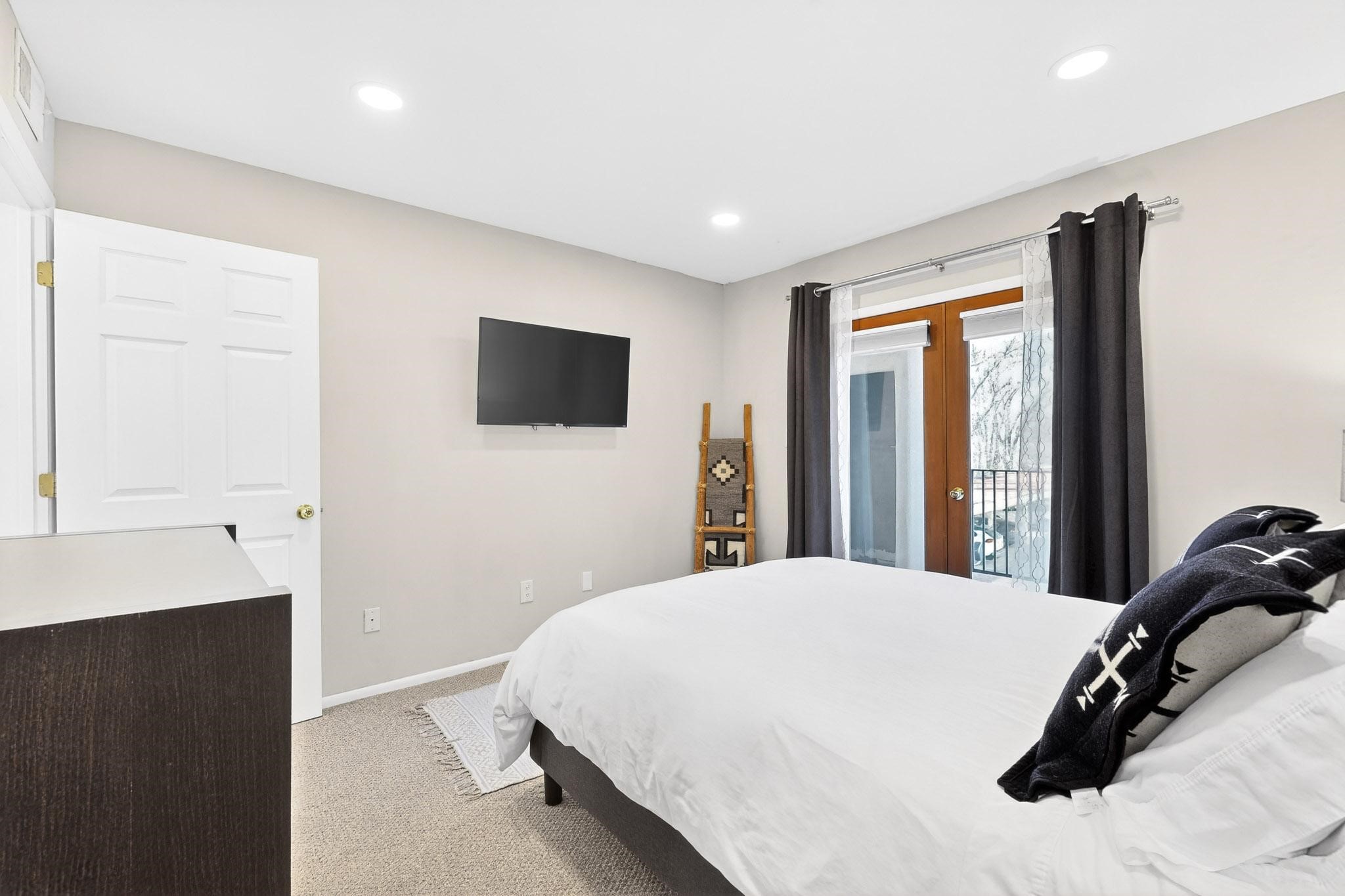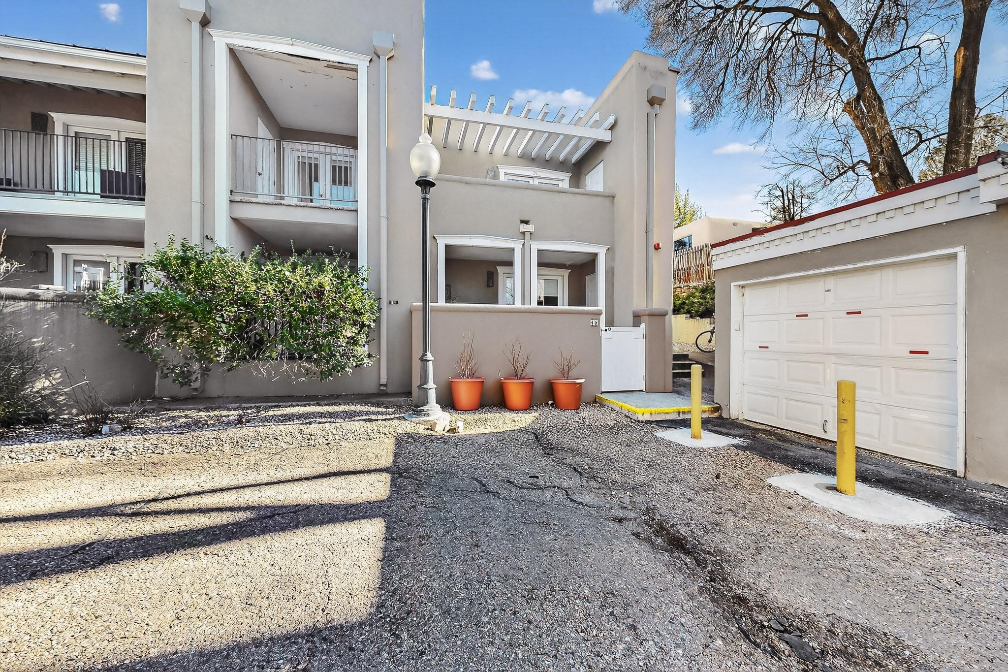 Just in time for the holidays in Santa Fe! Ideally located just six blocks from the Santa Fe Plaza, this spacious one-bedroom, one-bath condominium offers rare walkability paired with privacy and quiet. Situated on the second floor at the back of the complex, this corner unit enjoys a peaceful setting along with a covered, dedicated parking space. Thoughtfully upgraded throughout, the home features granite countertops, stainless steel appliances, new wood flooring in the kitchen and bath, diamond plaster walls, and updated lighting. Built-in bookcases flank the cozy gas fireplace, adding both charm and function. French doors open to a tranquil patio with two private storage closets, creating an inviting indoor-outdoor flow. Additional highlights include central heating and air conditioning, a second balcony, and an HOA that covers exterior maintenance, landscaping, and gated security, making this an easy full-time residence or a perfect Santa Fe lock-and-leave. A furniture package is available with a satisfactory offer, allowing for a seamless move-in experience.