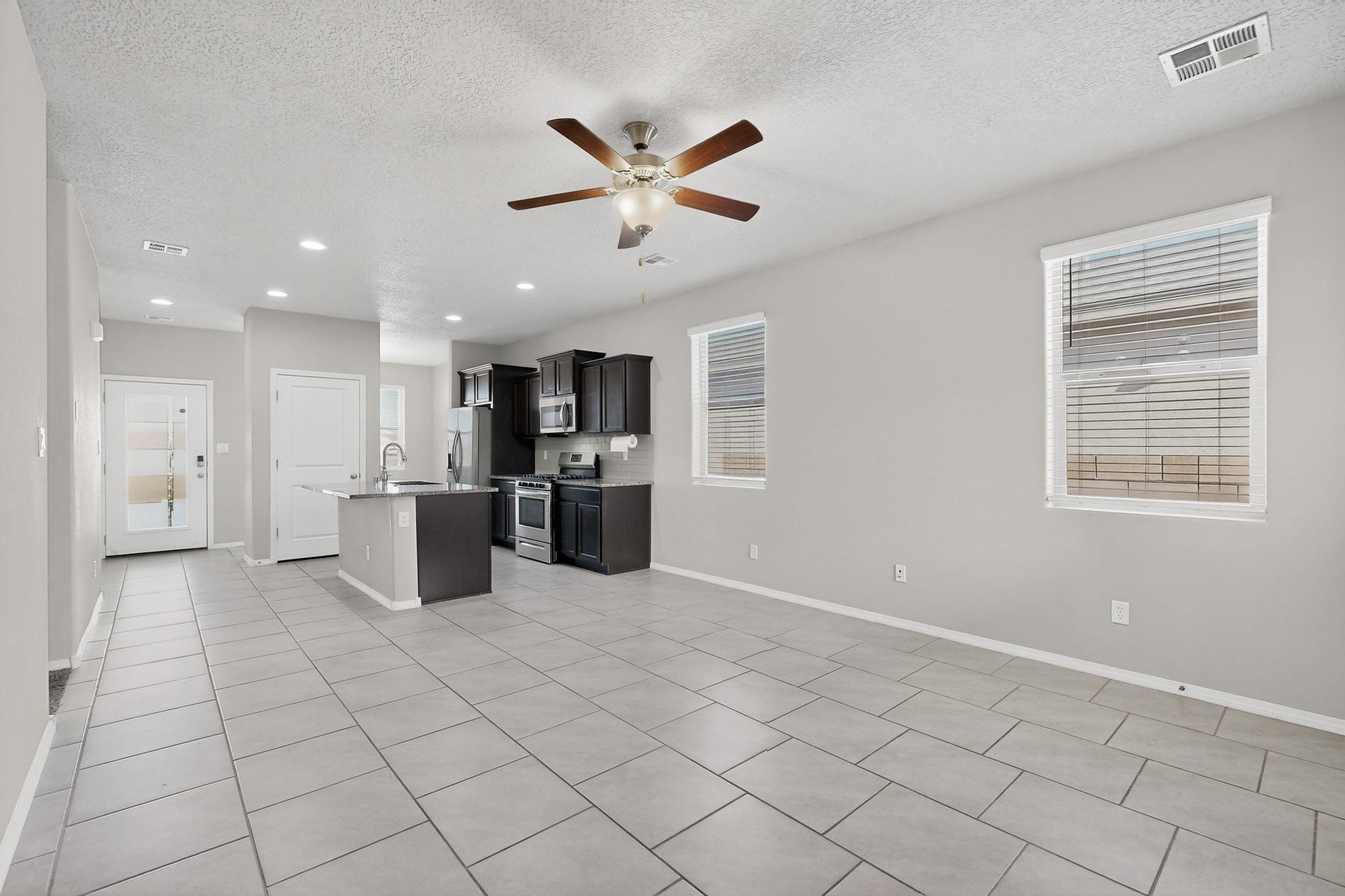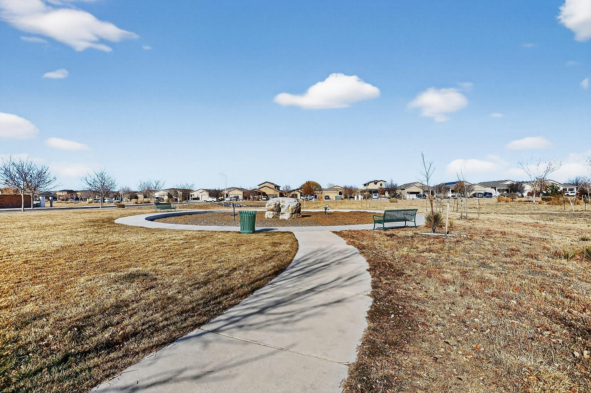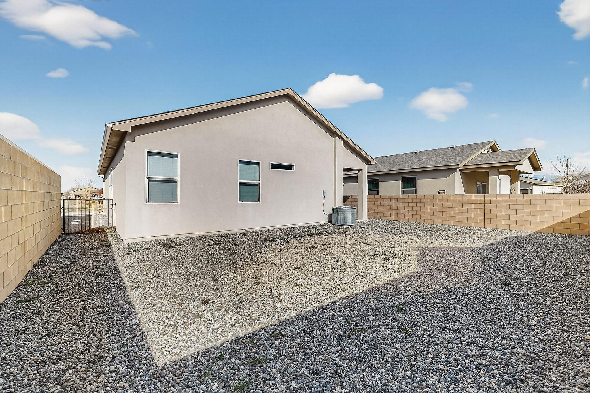 Opportunity is knocking with this 3 bedroom, 2 bathroom single level detached home in the completely sold out Cielo Azul Subdivision. Located across the street from the community open space you will be just steps away from daily walks/strolls, bike rides or walking your 4 legged loved one. Upon entry, the open concept kitchen and living area offer the perfect space to gather. The kitchen is sleek with granite counters, stainless appliances and lots of natural light. Casual eating can be enjoyed at the kitchen island or marvel in the separate dining area with great views of the community park. Wonderful separation of bedrooms allows the primary suite privacy with views to the walled back yard. Move-in ready with a finished garage, tankless water heater, refrigerated A/C, Washer & Dryer and matching stainless appliances. The backyard awaits your landscaping ideas and the location is great with easy access to 599 for both Los Alamos and Albuquerque commuters.