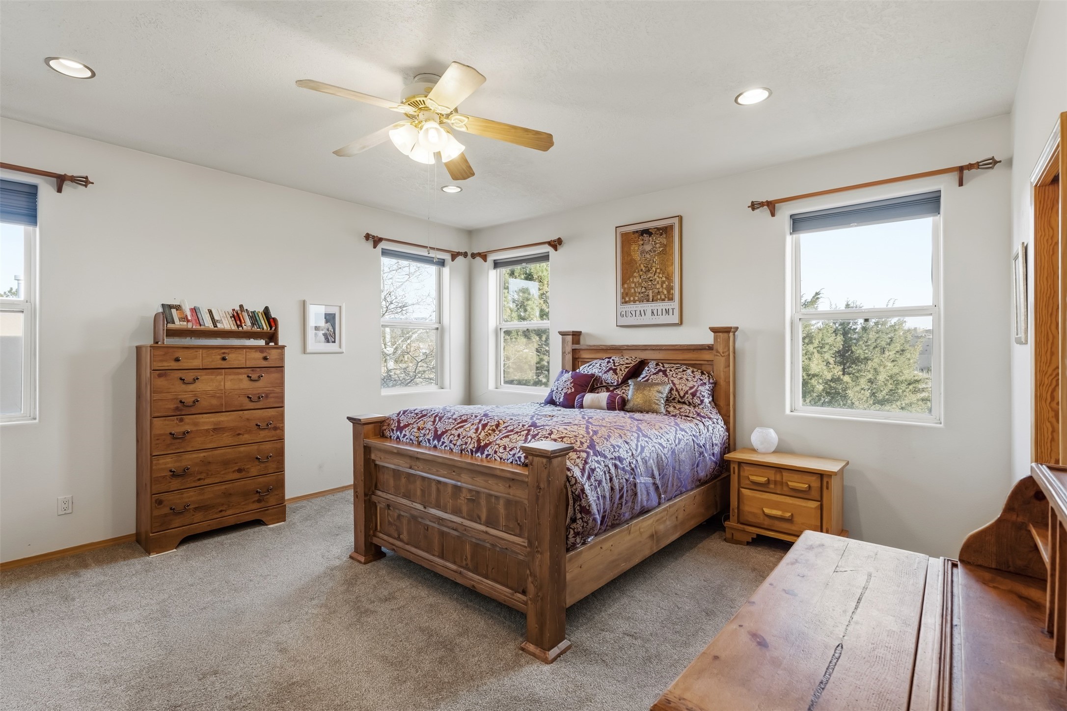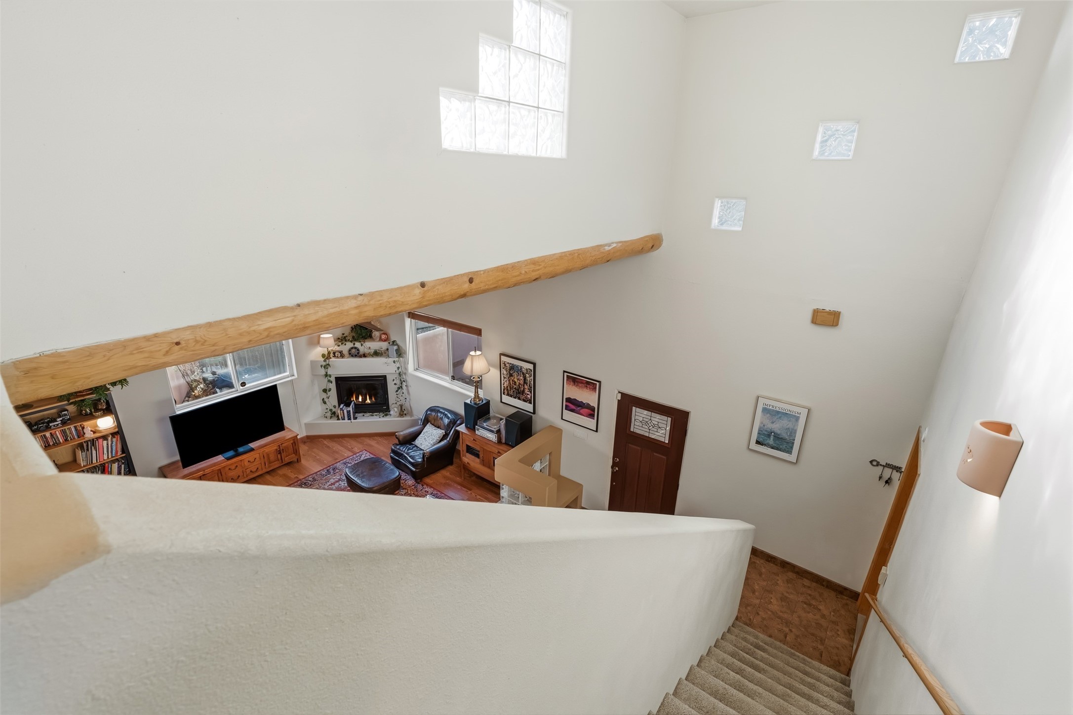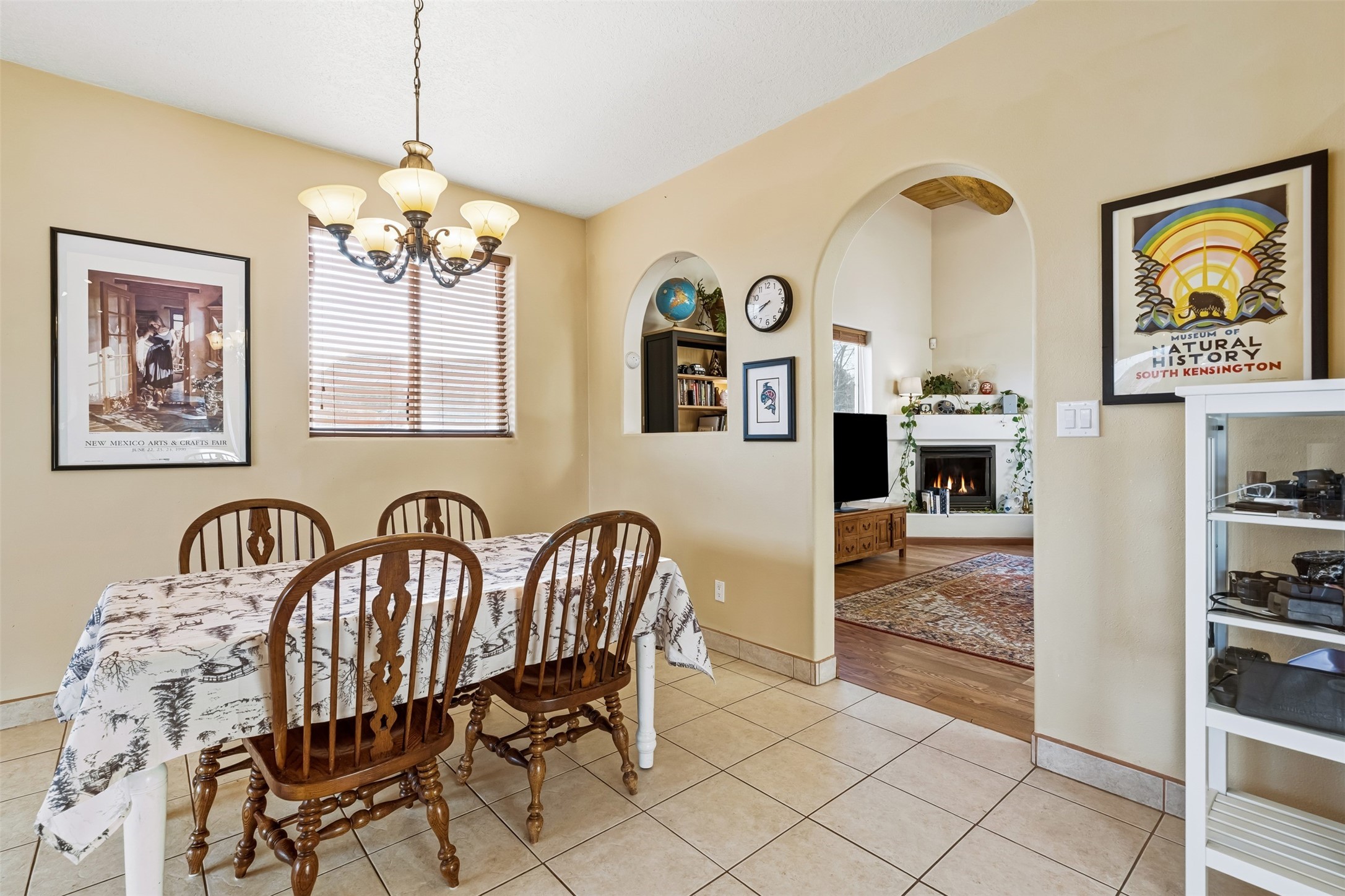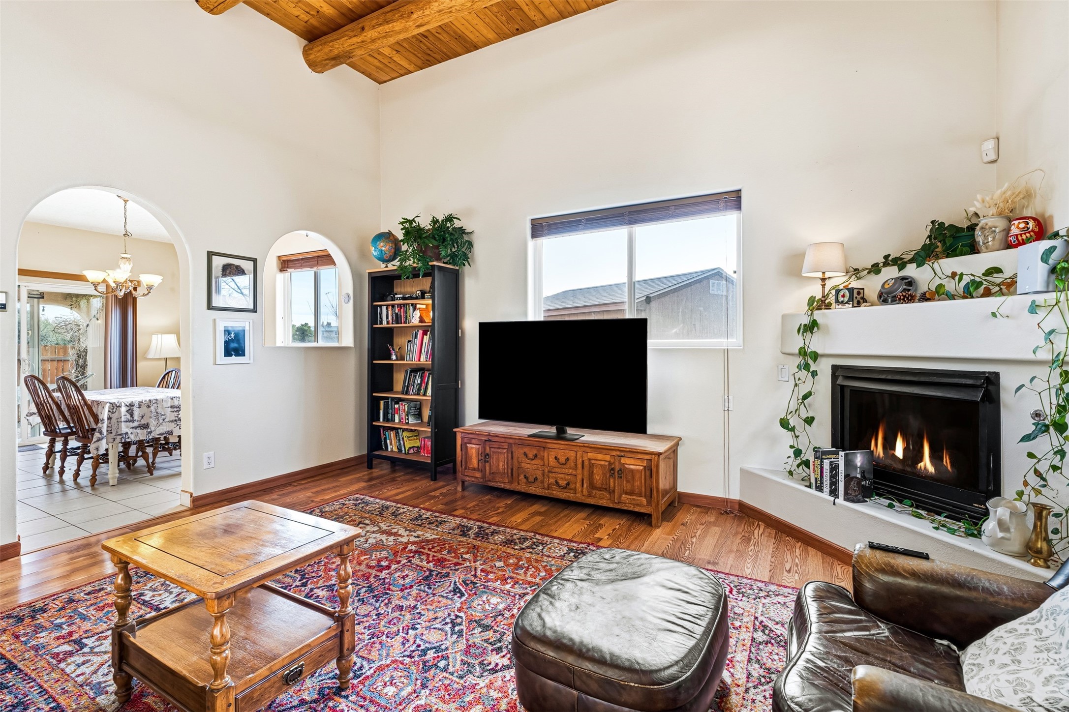 Discover your Santa Fe sanctuary at the peaceful end of a quiet cul-de-sac in the highly desirable Pueblos Del Sol neighborhood. This lovingly maintained home invites you into a sun-drenched expansive living room where authentic wooden vigas and beams soar across high ceilings, while a cozy gas fireplace creates an inviting focal point. The thoughtful main floor layout flows effortlessly from the living room to a large, open dine-in kitchen and back patio, additionally complemented by two spacious bedrooms, a full bathroom and laundry room.The second floor reveals a private retreat--an enormous primary suite featuring a spa-like ensuite bathroom and generous walk-in closet. A versatile fourth bonus room adapts perfectly as a home office, while the covered porch and expansive viewing deck showcase breathtaking sunsets and mountain vistas.Recent updates and quality features make this home truly move-in ready. The roof was replaced in 2023, the stucco remains in excellent condition, and radiant in-floor heating provides efficient, comfortable warmth throughout. Practical amenities include a two-car garage and a gated side driveway with ample space for a van or camper trailer. The backyard's fully finished, insulated shed with electricity transforms easily into a creative studio, yoga space, or private retreat.The neighborhood delivers exceptional convenience--top-rated schools, scenic walking trails, and nearby shopping and groceries--all while maintaining the serenity of this central, easily commutable location.Picture yourself enjoying lazy summer evenings on the covered back patio as children or pets roam the fully fenced yard, or greeting each morning from your second-floor deck with coffee and mountain views. This home strikes that rare balance between connection and seclusion, offering both the warmth of community and the peace of your own private haven. More than a house, this is where your family's story unfolds.