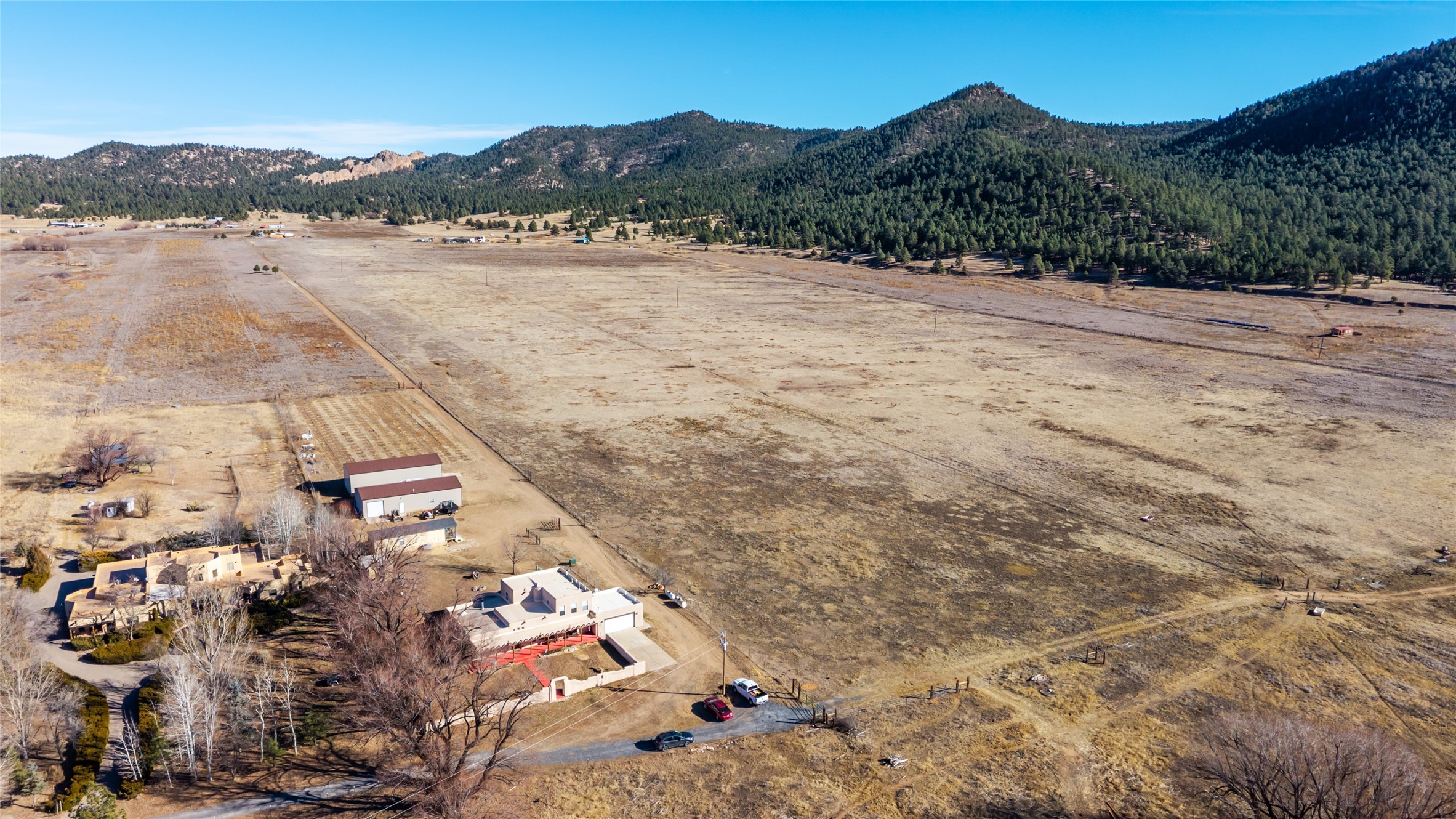 Located in Ledoux, this modern two-story Santa Fe-style estate pairs refined living with a true, working agricultural setup. The main residence spans approximately 3,046 square feet and offers 3 bedrooms and 3 baths, a welcoming front courtyard, and a two-car garage. Thoughtful design elements and elevated views create a home that feels private, open, and built for everyday comfort as well as entertaining. Beyond the main house, the property is equipped for serious, year-round operations. A separate manufactured guest home provides 1 bedroom and 1 baths--ideal for extended family, staff housing, or flexible rental use. Two commercial-grade barns one with climate control and one with dedicated administrative areas support efficient production, storage, and management in every season. The land is flat, usable, and well-suited for equipment access, planting, and expansion. A permitted agricultural well anchors the property's long-term utility and makes this more than a beautiful residence-it's a rare opportunity to own a one-of-a-kind agricultural compound with infrastructure already in place. Enjoy wide-open skies, space to grow, and the convenience of being within reach of Northern New Mexico's towns, recreation, and culture. Properties with this combination of home, guest quarters, and commercial AG facilities are exceptionally hard to find.