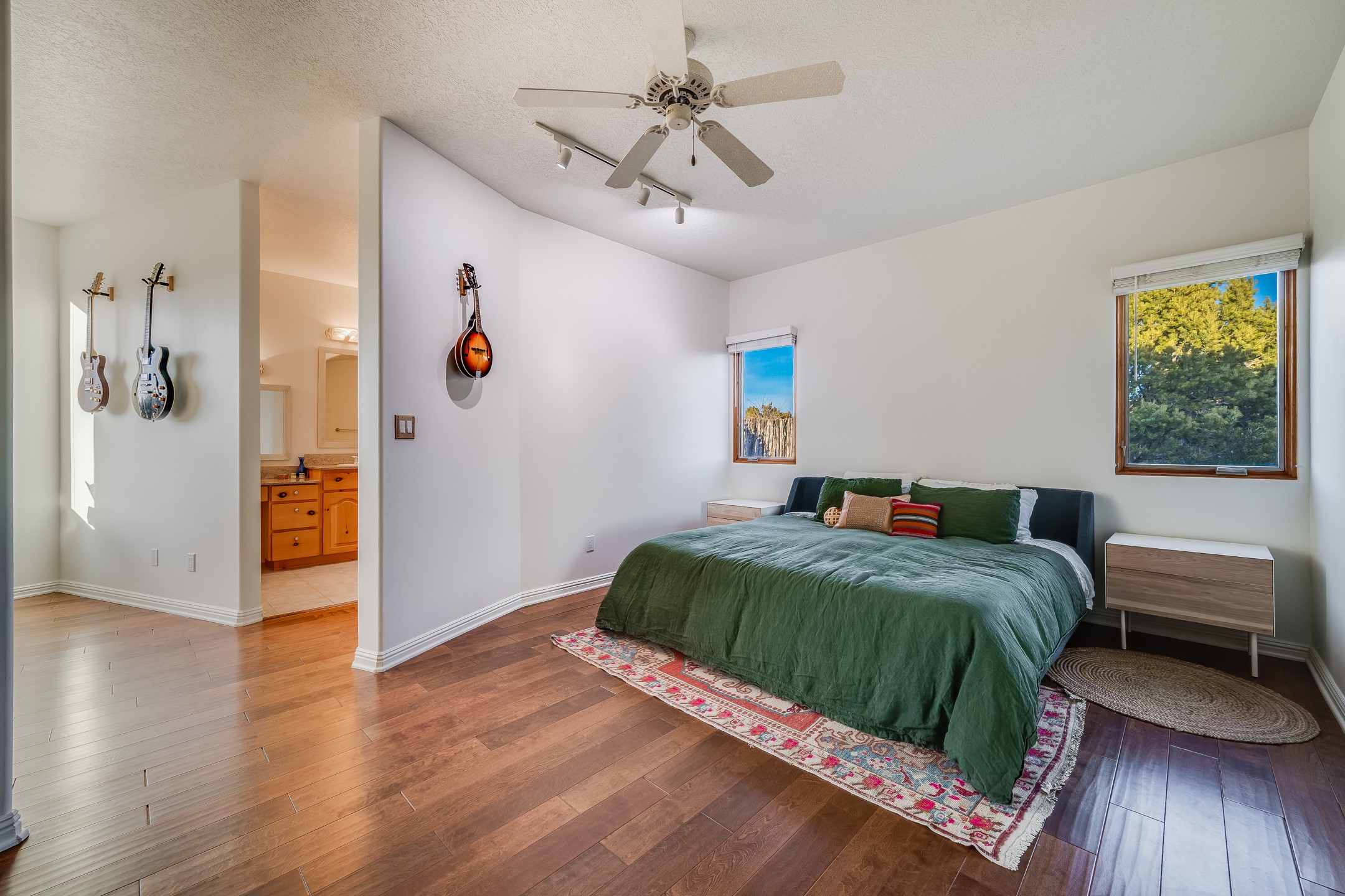 This spacious light view filled home offers a great value! Through the gated entry and into an extraordinarily captivating entrance this home feels like it is miles from everyone and yet it's within the neighborhood. Just a few minutes drive to Las Campanas and another few minutes to 599. This location is ideal for Living in style in the Northwest aea of Santa Fe.Each bedroom has views, natural light, access to the outside portals and ensuite baths. The natural minimalist landscaping is easy to maintain attractive from outside areaa, there is hard wiring lighting to the trees and irrigation.in addition why not have a party, there's plenty of within the grounds parking as well as a detached carport replete with Vegas and a propanel roof perfect for your recreational vehicles. There is also an attached two-car garage that is finished inside.Two fireplaces, Excellent storage and all the amenities one would expect can be yours. This is move-in ready.