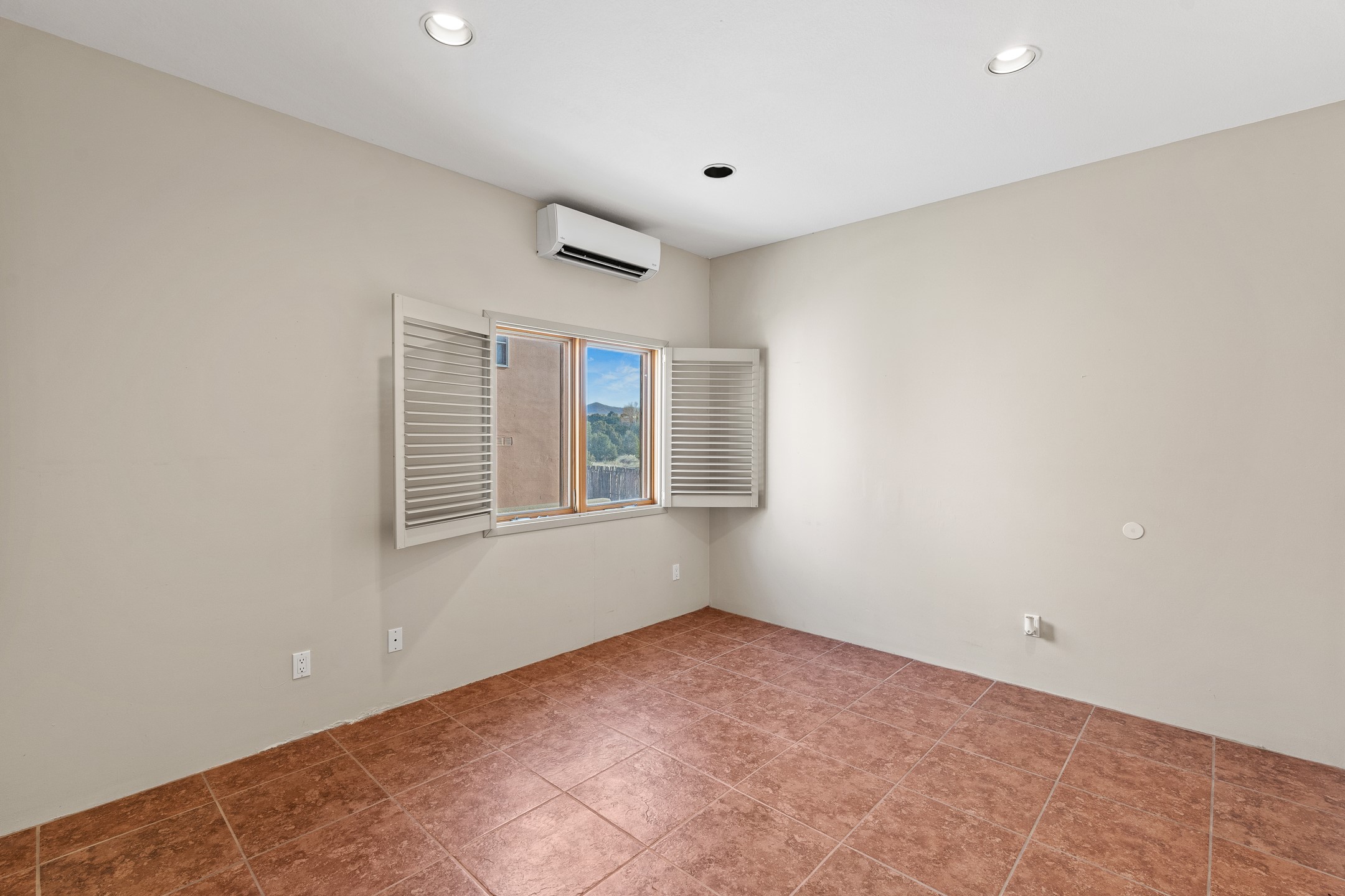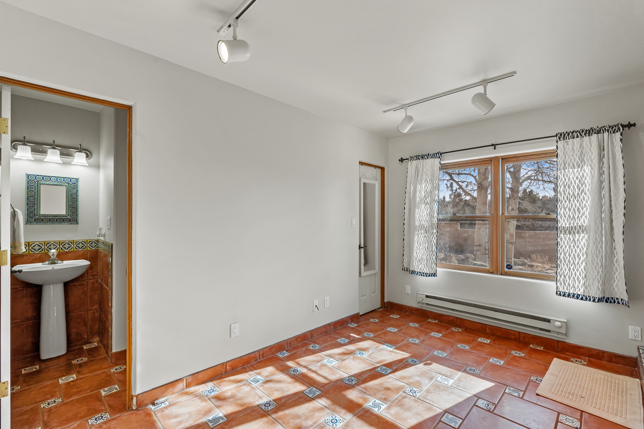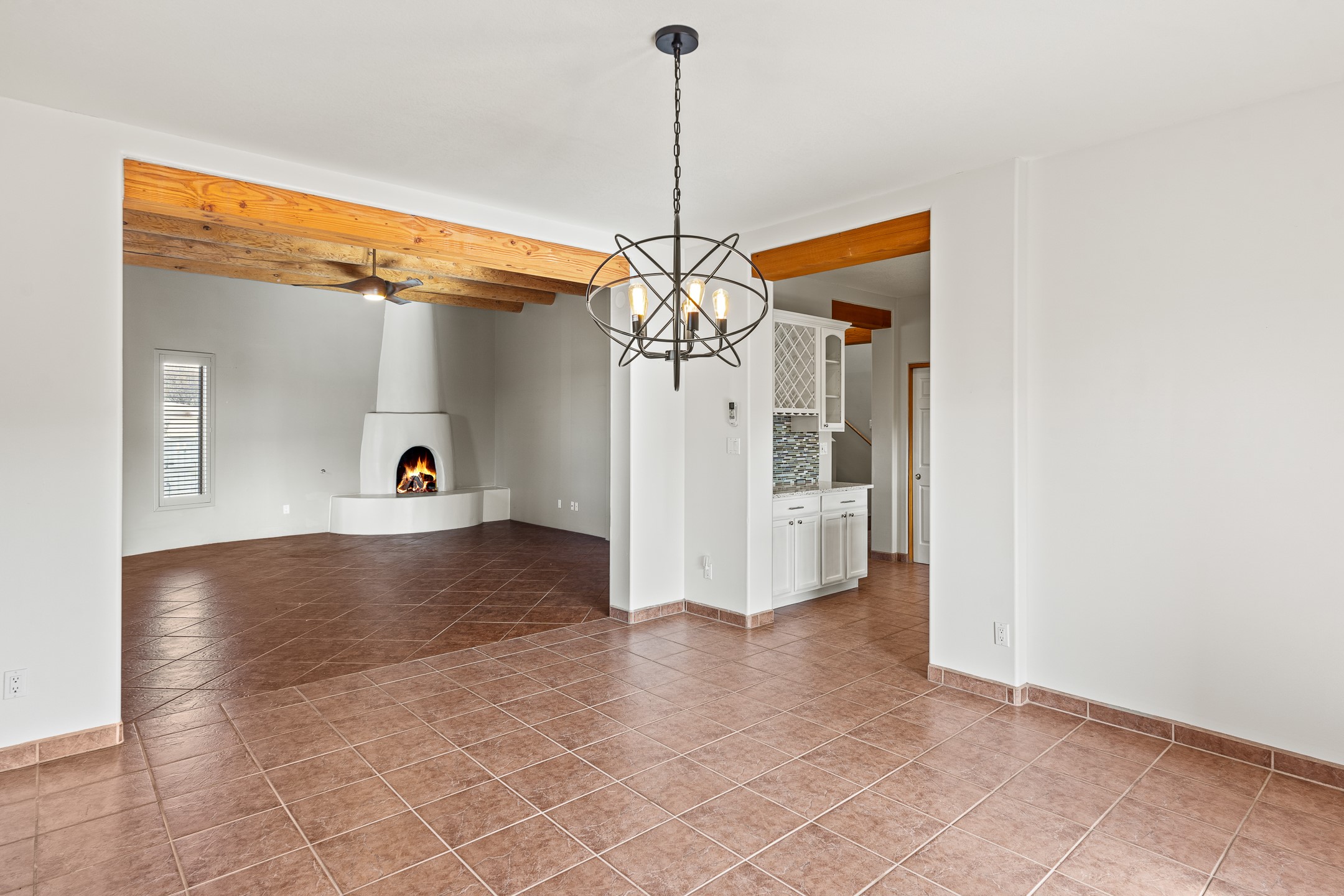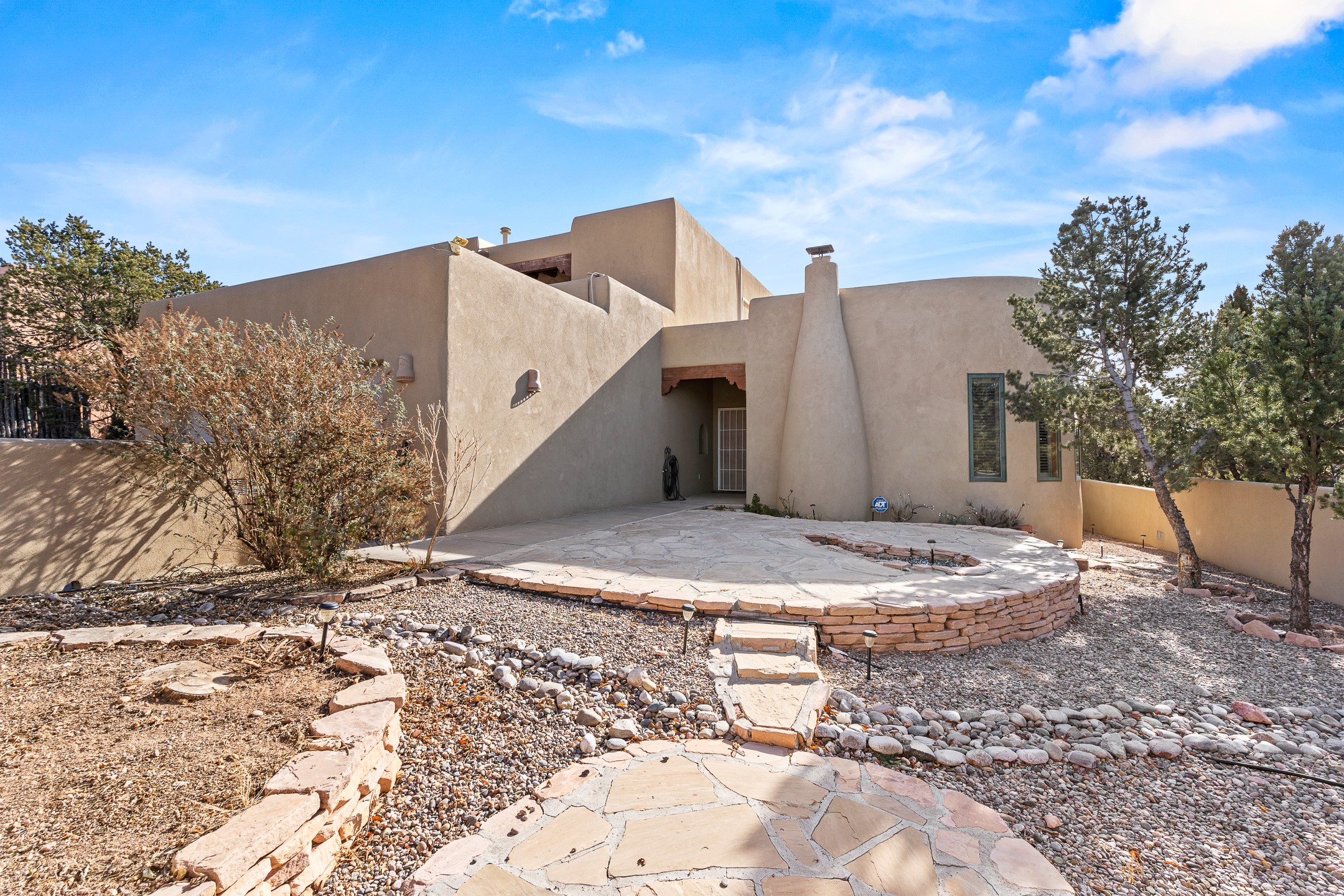Custom home located in the sought-after Pueblos de Sol subdivision, offering comfortable living and sweeping sunrise andsunset views. Situated on a nicely sized corner lot, this home features a covered portal and rear deck--perfect for relaxingand enjoying the scenery. The kitchen showcases newer cabinetry, stainless steel appliances, granite countertops, and acoordinating backsplash. A formal dining room and a separate breakfast nook provide flexible dining options. ClassicSouthwestern details shine throughout, including tongue-and-groove ceilings with vigas and a Kiva wood-burning fireplace. The oversized primary bedroom offers a true retreat, complete with a spa-like en suite bathroom featuring a standalone soaking tub, separate shower, and access to a private deck. Recent upgrades include a TPO roof installed in 2022 and a new boiler for radiant heating installed in 2024. Year-round comfort is ensured with five mini-split systems. Outdoor spaces include a charming landscaped courtyard with flagstone, mature trees, drip irrigation, and a pet-friendly layout. The rear deck is ideal for outdoor entertaining. The property backs to a walking trail, with a community park conveniently located across the street. A separate-entry studio/guesthouse with a full bath completes this exceptional offering--perfect for guests or rental income potential.