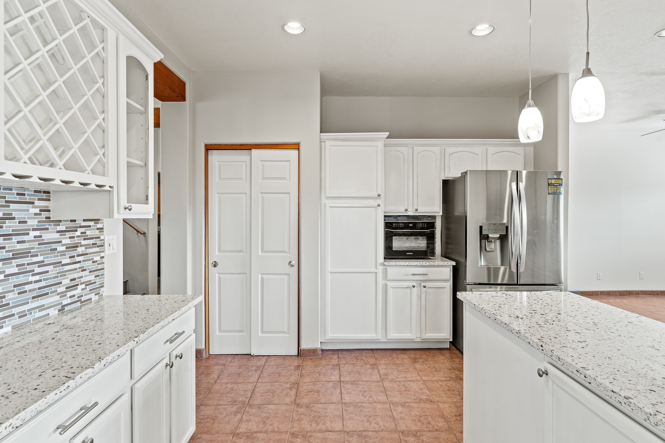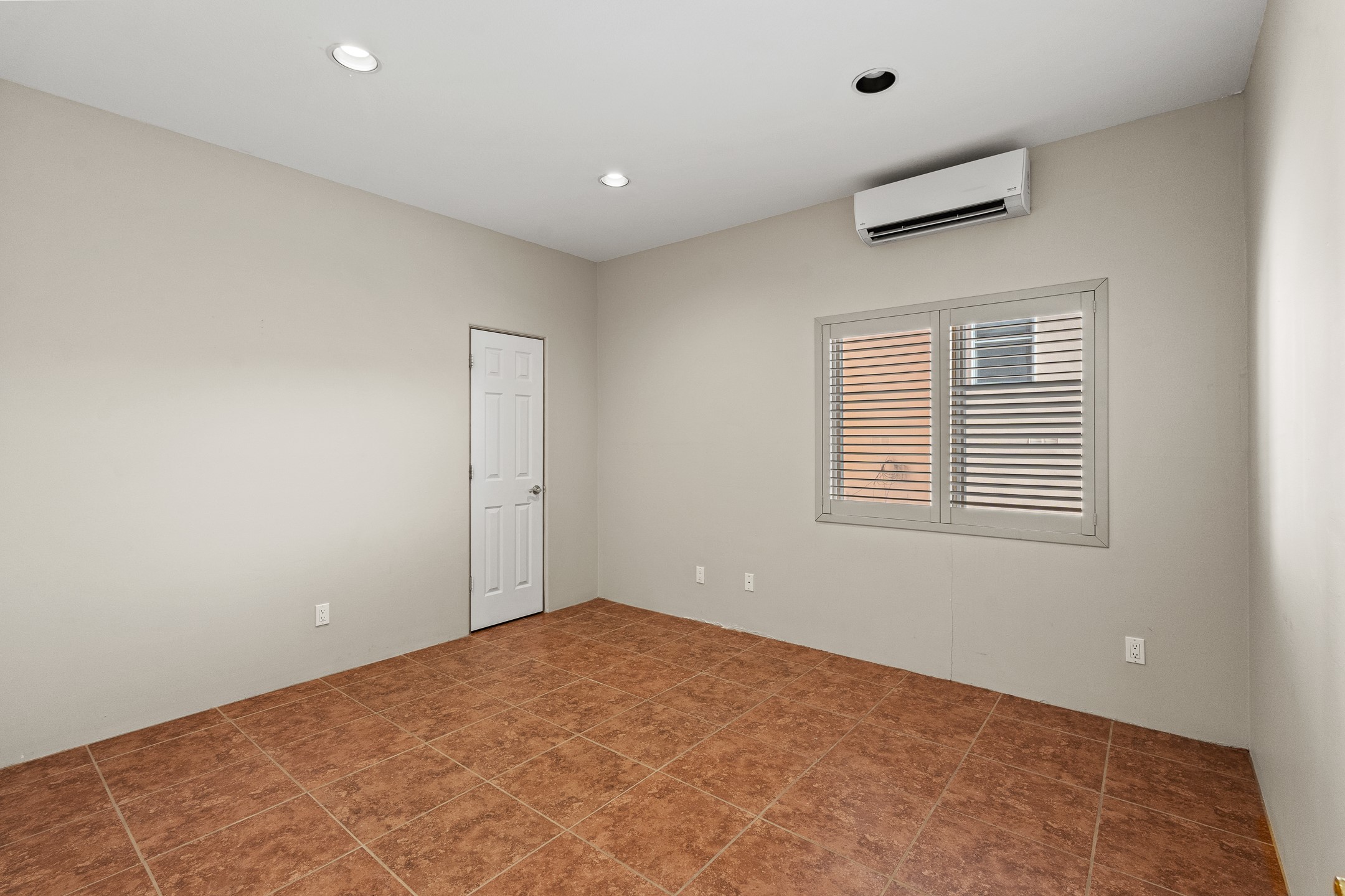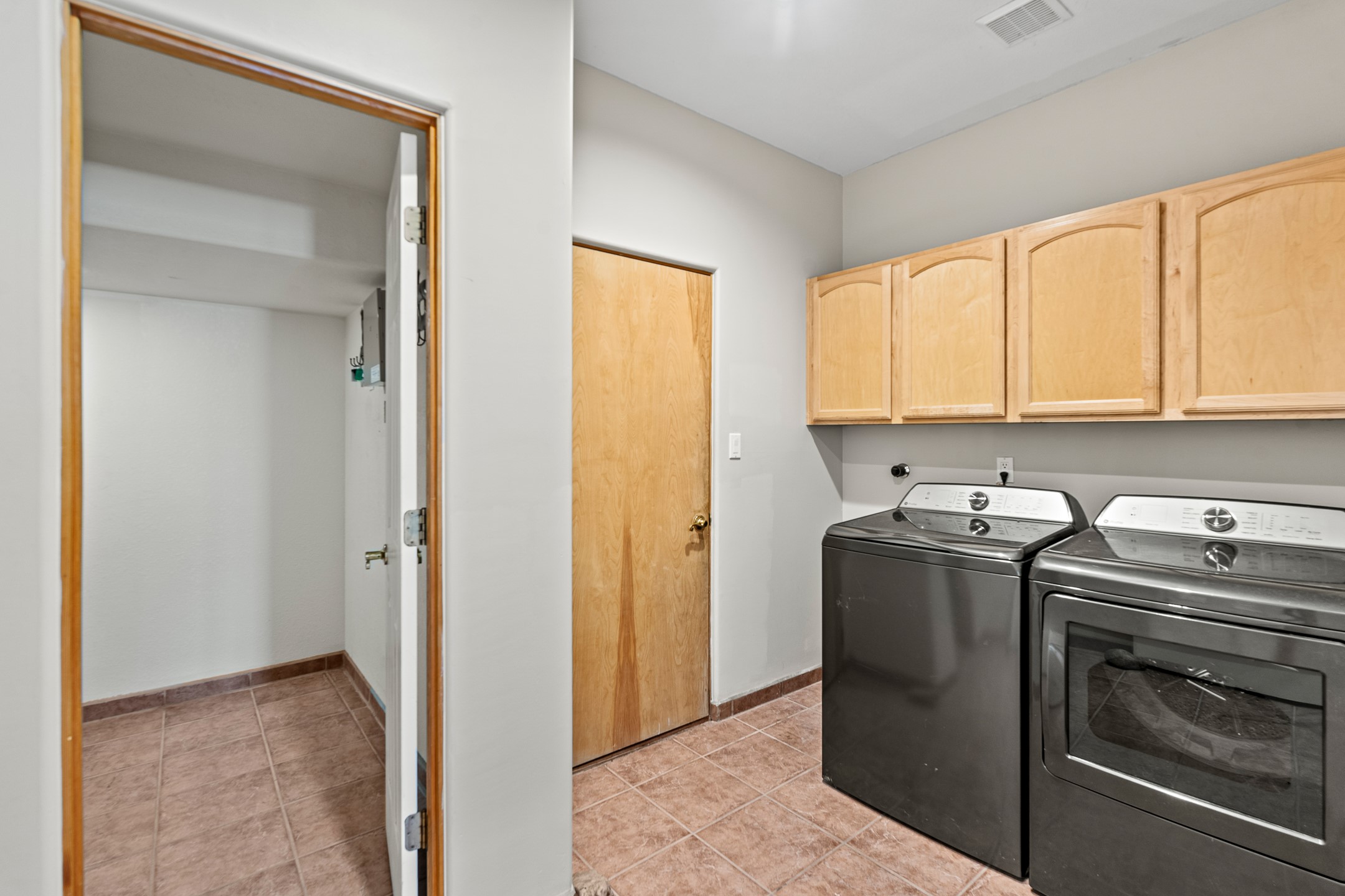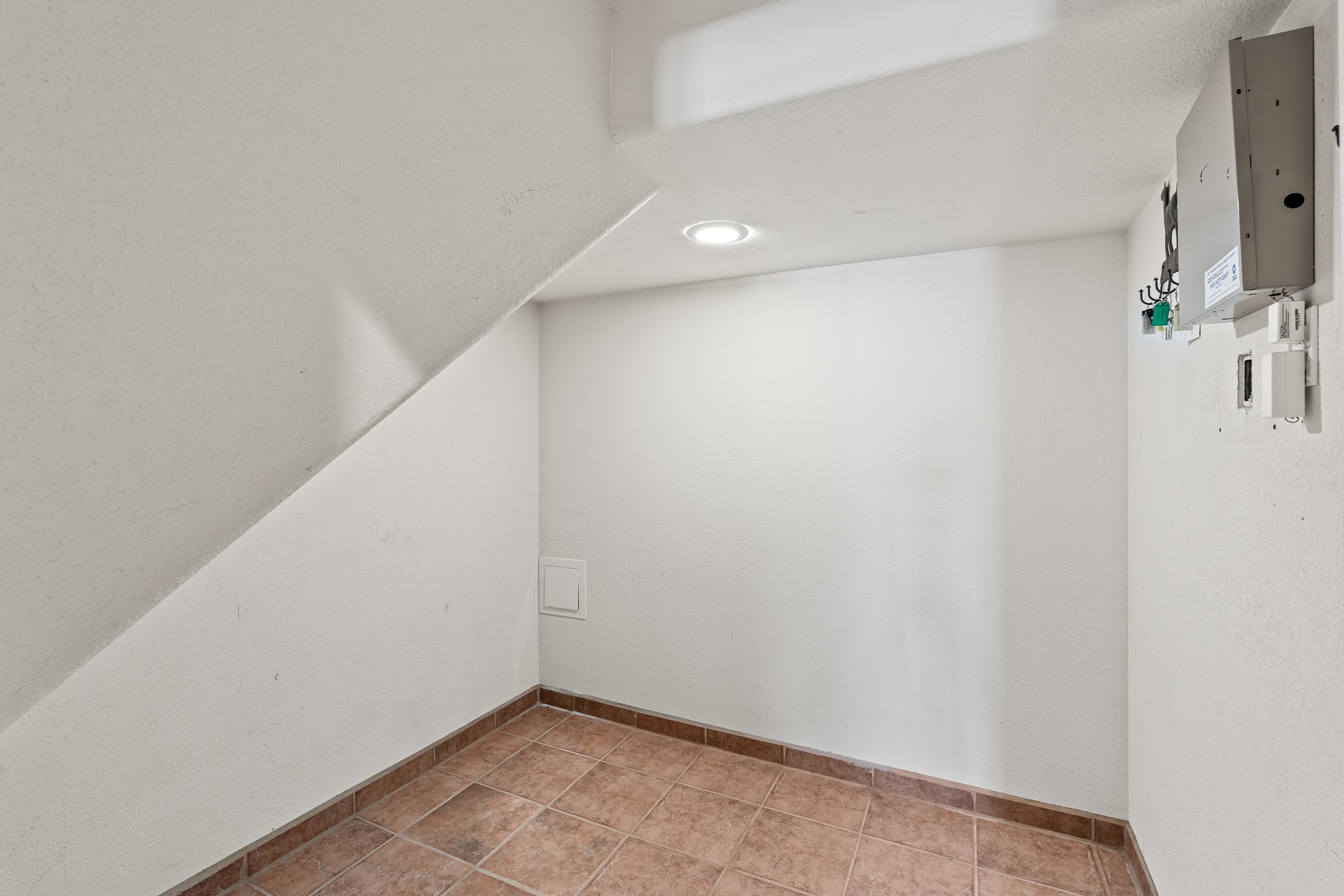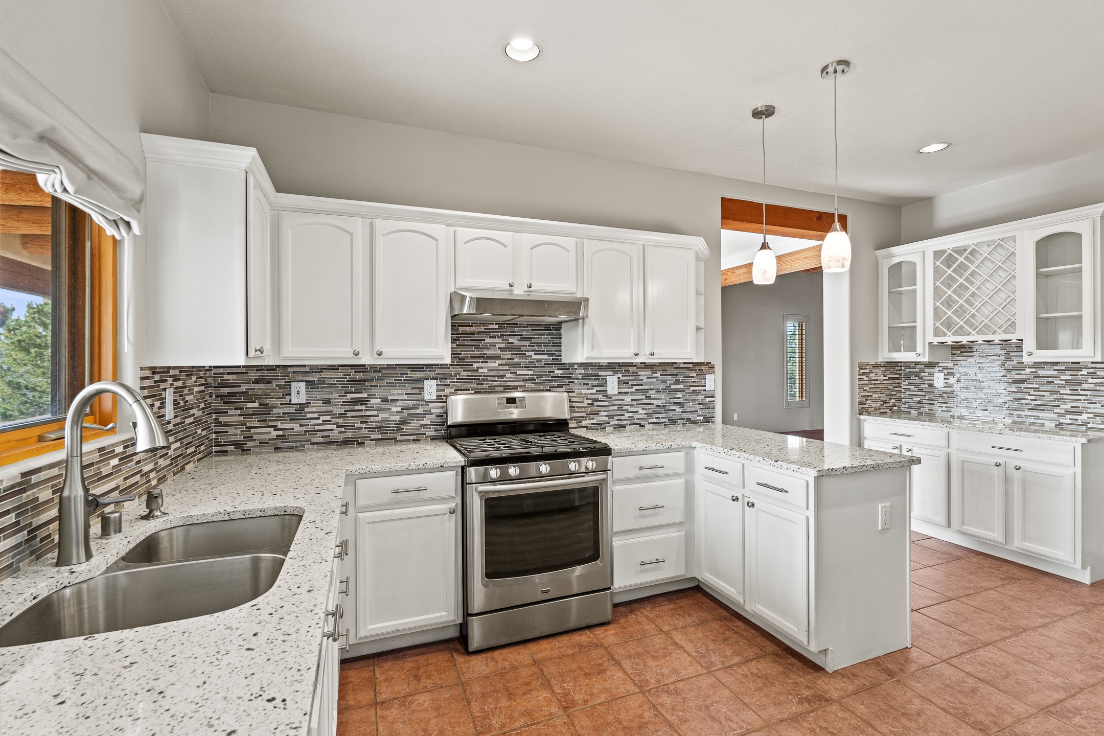 Custom home located in the sought-after Pueblos de Sol subdivision, offering comfortable living and sweeping sunrise andsunset views. Situated on a nicely sized corner lot, this home features a covered portal and rear deck--perfect for relaxingand enjoying the scenery. The kitchen showcases newer cabinetry, stainless steel appliances, granite countertops, and acoordinating backsplash. A formal dining room and a separate breakfast nook provide flexible dining options. ClassicSouthwestern details shine throughout, including tongue-and-groove ceilings with vigas and a Kiva wood-burning fireplace. The oversized primary bedroom offers a true retreat, complete with a spa-like en suite bathroom featuring a standalone soaking tub, separate shower, and access to a private deck. Recent upgrades include a TPO roof installed in 2022 and a new boiler for radiant heating installed in 2024. Year-round comfort is ensured with five mini-split systems. Outdoor spaces include a charming landscaped courtyard with flagstone, mature trees, drip irrigation, and a pet-friendly layout. The rear deck is ideal for outdoor entertaining. The property backs to a walking trail, with a community park conveniently located across the street. A separate-entry studio/guesthouse with a full bath completes this exceptional offering--perfect for guests or rental income potential.
