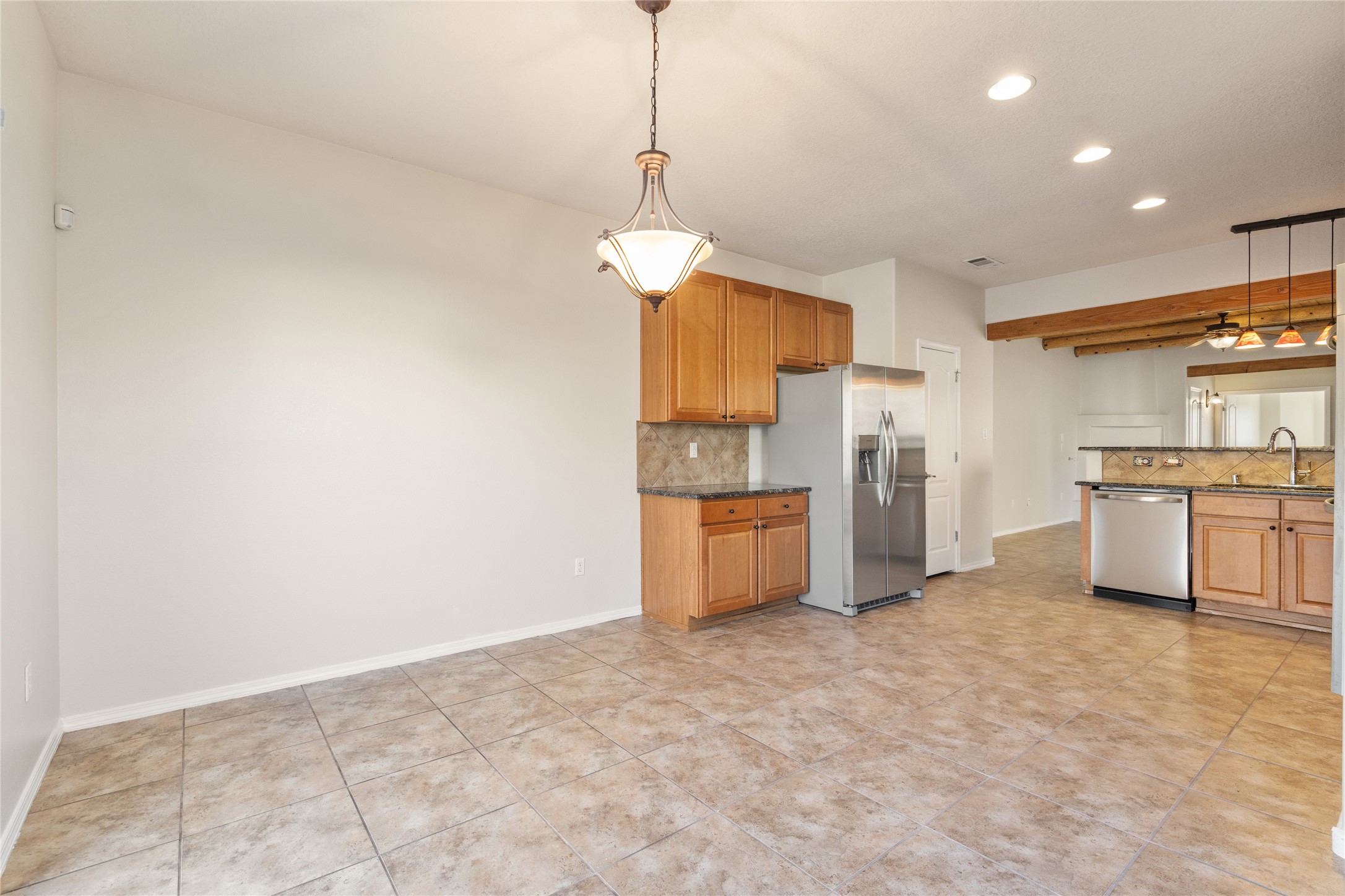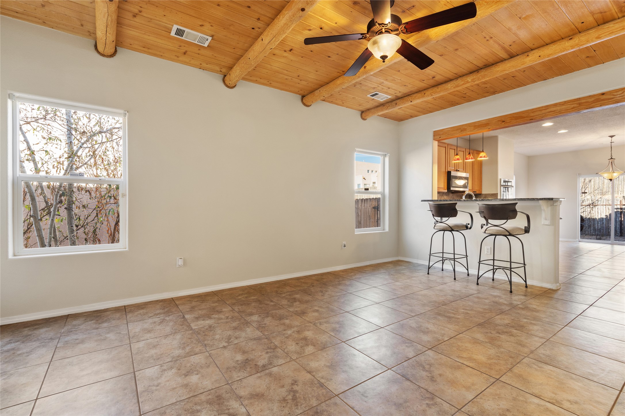 Welcome home to the desirable Villa Sonata neighborhood, where comfort and convenience come together just minutes from Santa Fe's Historic Plaza.Step inside to lofty ceilings that provide the Santa Fe charm with vigas and wood beams, and a warm gas fireplace anchoring the living room, creating an inviting space ideal for both everyday living and entertaining. The open-concept floor plan seamlessly connects the living, dining, and kitchen areas, providing a bright and flexible layout that is perfect for hosting friends and family.This spacious 2-bedroom, 2-bath residence also includes a versatile flex space that can serve as a home gym, media room, office, or potential third bedroom. The kitchen is equipped with new stainless steel appliances, including a gas range, built-in microwave, dishwasher, refrigerator, and double built-in ovens.Additional features include central air conditioning, tile flooring throughout the main living areas, brand-new carpet in the bedrooms, and a new Samsung washer and dryer.The primary suite offers a generous walk-in closet, soaking tub, and step-in shower. Outdoors, enjoy a private back patio and enclosed backyard--ideal for pets, gardening, or relaxing in Santa Fe's beautiful climate.A two-car garage and a new TPO roof with a warranty provide peace of mind and long-term value.Located just moments from coffee shops, Trader Joe's, Whole Foods, acclaimed restaurants, and all the culture and charm of downtown Santa Fe, this home delivers the perfect balance of lifestyle and location.