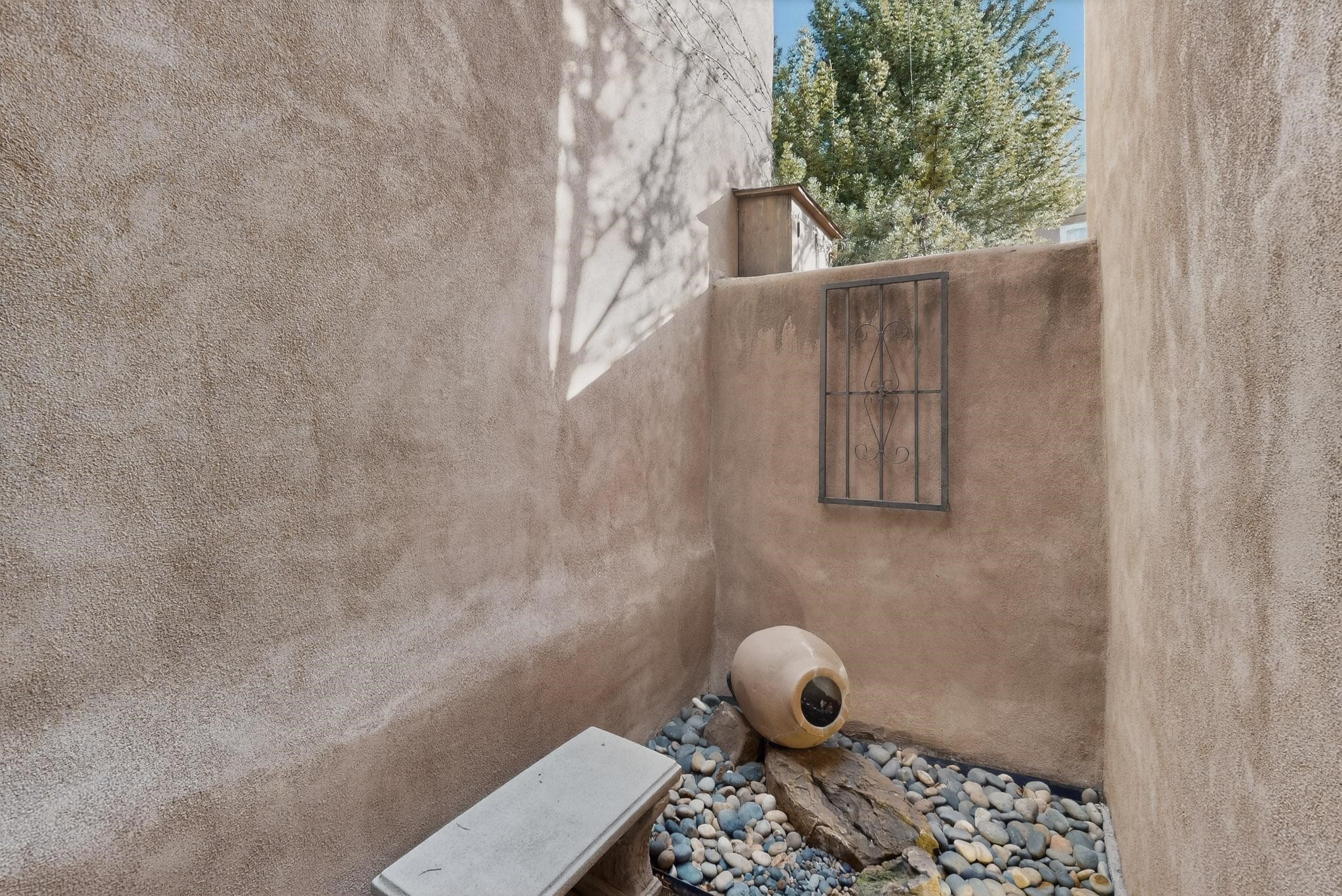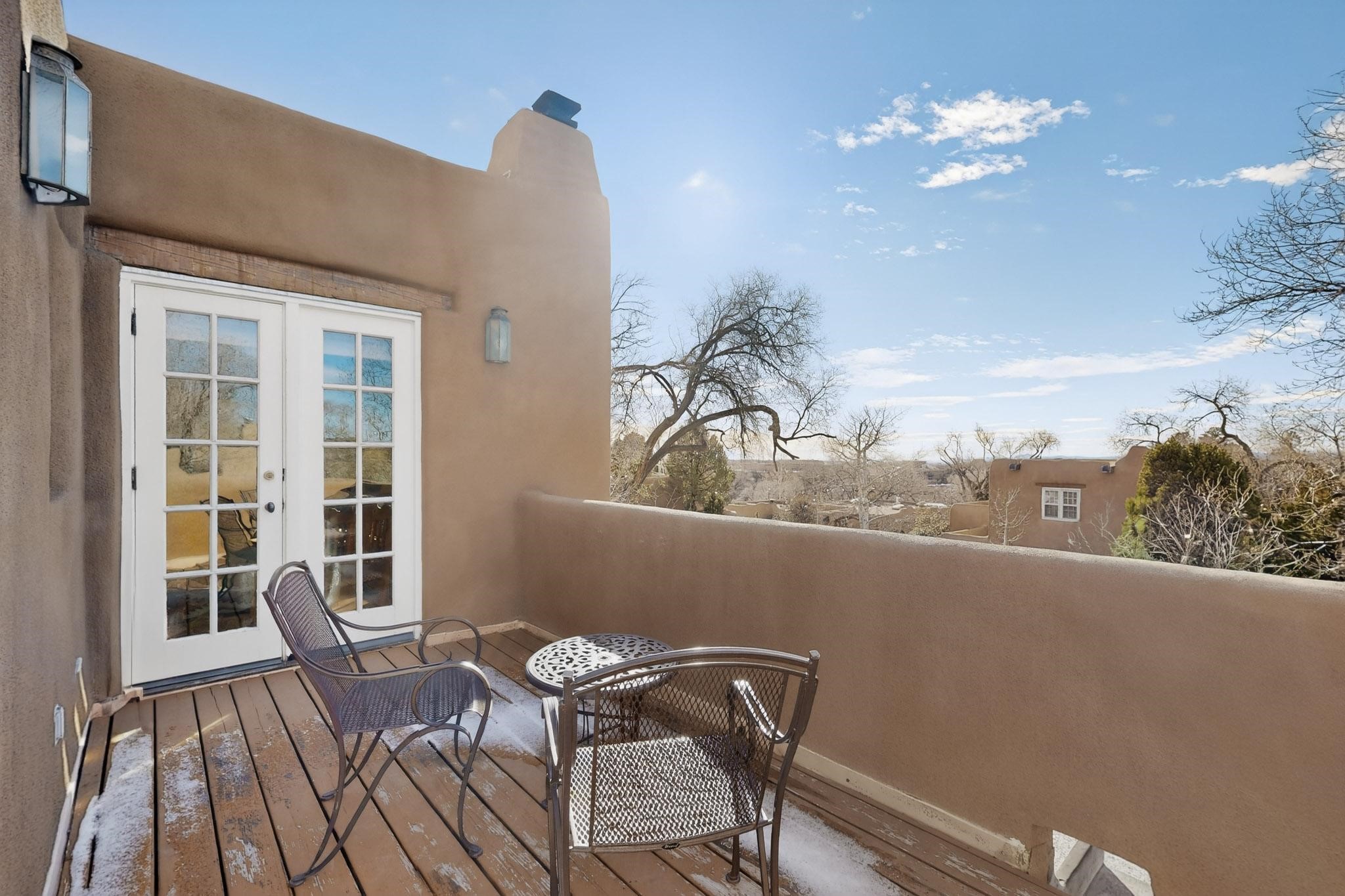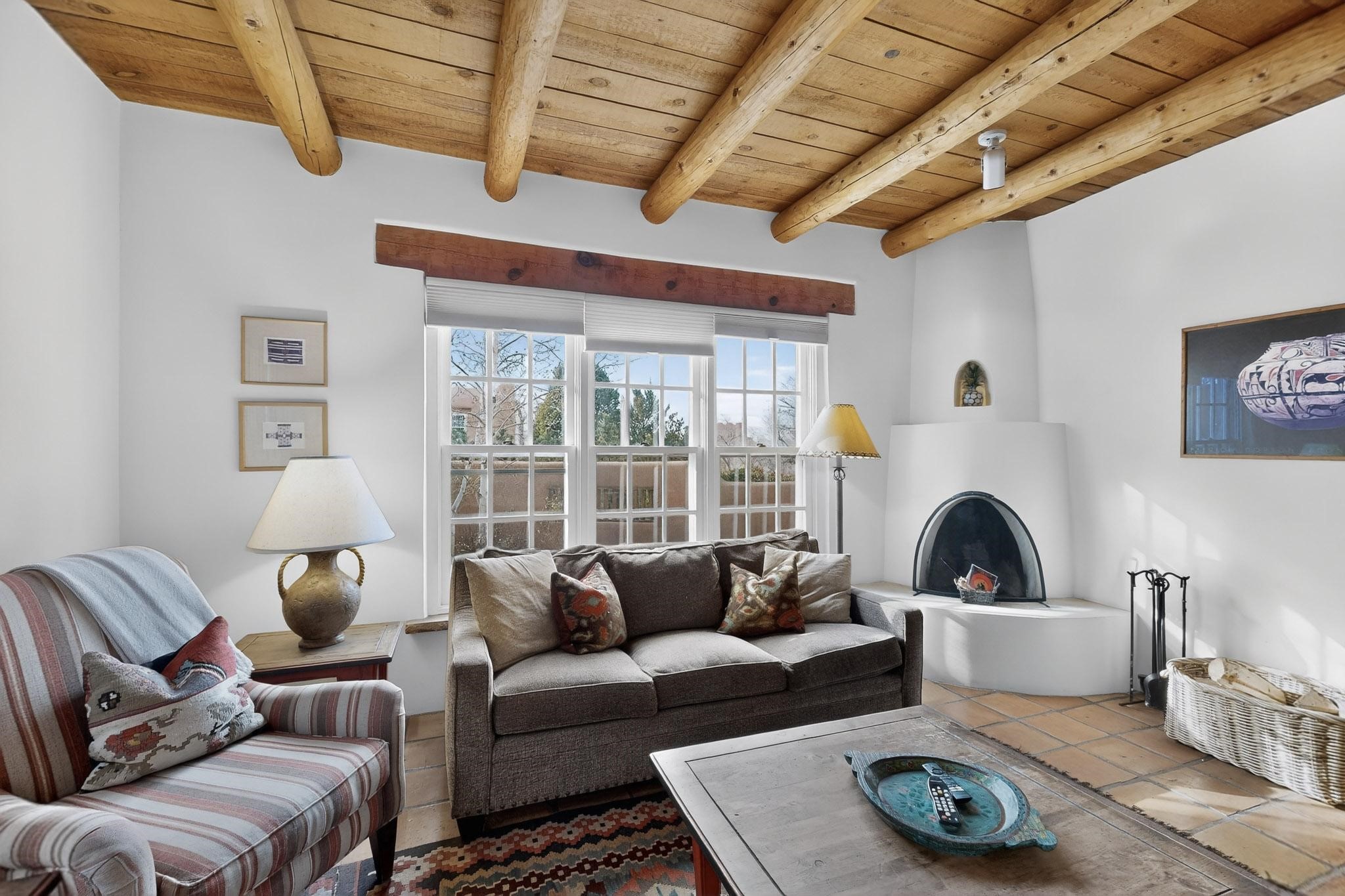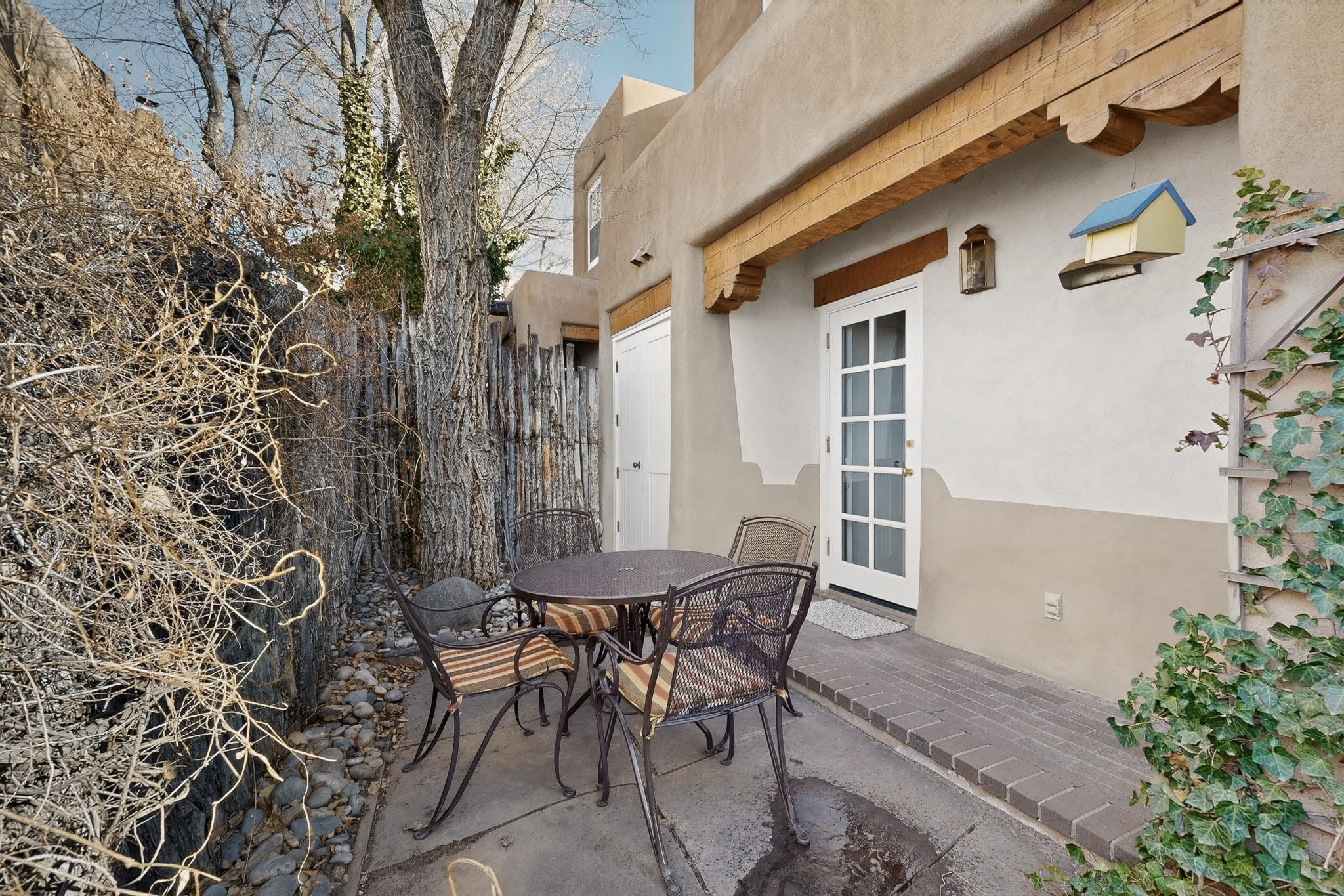 Charming condominium quarter ownership just a few blocks from the Plaza. Beautiful architectural details found in gracious old adobe home with vigas, kiva fireplaces, sculptural smooth plaster walls, hand adzed lintels above windows and doors. Tile kitchen and baths. All furnishings and maintenance, inside and out by Owners Association. Owners Association management operates established rental program.