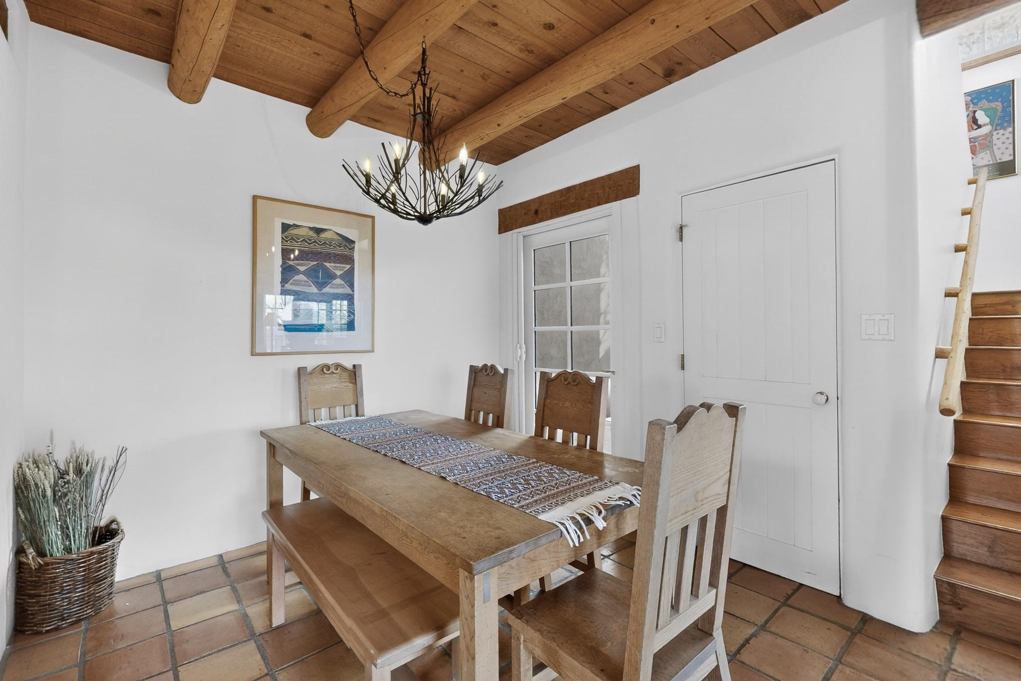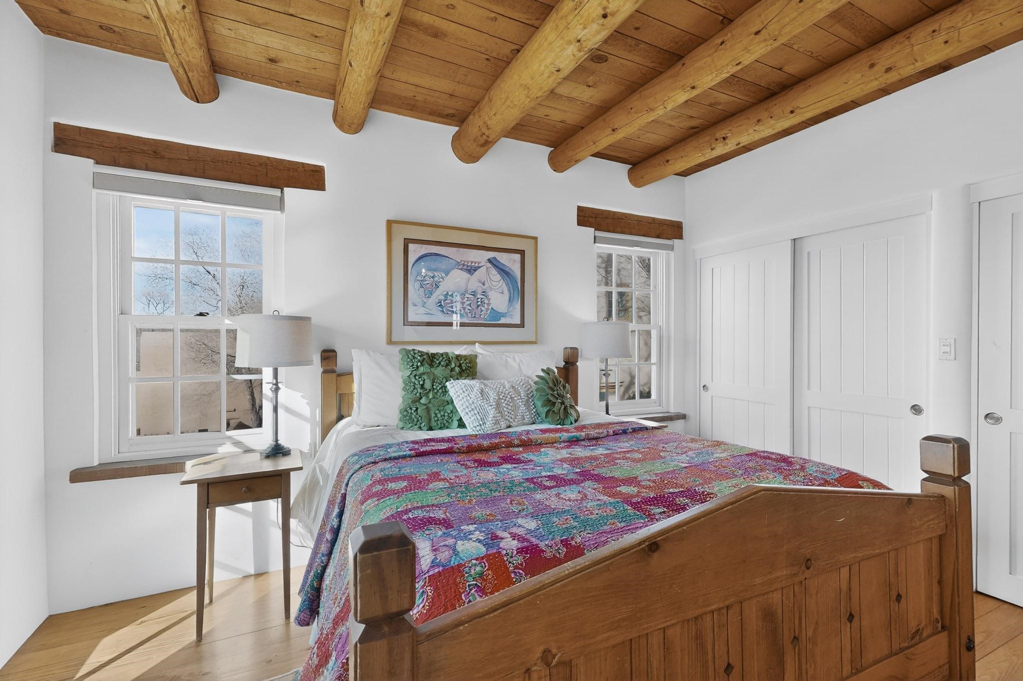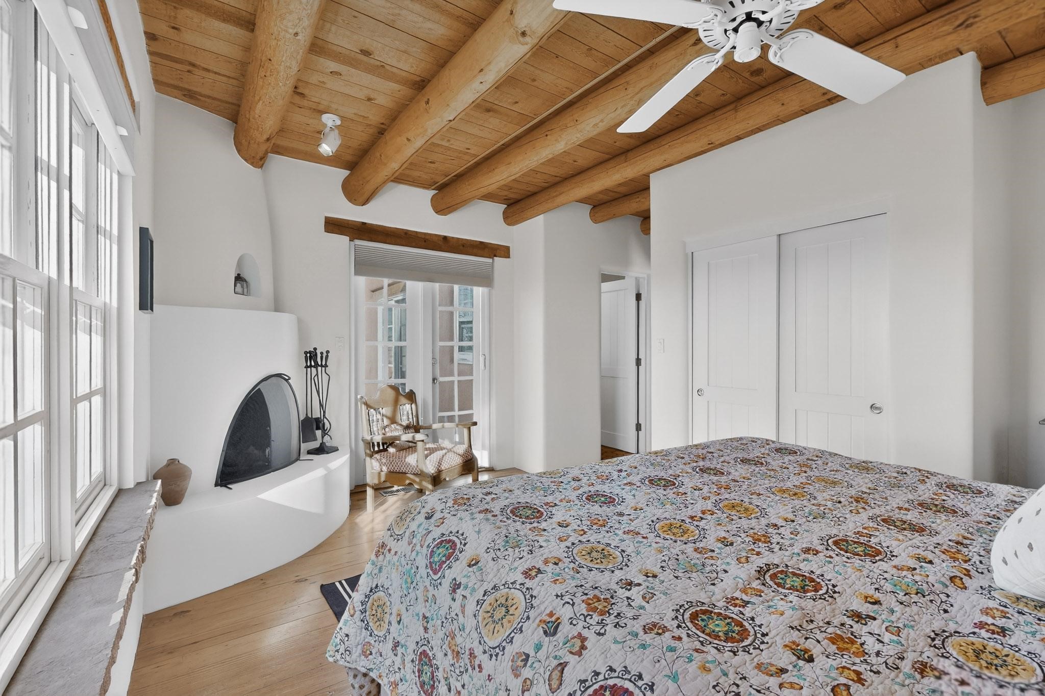 Charming condominium quarter ownership just a few blocks from the Plaza. Beautiful architectural details found in gracious old adobe home with vigas, kiva fireplaces, sculptural smooth plaster walls, hand adzed lintels above windows and doors. Tile kitchen and baths. All furnishings and maintenance, inside and out by Owners Association. Owners Association management operates established rental program.
