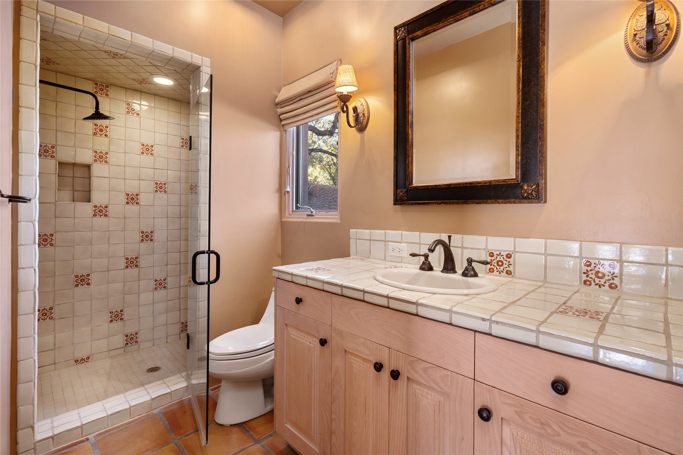 Expansive two bedroom home with guest house and studio. Exceptional views from your front porch and broad portal and large private back yard area perfect for entertaining. 230 square foot lap pool and hot tub for relaxing or entertaining. The main house has a grand foyer ready for art work with a back door showcasing the rear portal and back yard. The large kitchen has plenty of cabinet space, a butlers pantry, quartz counter tops, Wolf 5 burner stove, Cove Dishwasher, Subzero refrigerator, and a cozy banco/breakfast nook offset by a kiva fire place. Adjacent to the kitchen is a dining room that can easily seat 8 with nice views into the back courtyard and front yard. Down two steps past the office and large great room with fireplace to the massive main suite, full bathroom, soaking tub, two walk-in closets, sitting areas and easy access to the 8' hot tub. Guest house has a full kitchen and full bath. Detached studio ready for your endeavors. 2025 roof update with 5 year limited warranty on labor and materials. Must see this gem. Set up a showing today.