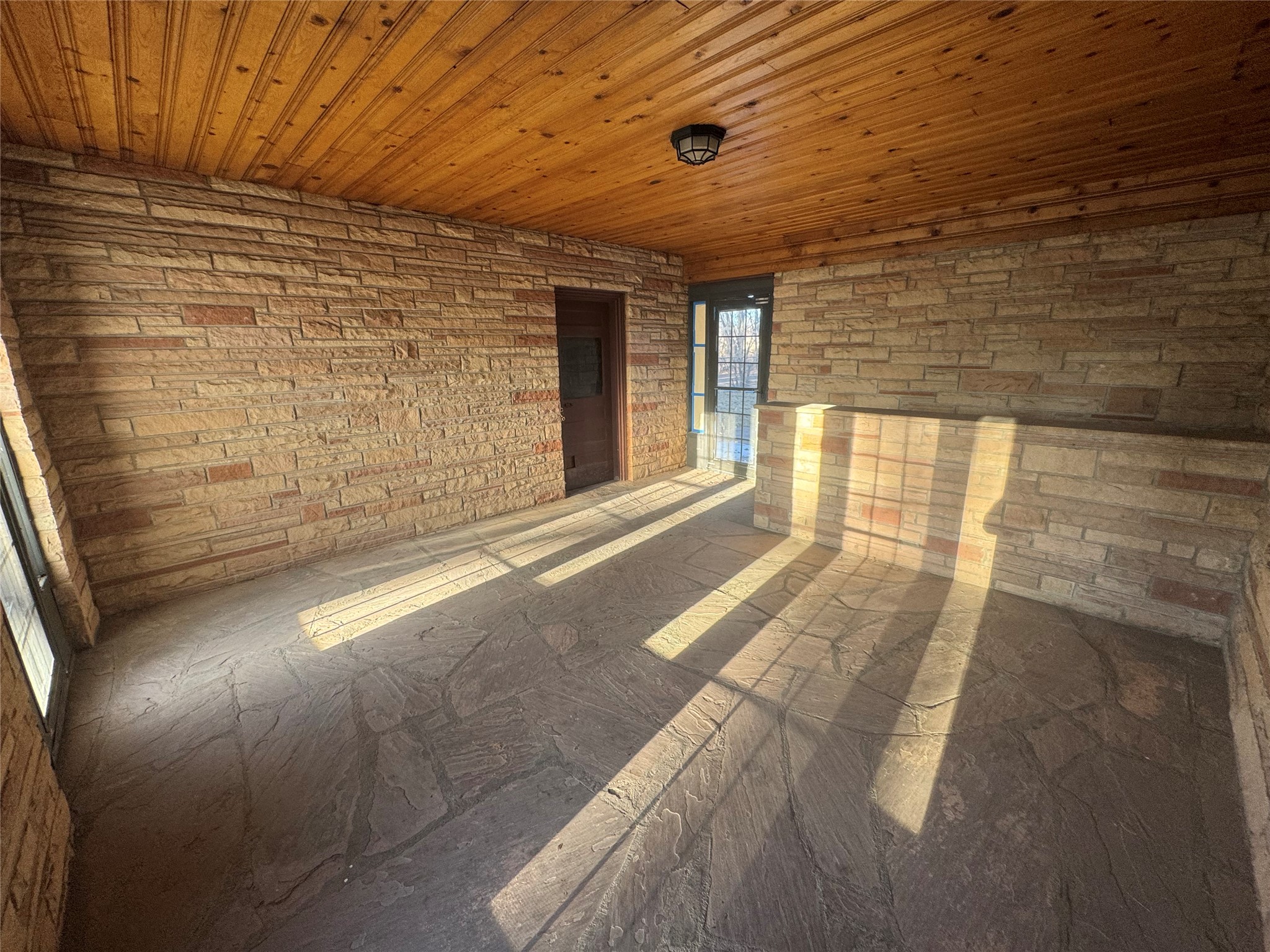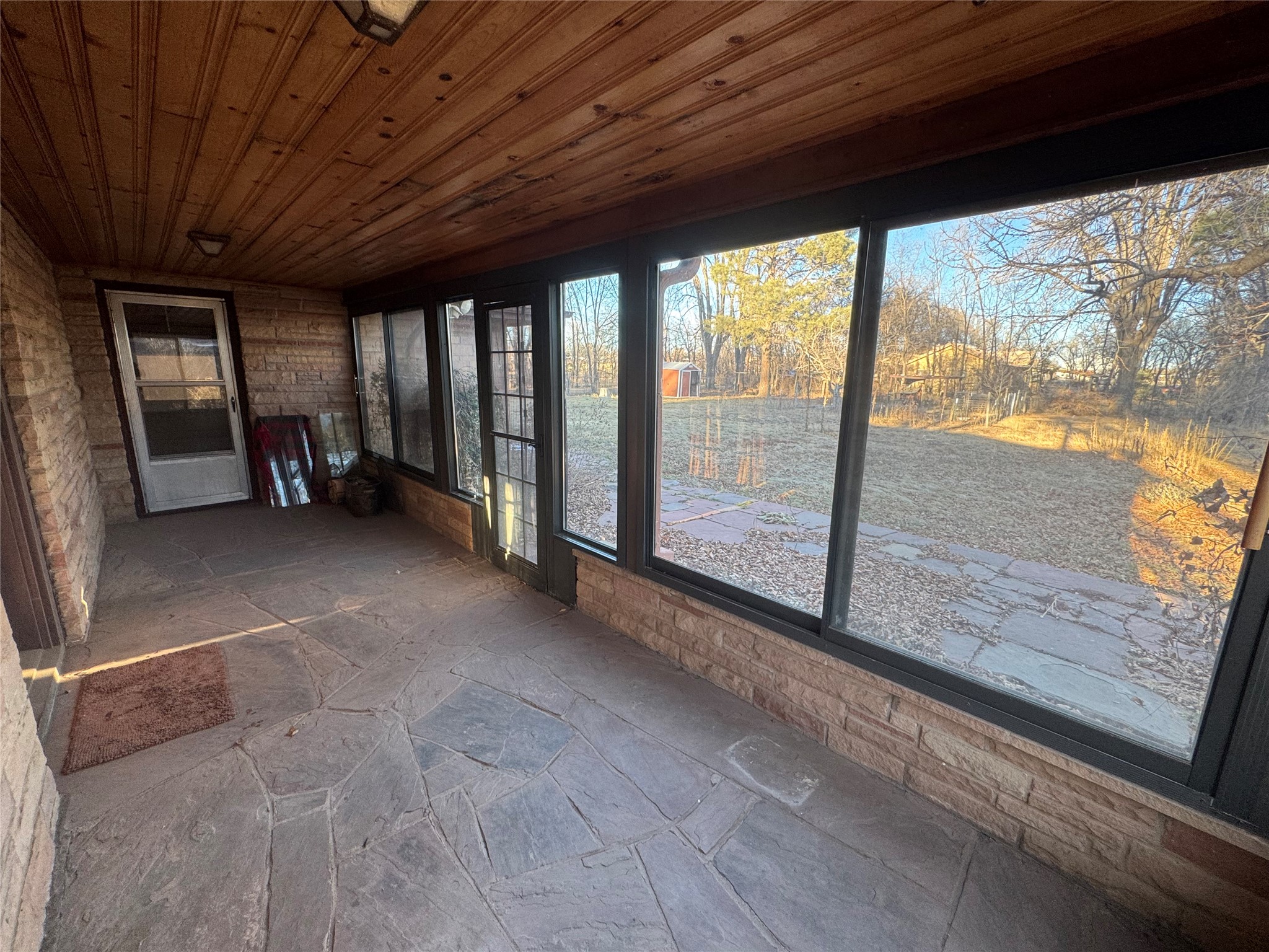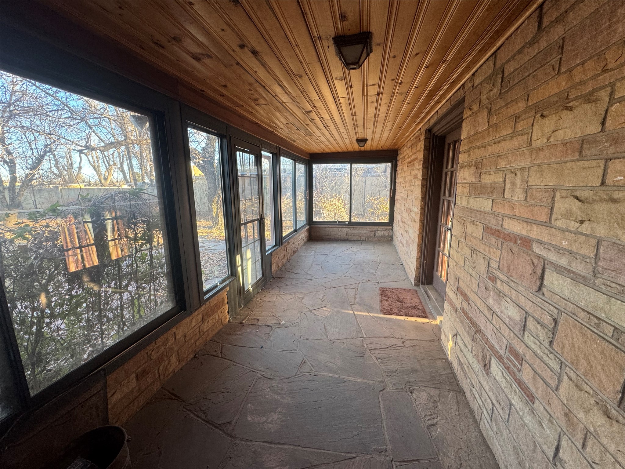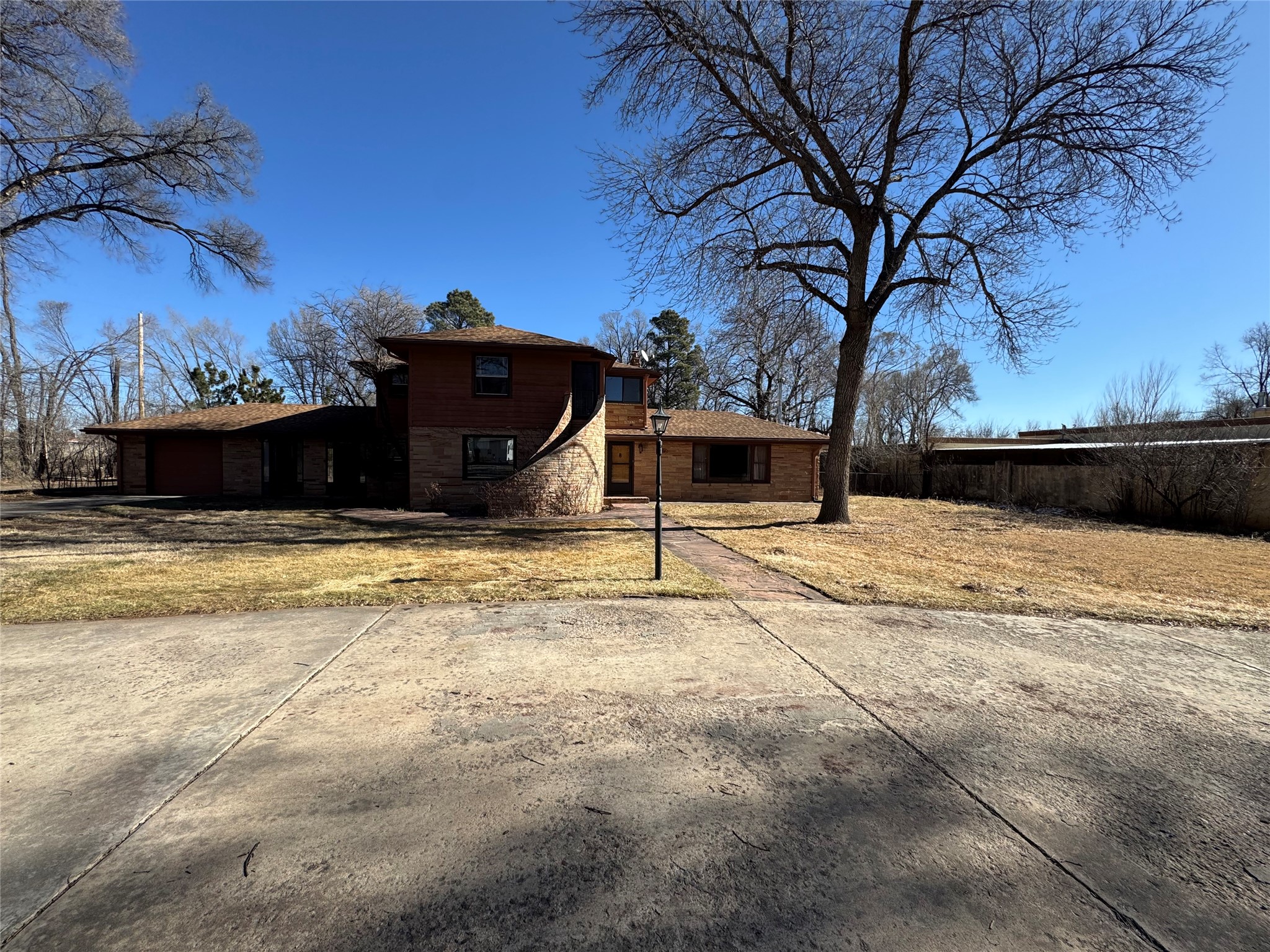 Welcome to this mid-century home with timeless architecture and comfort. Exterior is stone with accents of brick. Large front and back yard with big mature trees and semicircle entry and exit driveway. Inviting and spacious living room with fireplace, wall bookshelf and large picture window facing the west. From living room enter into a green or sun room facing the east and backyard. A dining room sized to host gatherings or a growing family, near a lovely kitchen. Four large bedrooms with great closet space in each. Three bedrooms are upstairs with two bedrooms sharing an enclosed window patio with door to stunning outdoor spiral stone and concrete staircase to the front yard. 2 bathrooms, one on main floor and one upstairs. A large breezeway room with beautiful wood ceilings attached to a one car garage. Well taken care of hardwood floors throughout majority of the home, large windows in each room allowing natural light from east to west. Basement allows for great storage, den or entertainment room. This house sits in an established and quiet neighborhood. City water, well water on property and surface water rights. Come take a look!